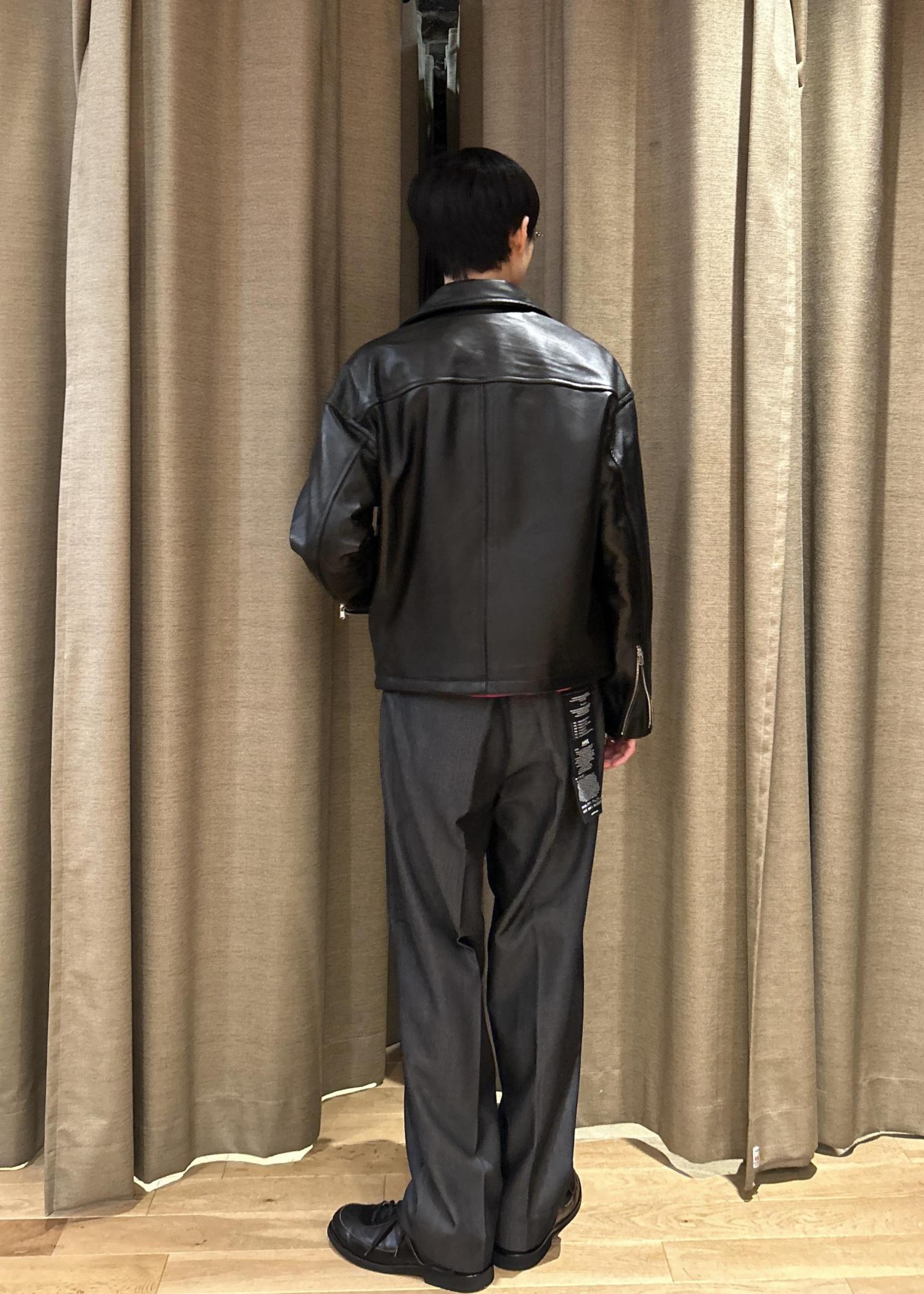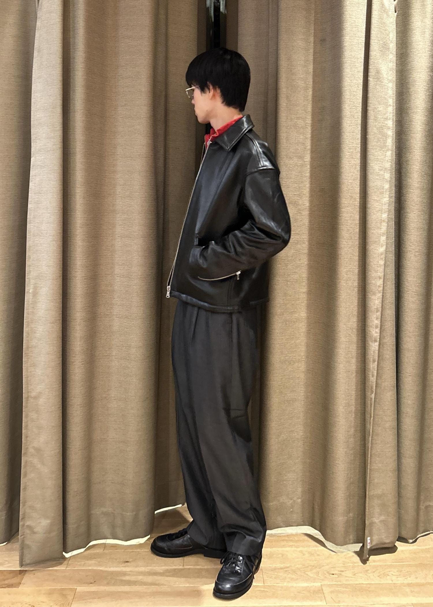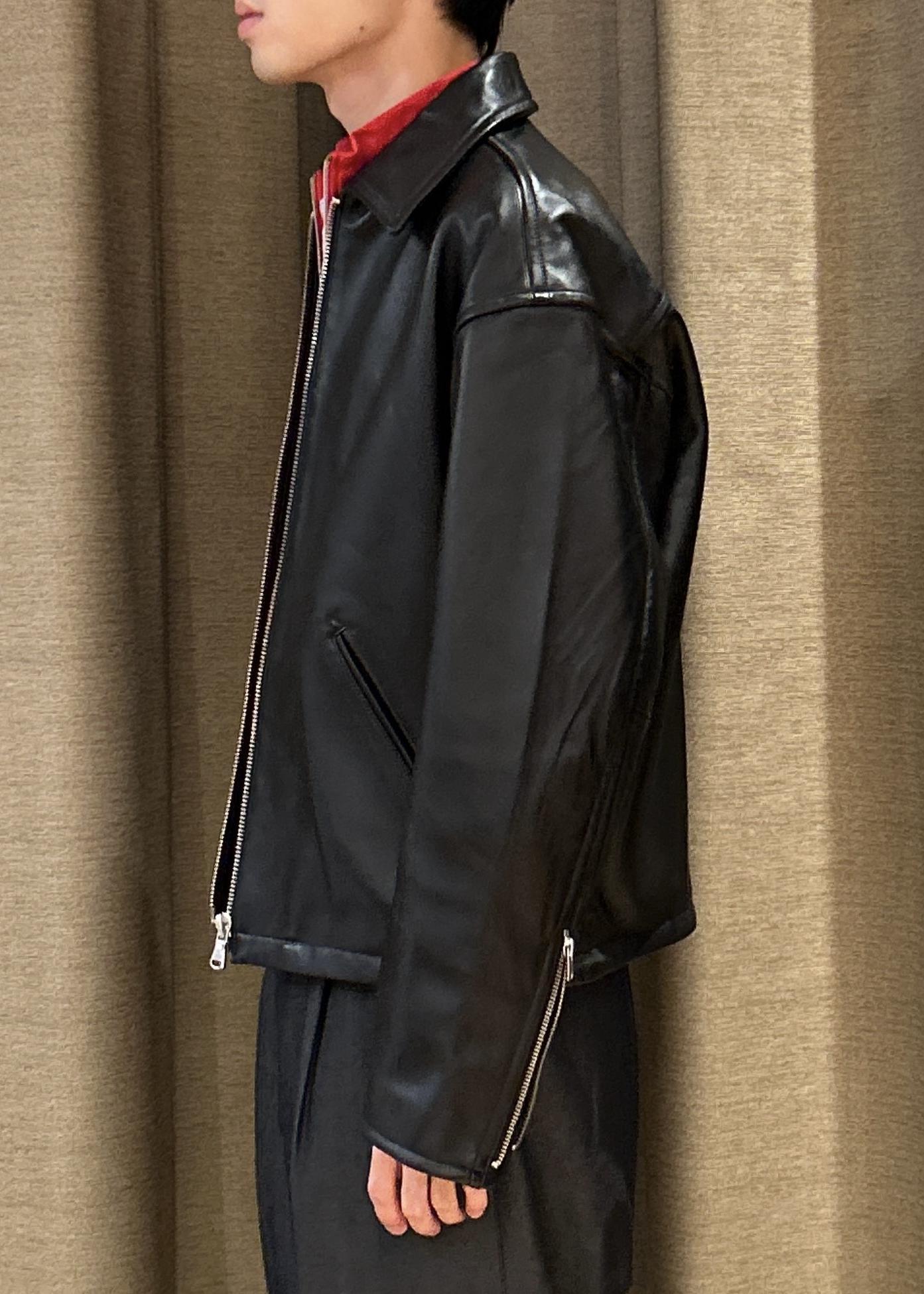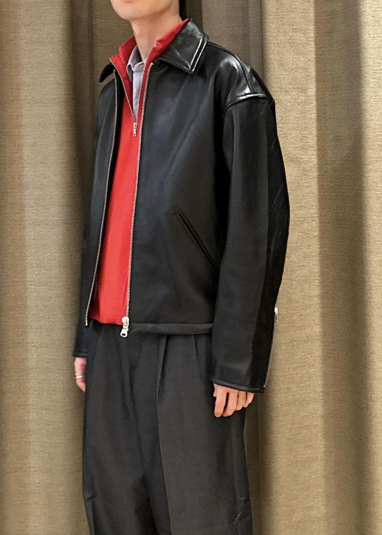 しっかりと重厚感ありながらも滑らかさのあるナッパレザー、ゆったりしたシルエットが相まってハード過ぎない印象のレザージャケットです。