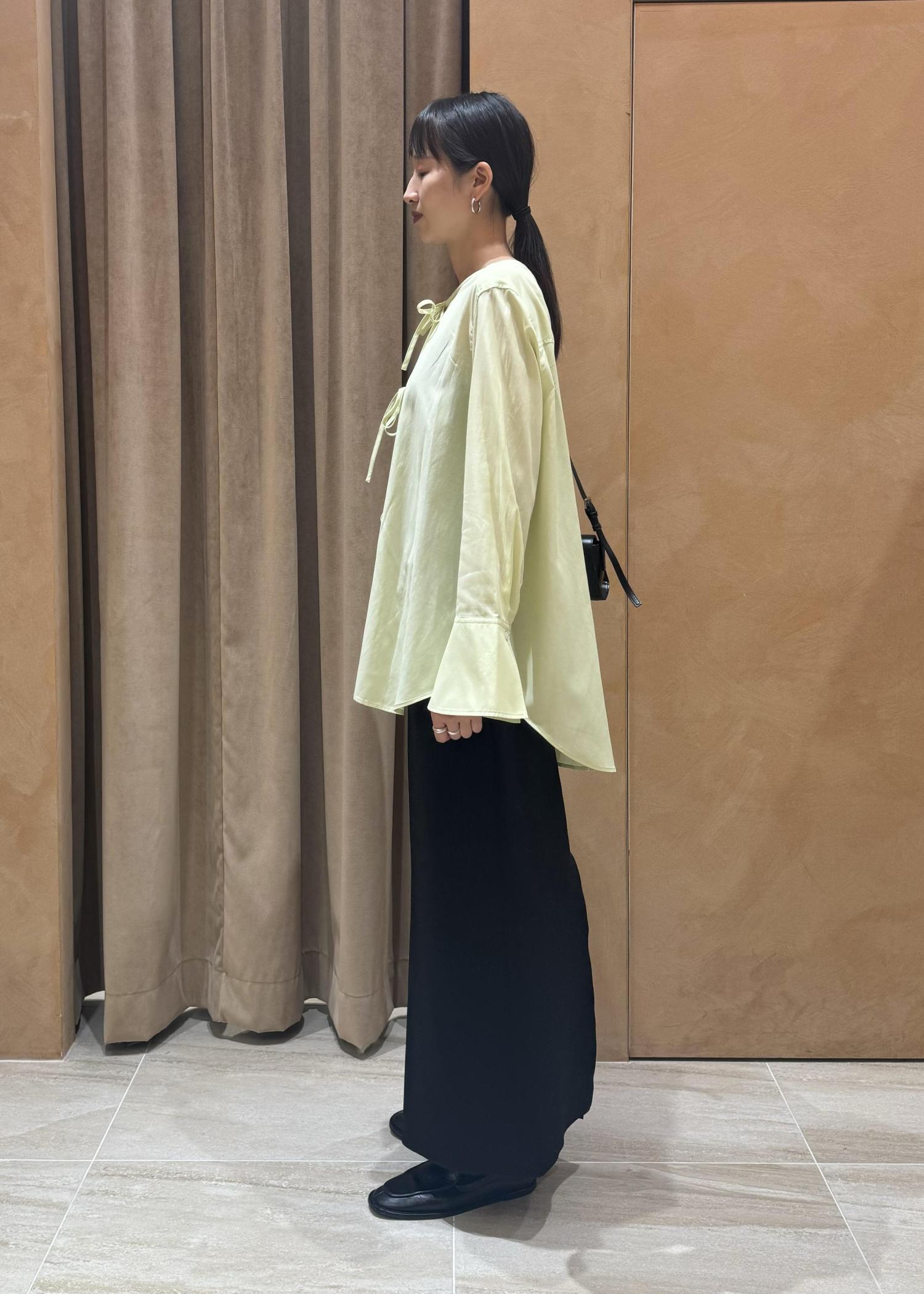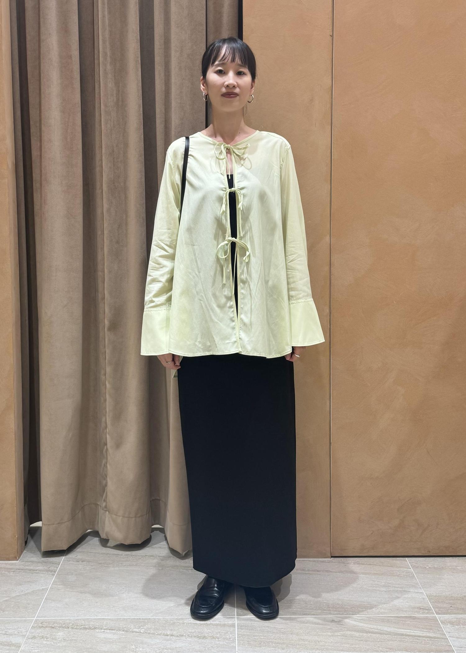 こなれ感漂う華奢なリボンで大人のフェミニンさをプラスしたブラウスのスタイリングです。