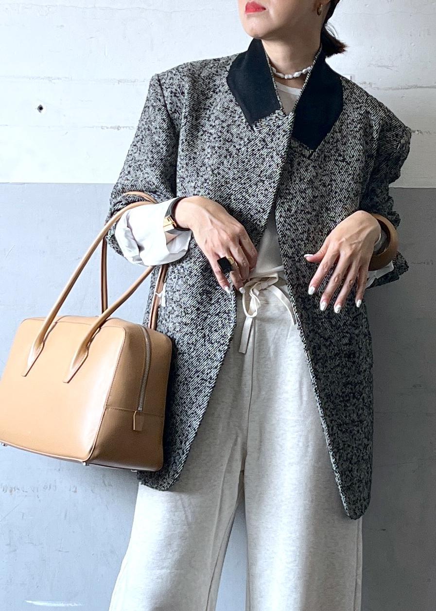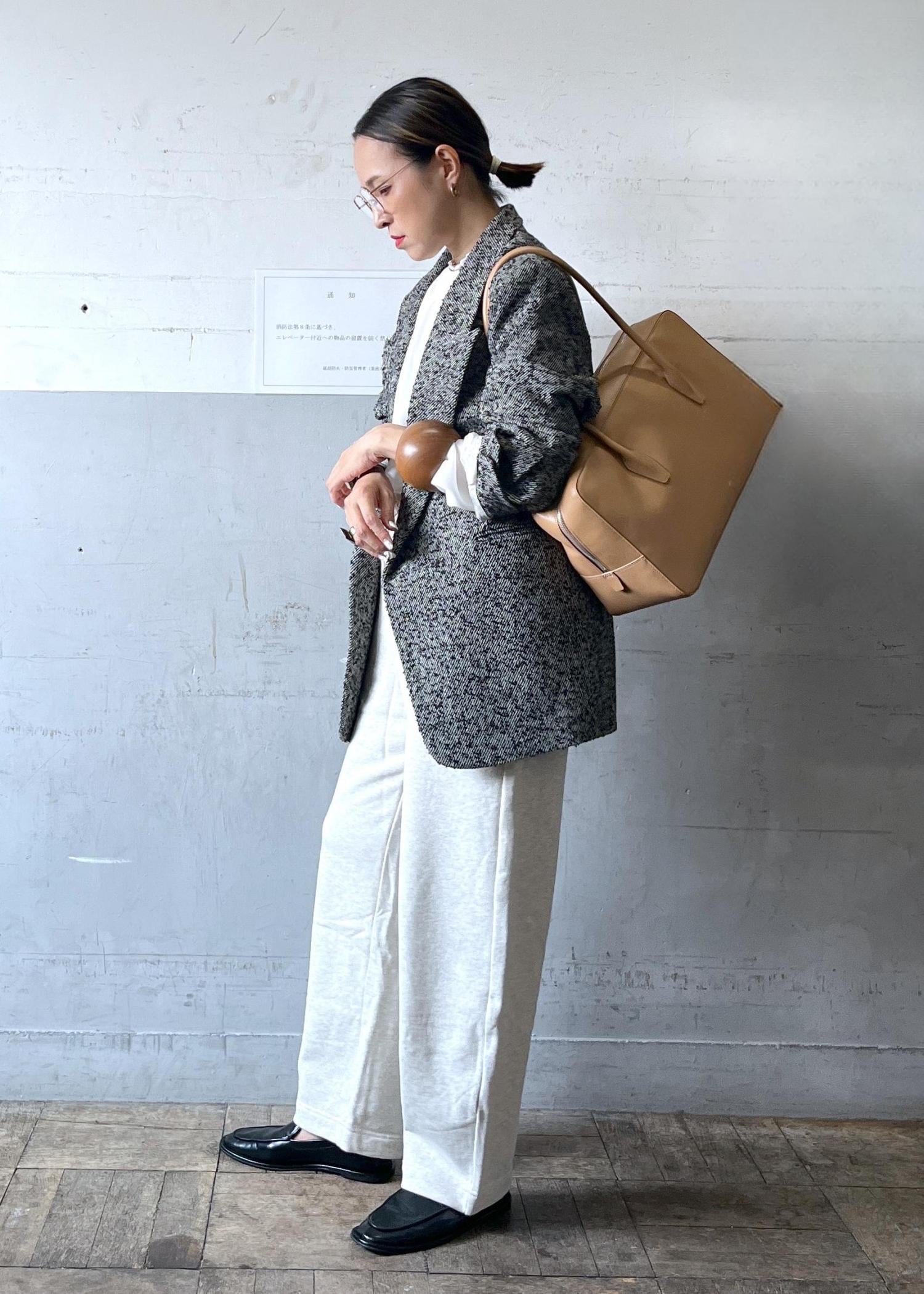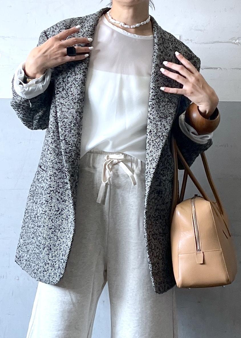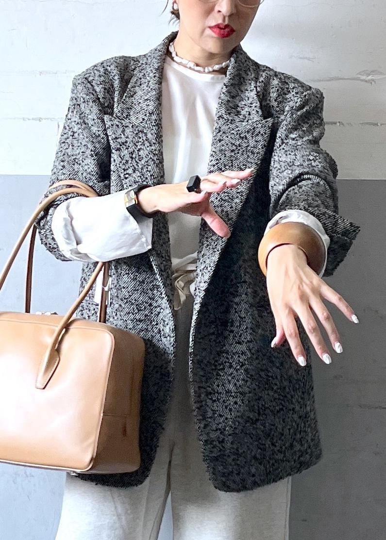 艶感ブラウスとツイードのオーバーサイズジャケットを羽織って、リラックス感と大人っぽさのいいとこ取り✨