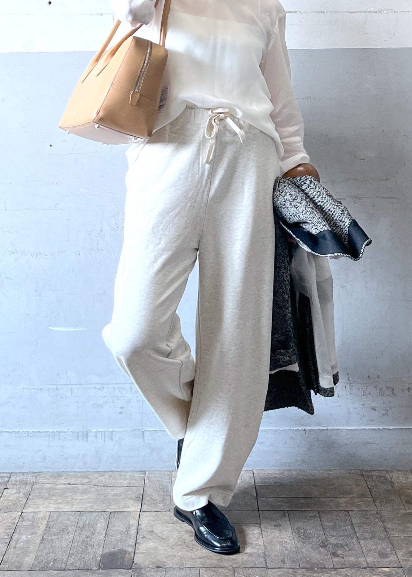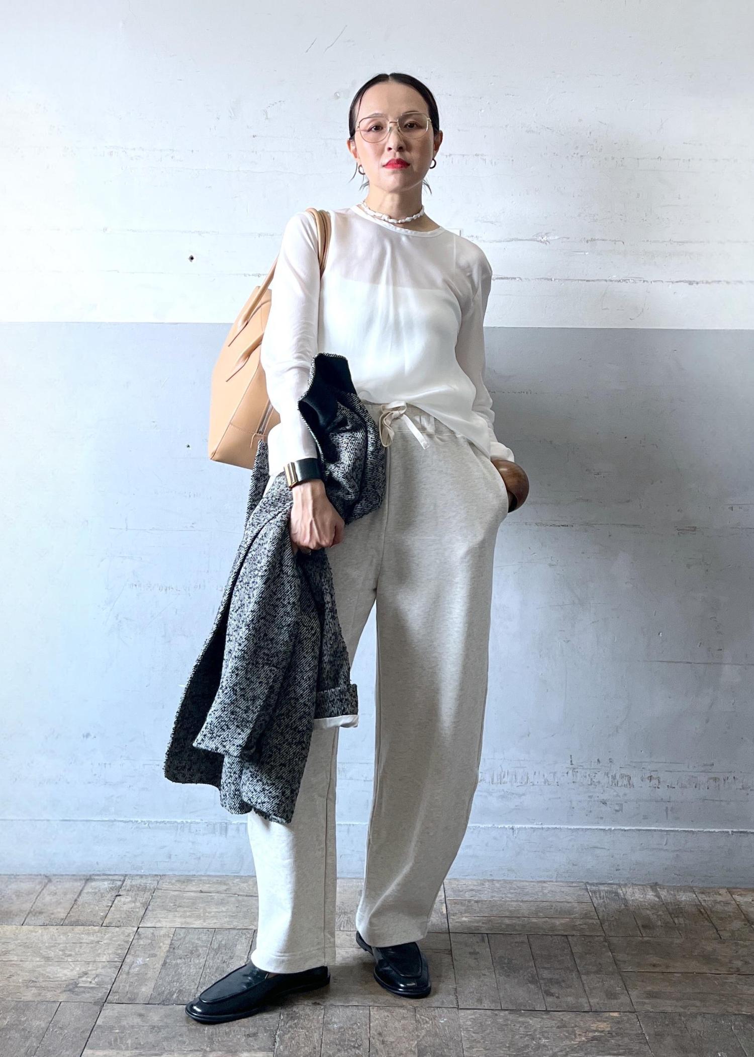 スウェットパンツ×ローファーで程よくメンズライクに。