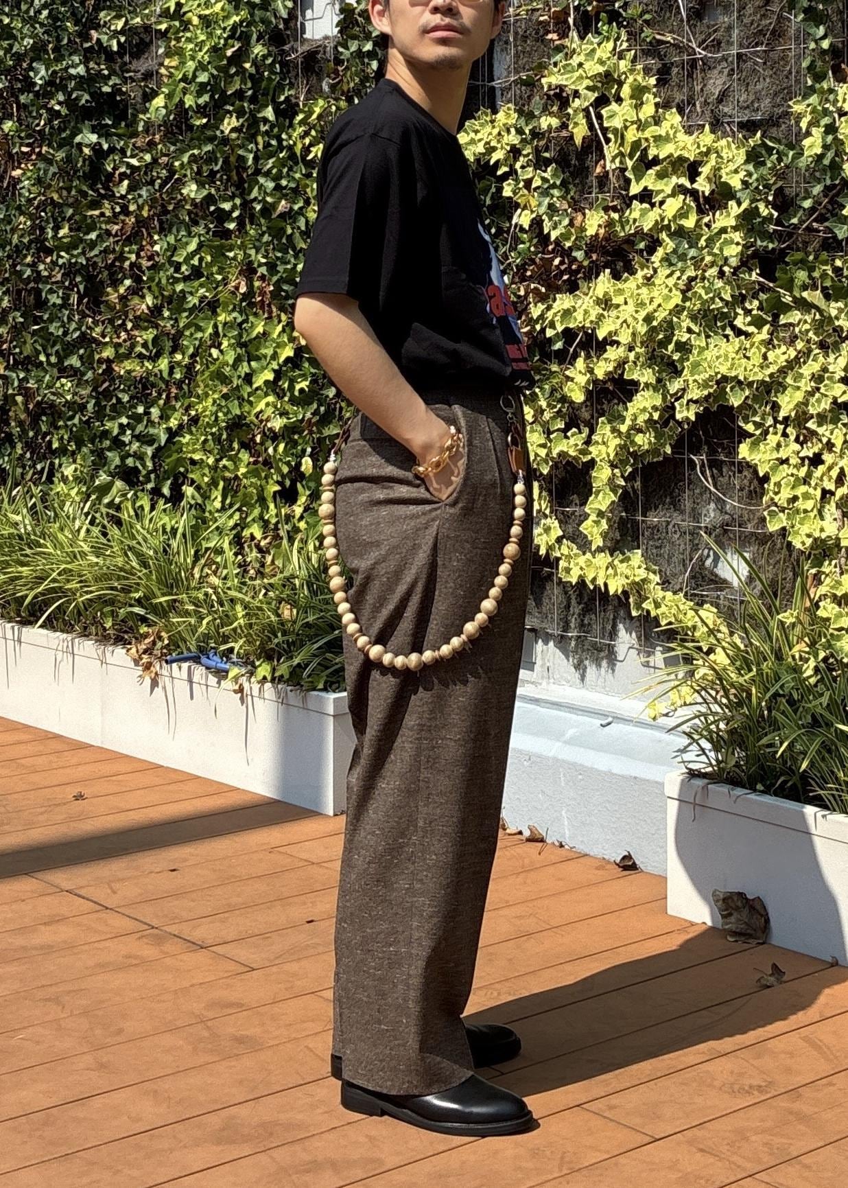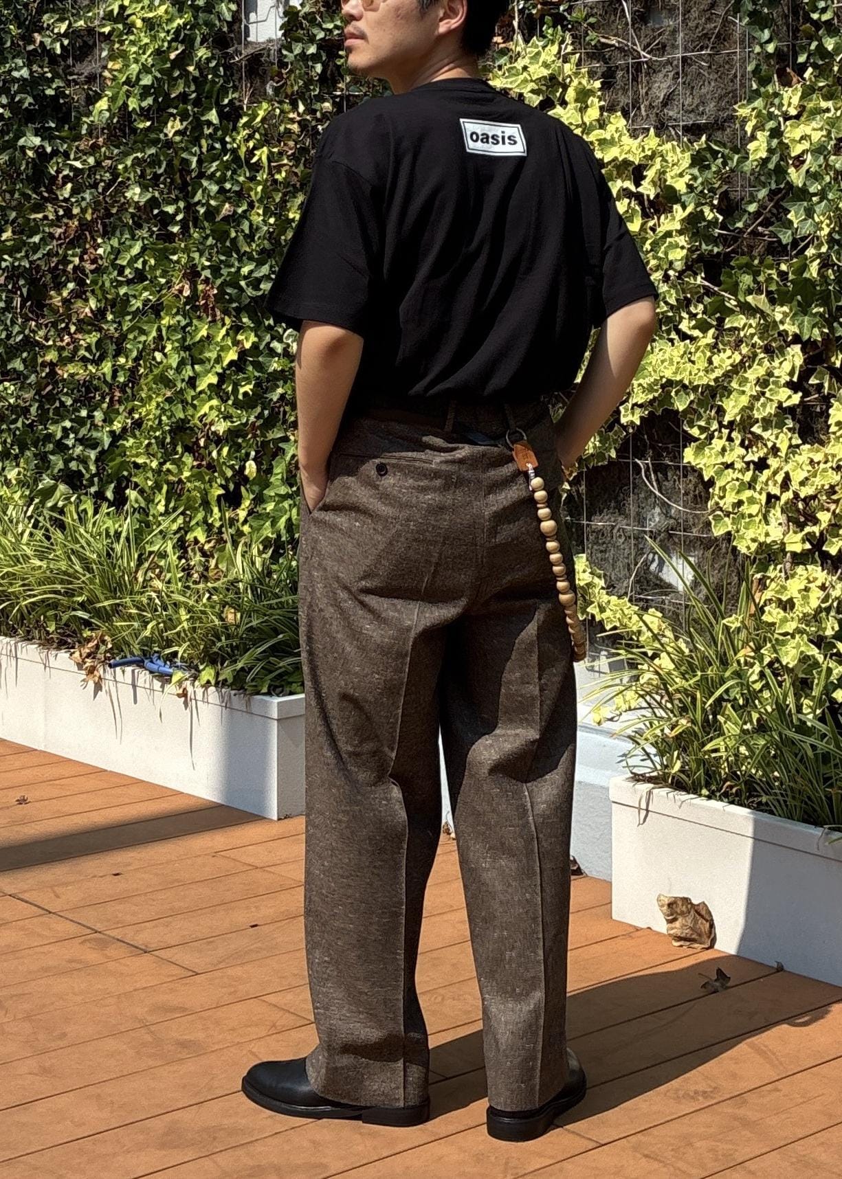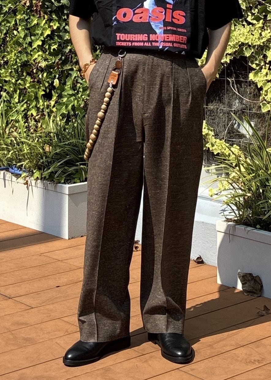 ADAM ET ROPÉ HOMMEハードクロス 2プリーツ スラックスダークブラウン系 / M¥35,200レビューウエスト周りは大きすぎず、僕の体型でMでベルトは無くても腰できちんと止まるくらいのサイズ感でした。生地感とシルエットがとにかく美しく、履くだけでスタイリングの主役になるようなパンツです。