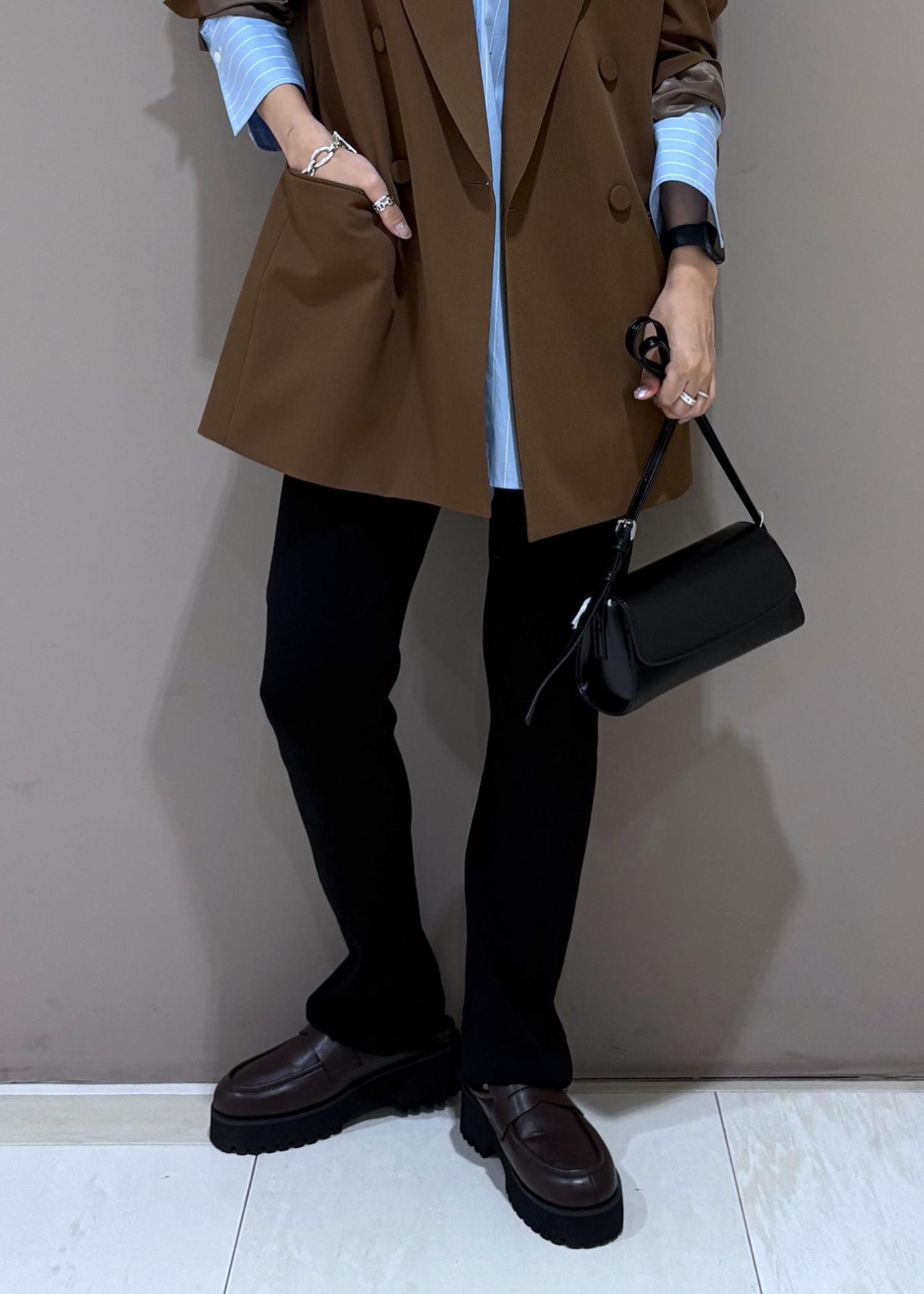 ほっこりしがちなブラウンにブルーを持ってくれば、クリーンな印象も残しつつ着用できますね!