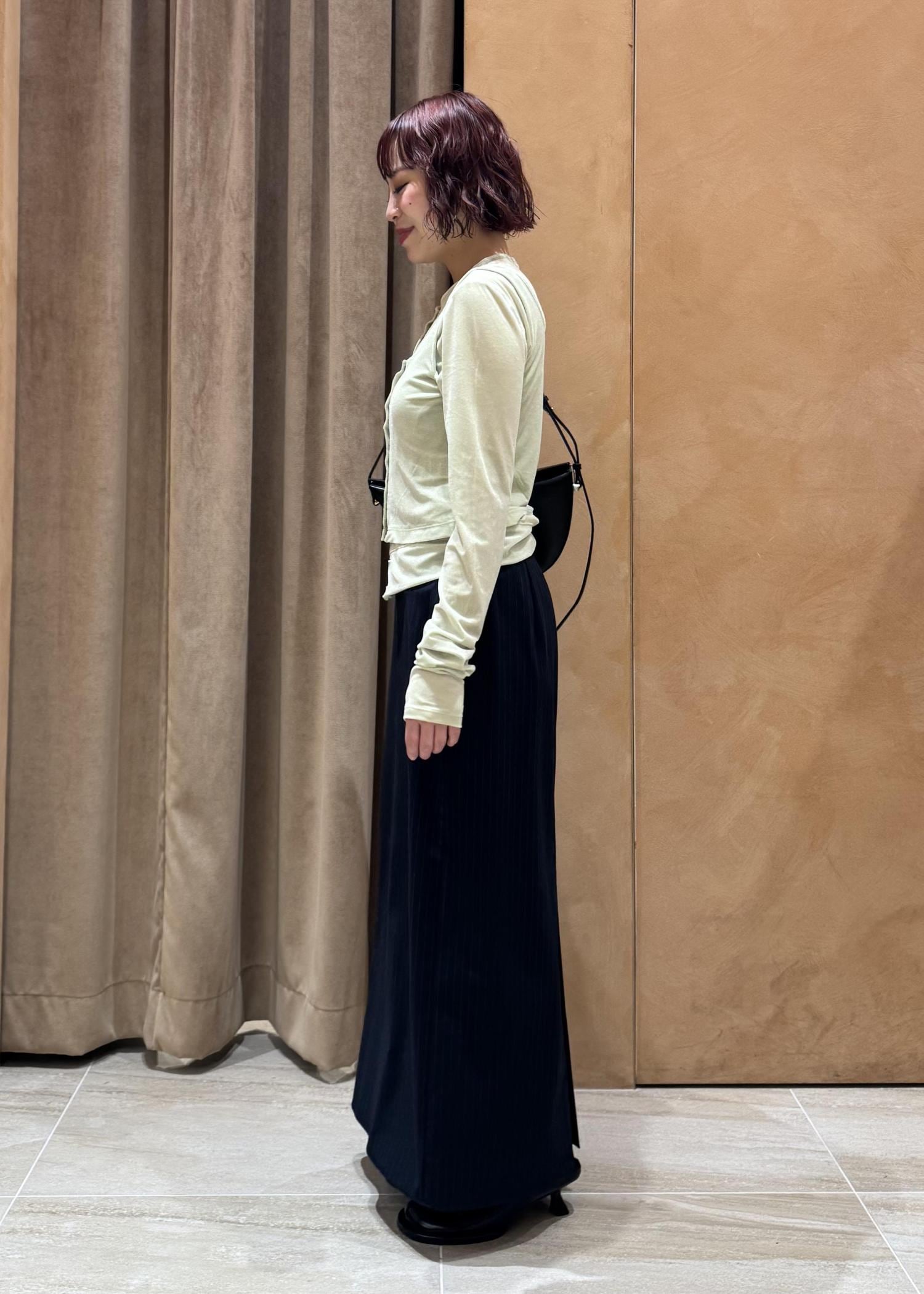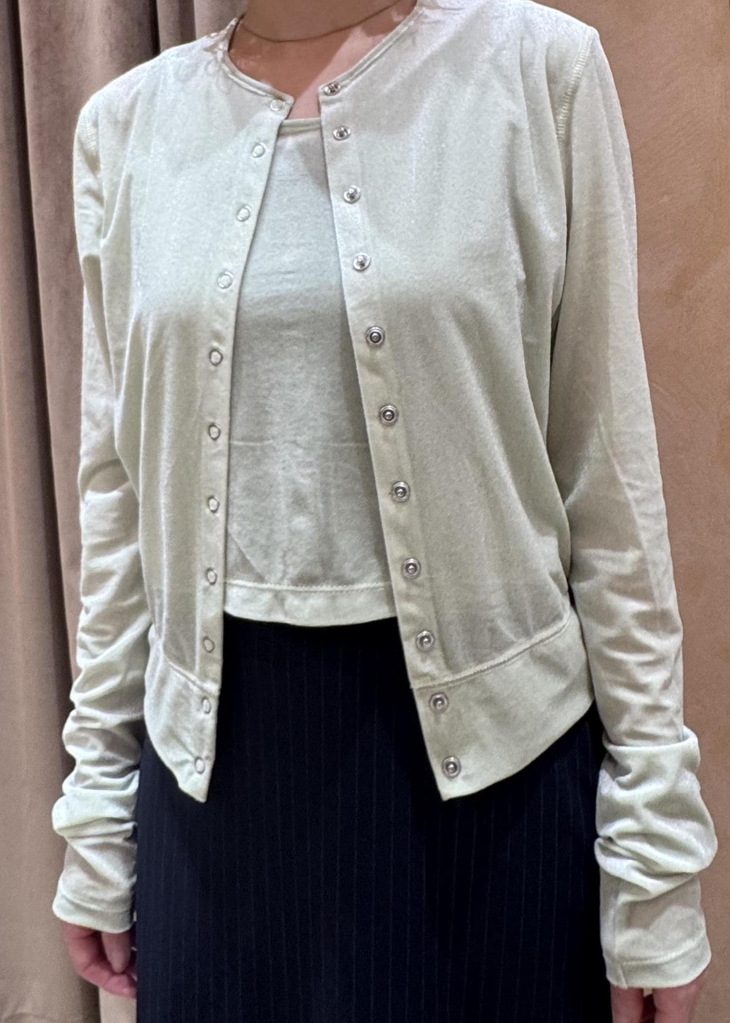 ADAM ET ROPÉ FEMMEマルチWAYシアートリコットベロアカーディガンライトグリーン / F¥17,600レビュー前後2WAYで着用でき、ベロアの光沢感が高級感も演出してくれます⭐︎