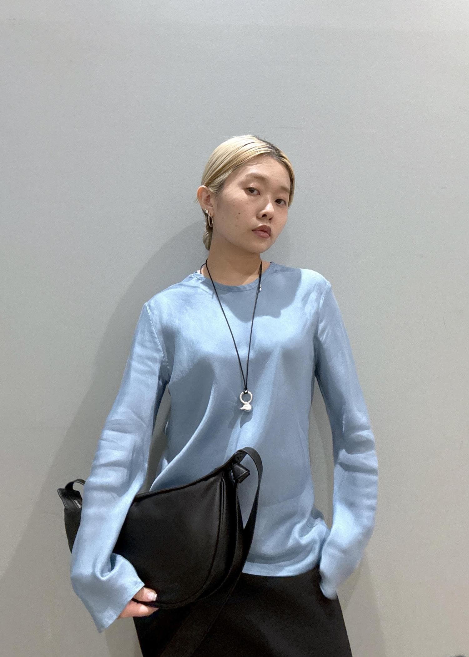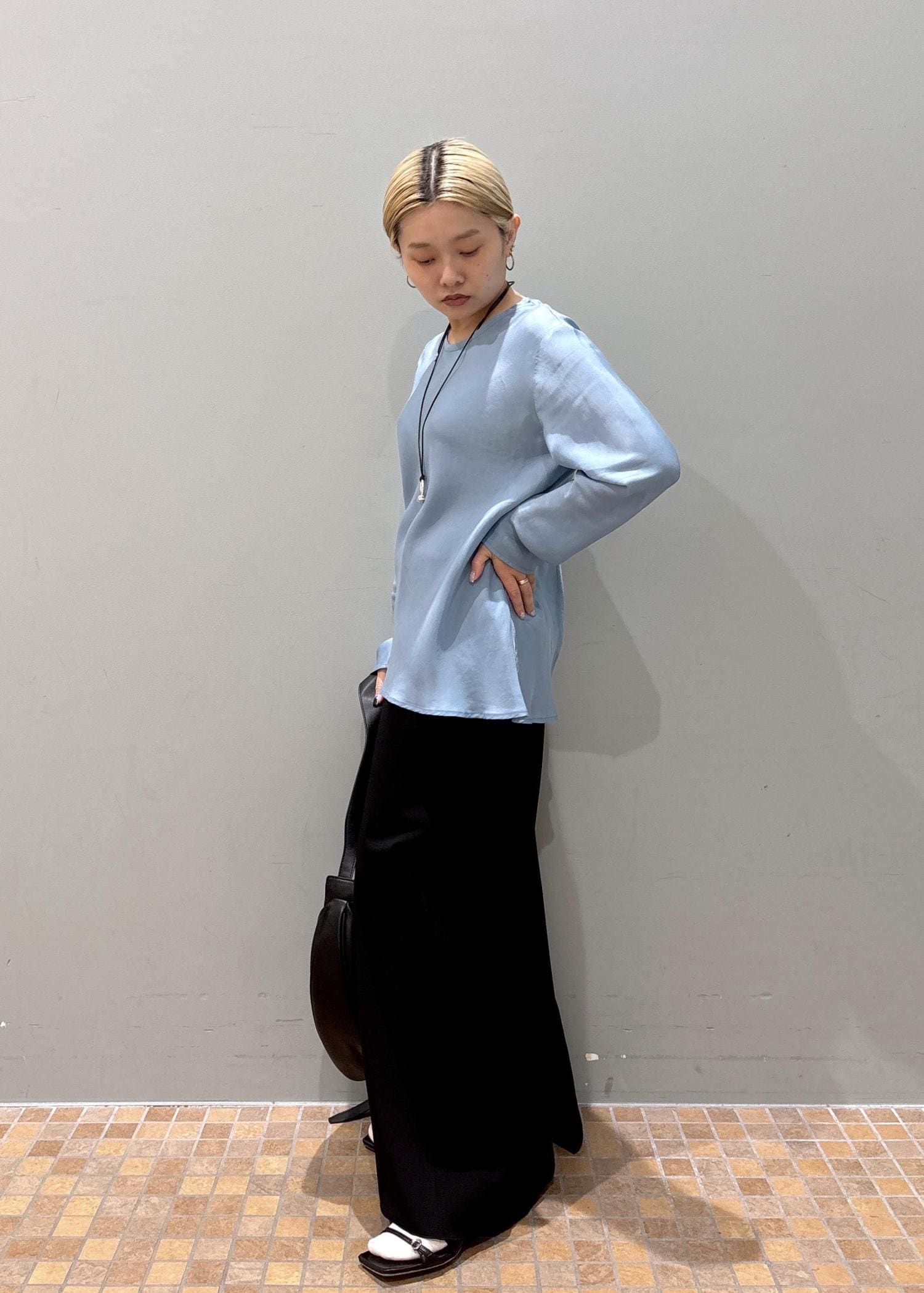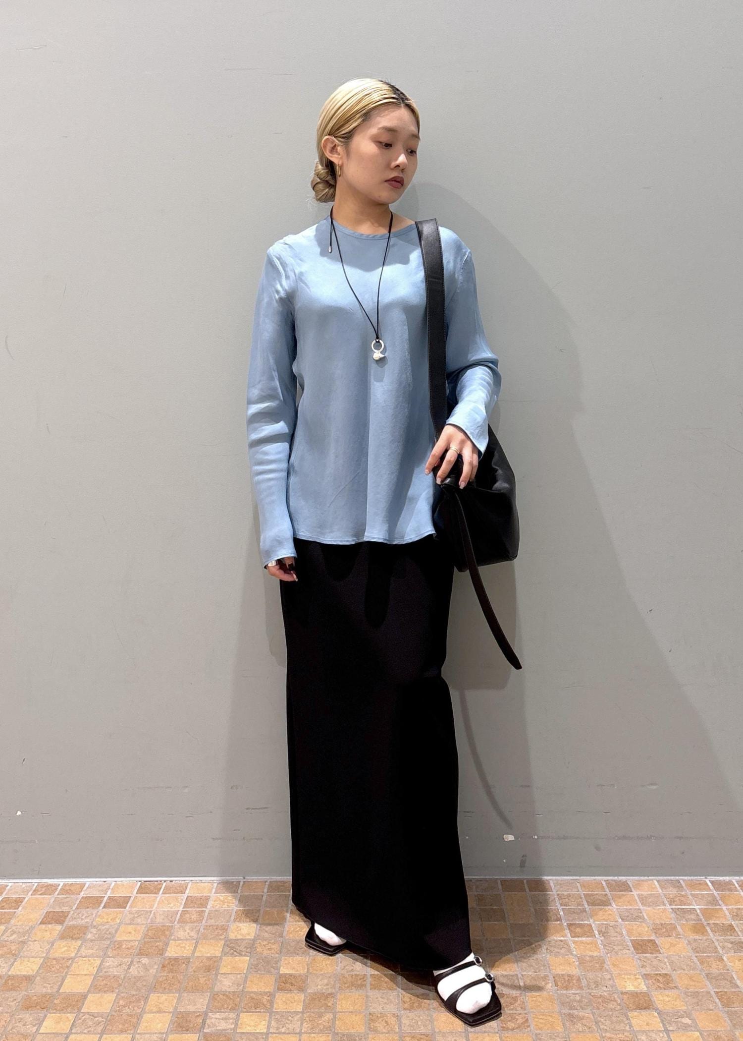 EMOELLE【EMOELLE】ウォッシャブルキュプラブラウスサックス / F¥19,800レビュードロップショルダーではないので、小柄な方・フリーサイズが合わない方にも合いやすいサイズ感です。ドレープが綺麗なとろみ素材で、Tシャツとブラウスのいいとこ取りを叶えてくれます。