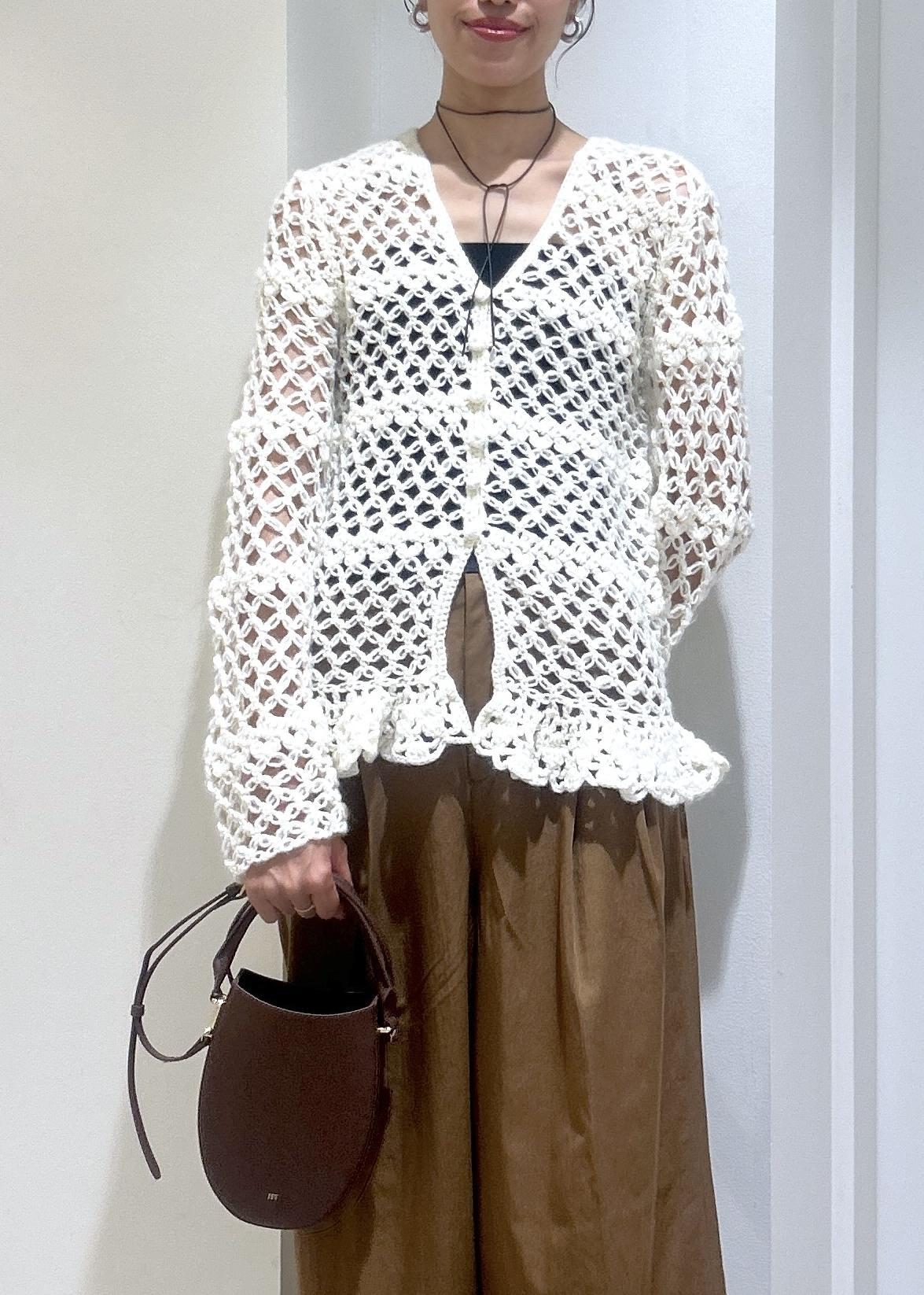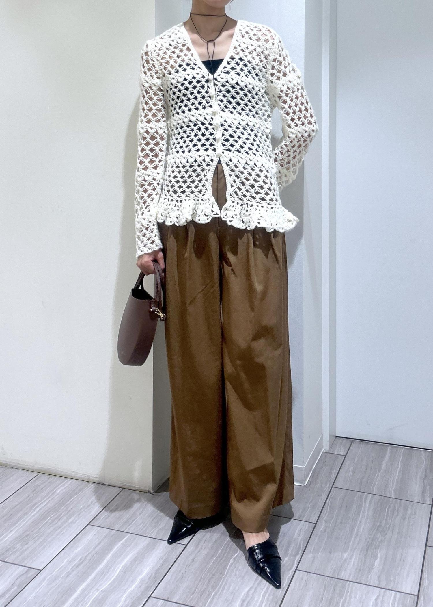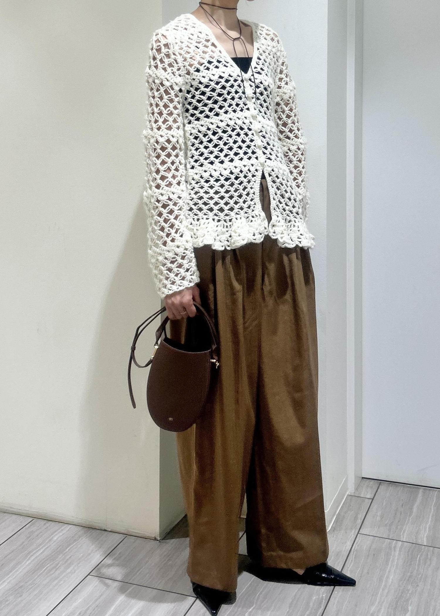クロシェ編みのカーディガンを主役に、リラックス感のあるワイドパンツを合わせて大人っぽくスタイリングしました。