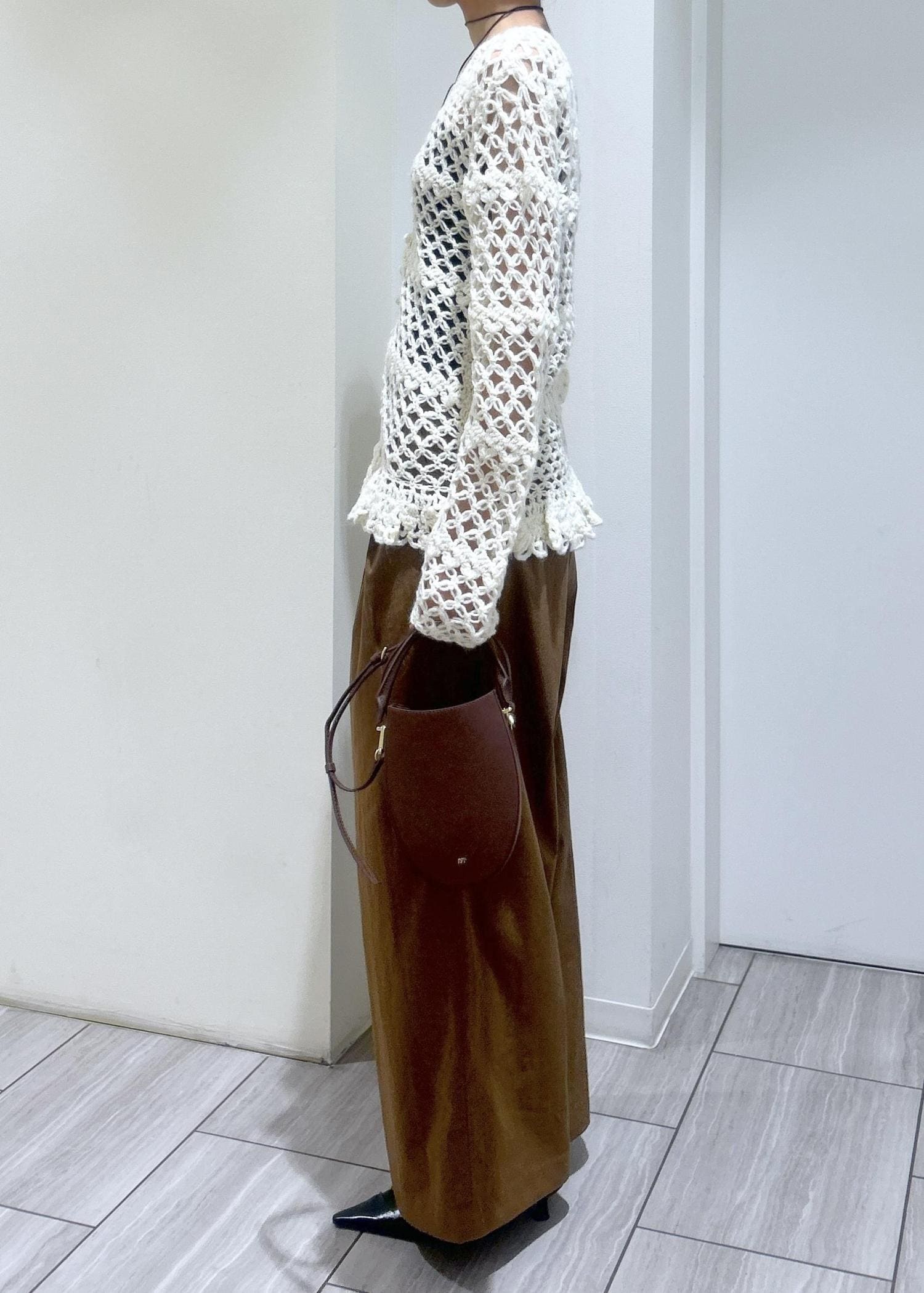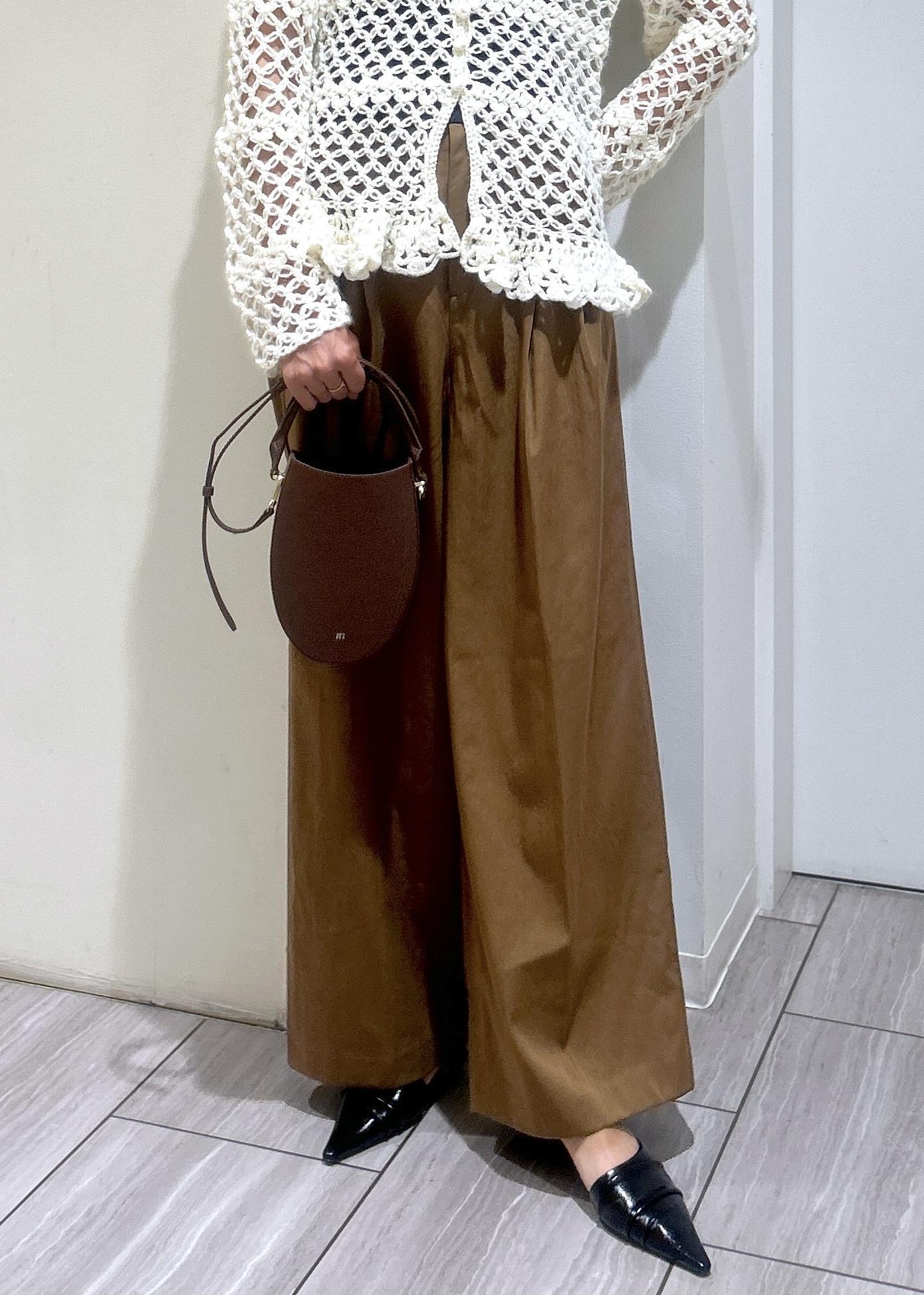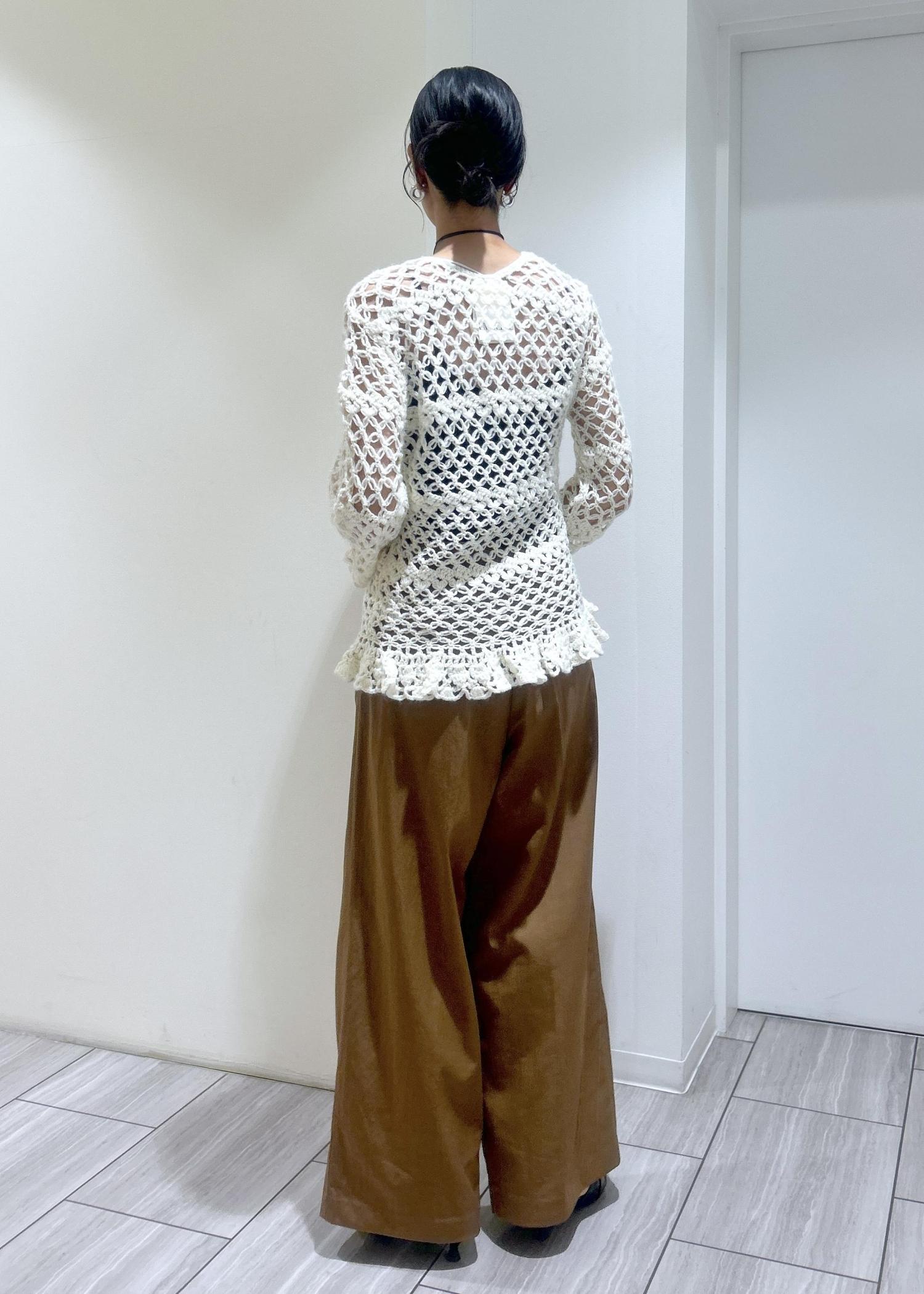 クロシェ編みのカーディガンを主役に、リラックス感のあるワイドパンツを合わせて大人っぽくスタイリングしました。