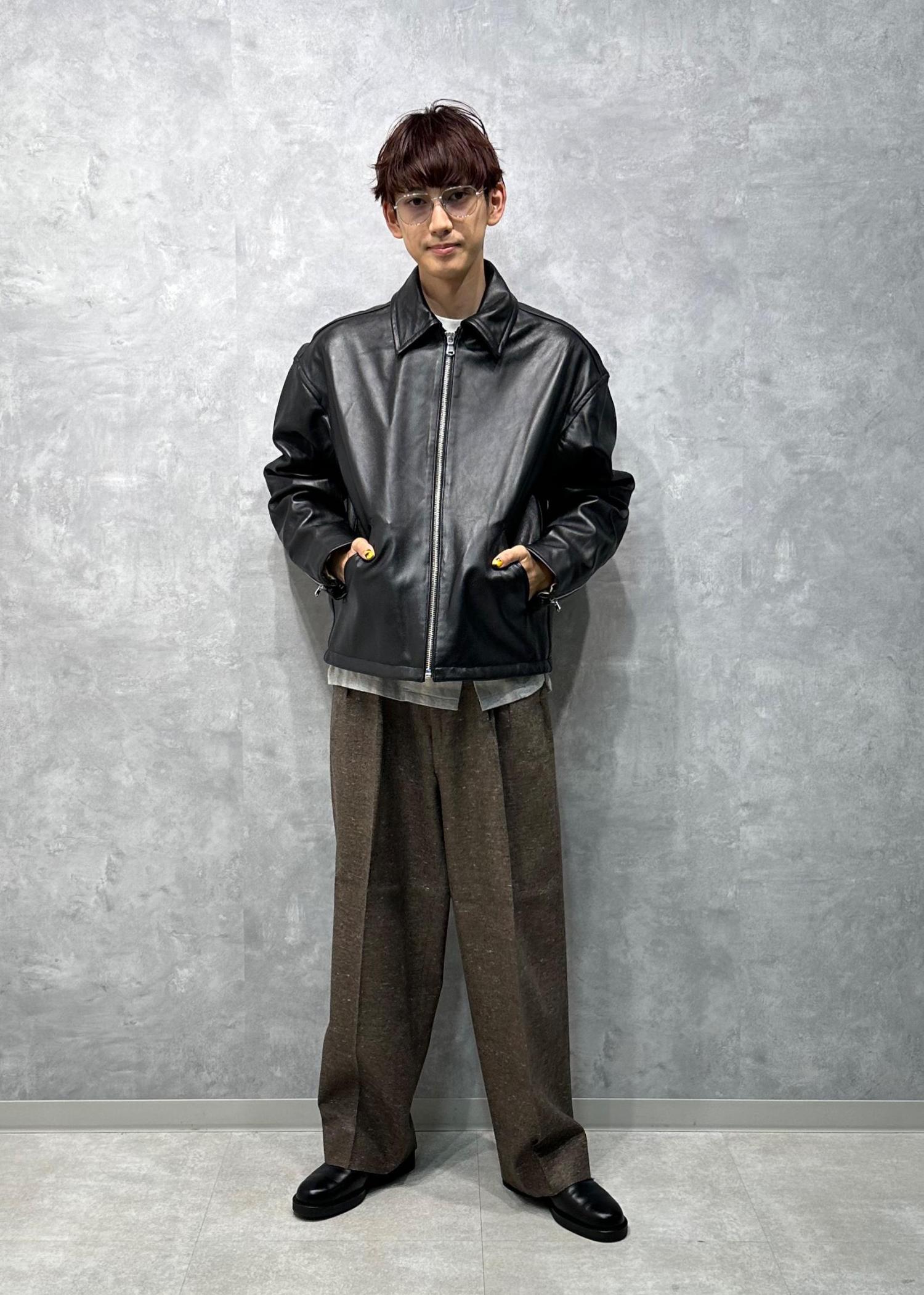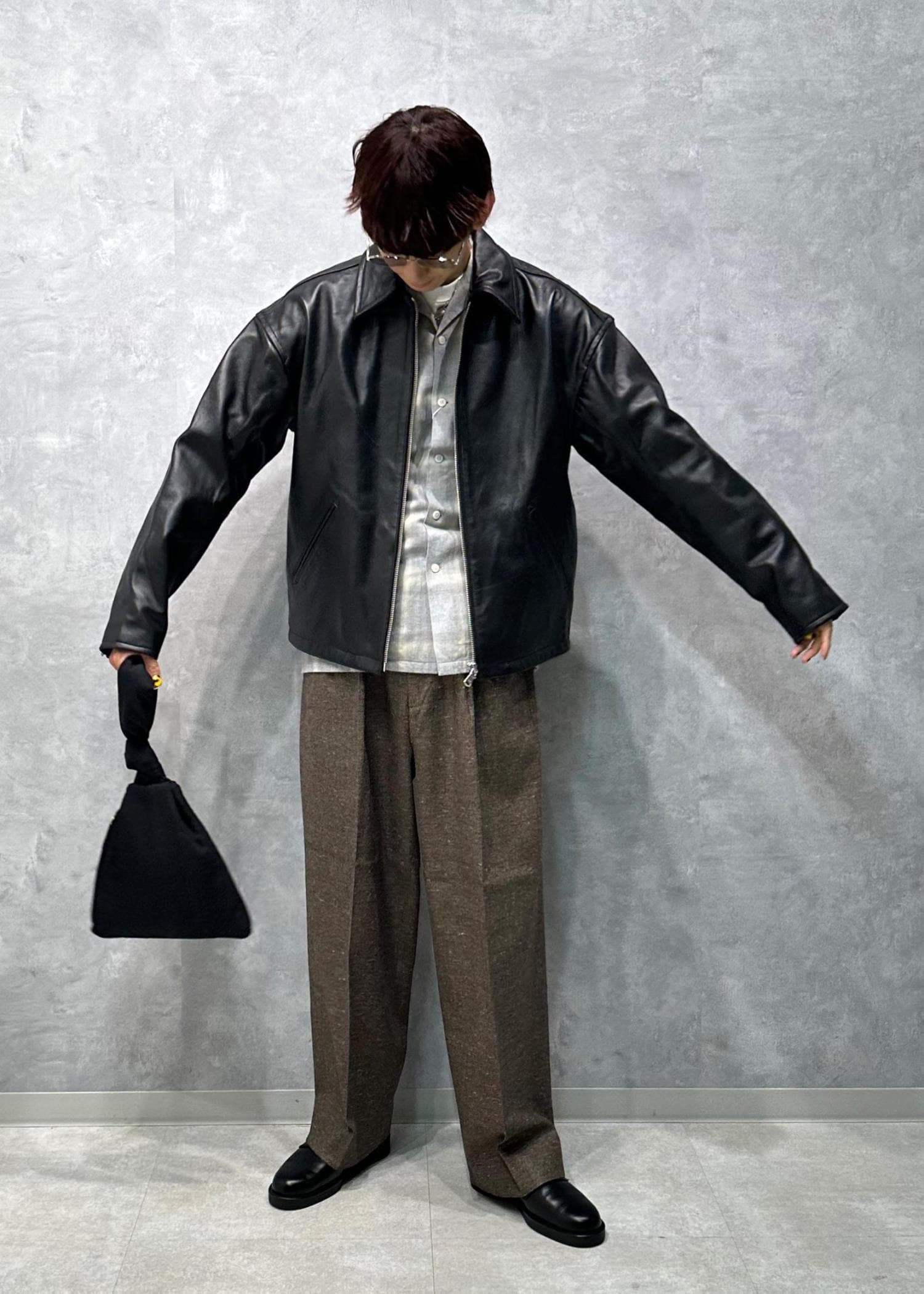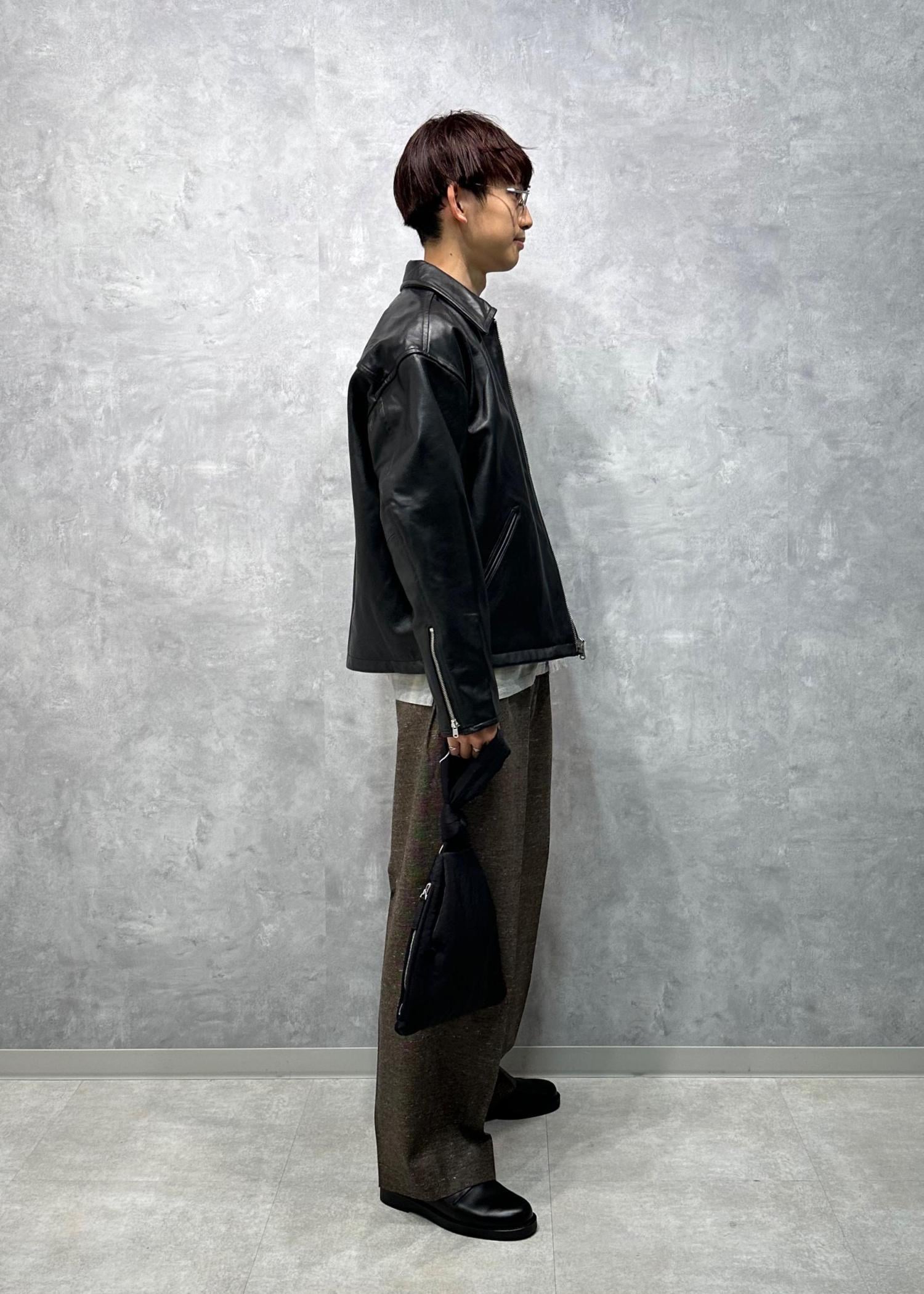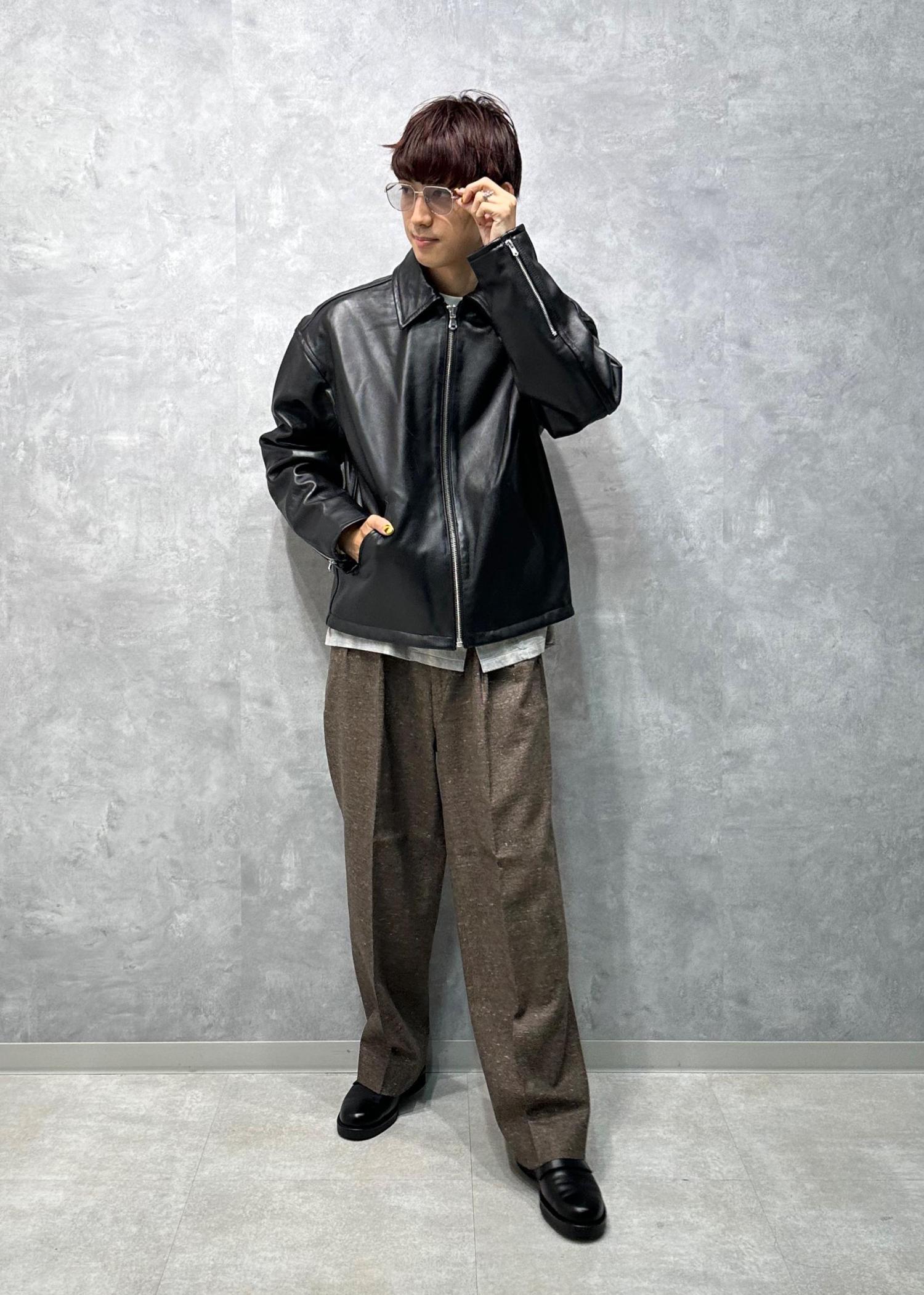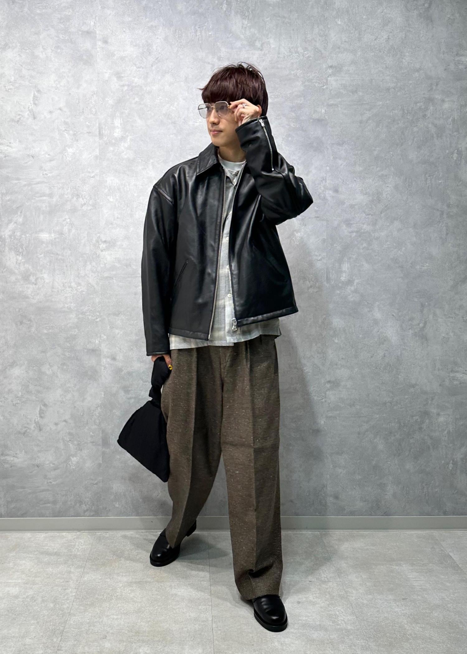 ラムレザーのジャケットを主役に、秋カラーと組み合わせた温かみのある風合いのコーデです。靴とバッグは黒でまとめてシックな印象に。暗めの色合いを多く取り入れることで、カッコよく大人っぽく仕上げてみました。