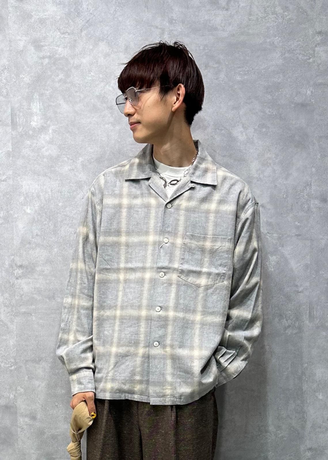 ややルーズめなサイズ感のオンブレチェックシャツ。オープンカラーの形なので首元スッキリで苦しさもないです。コットン100%で温かみがあり、秋らしい風合いです。落ち着いた色味で合わせやすく、インナーでも存在感を発揮してくれます。
