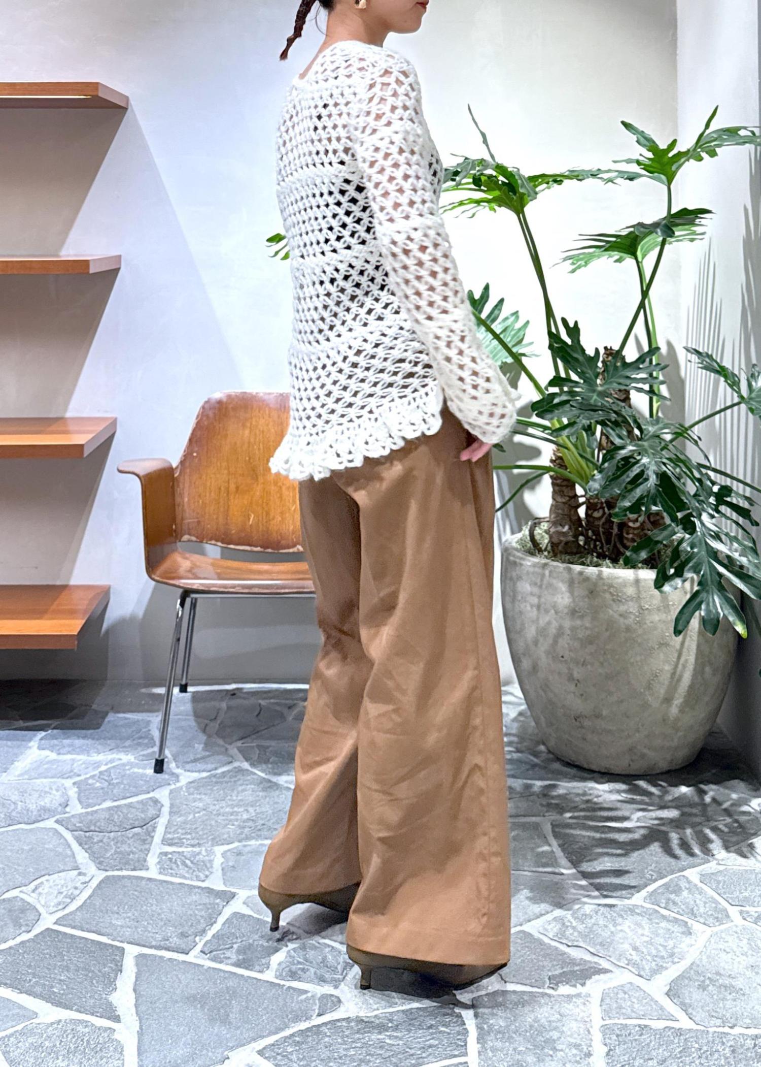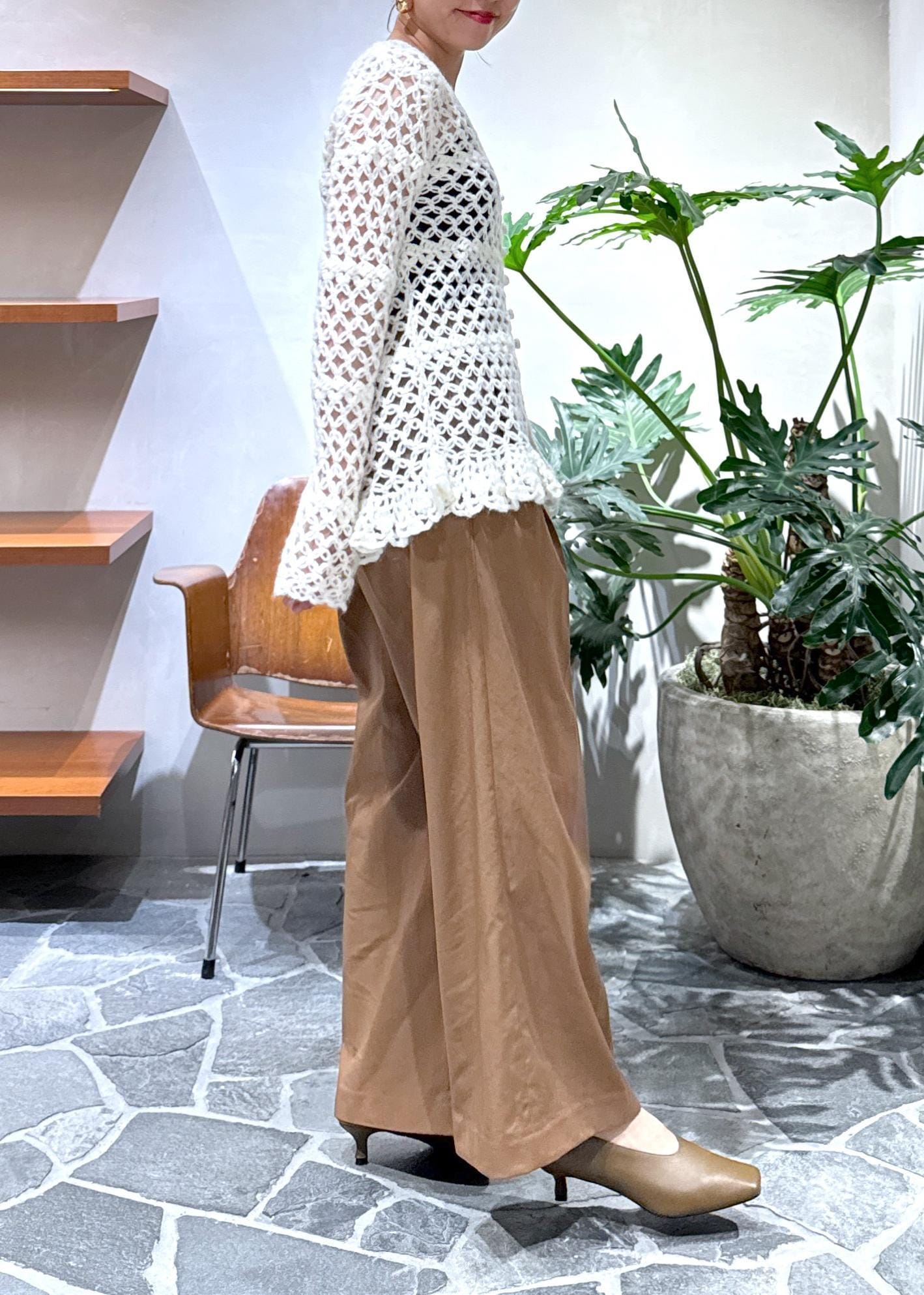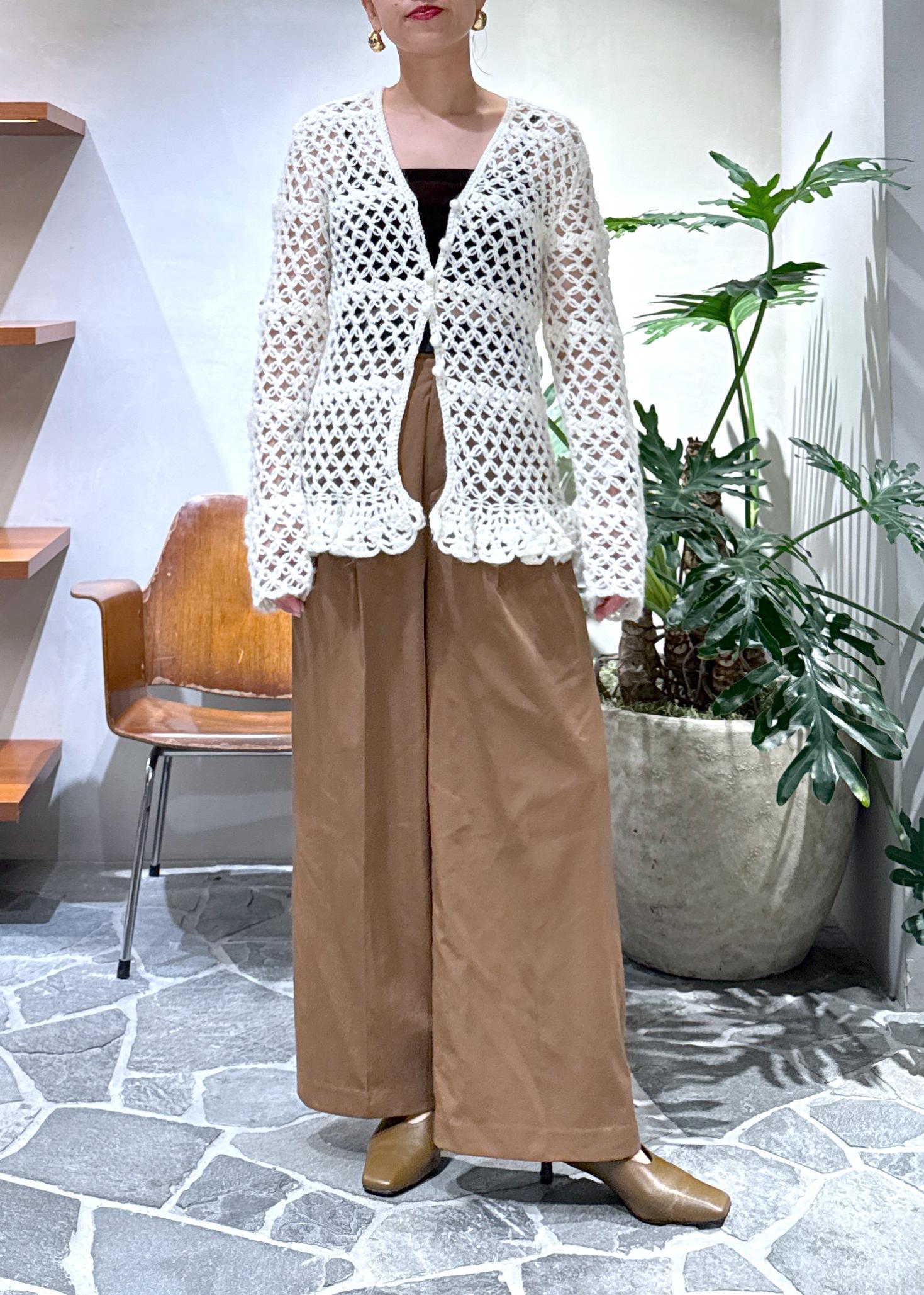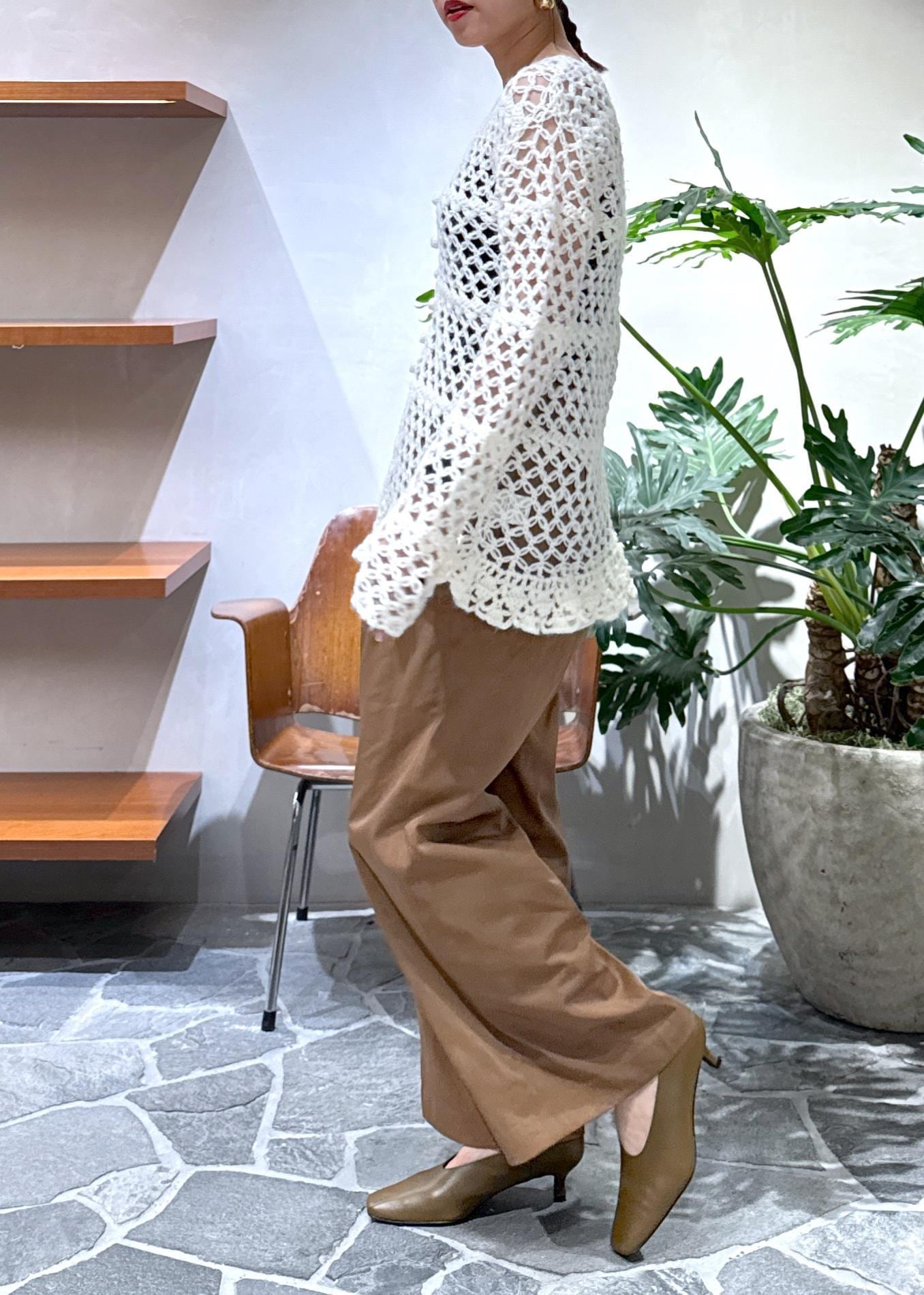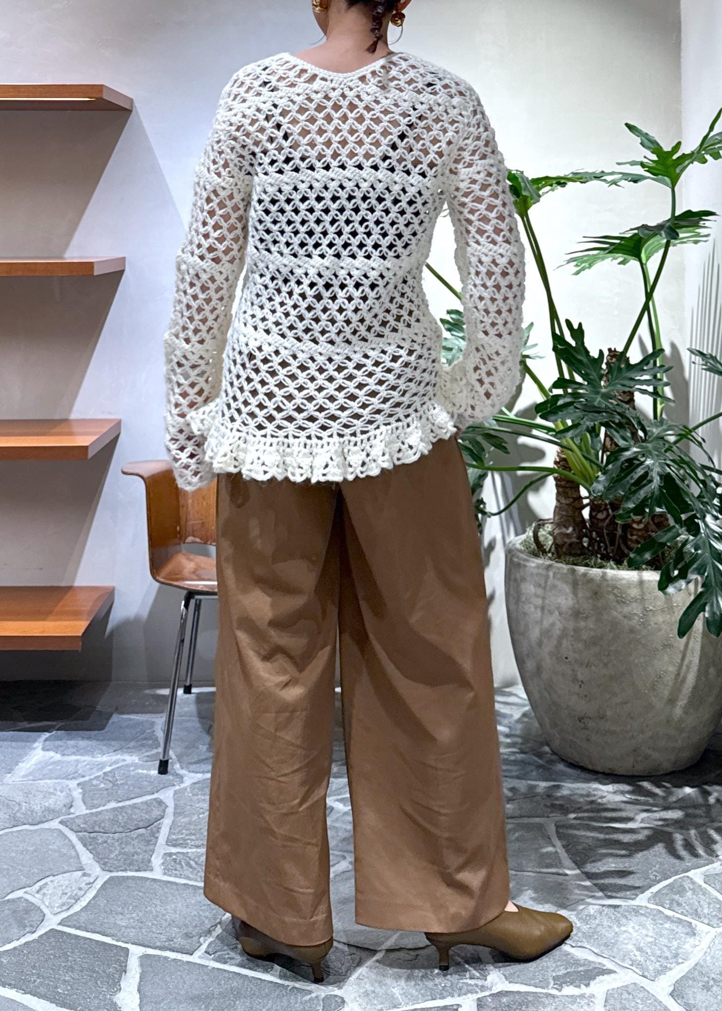 かぎ編みの可愛いニットは程よい透け感を出してくれて、ヘルシーな印象に。