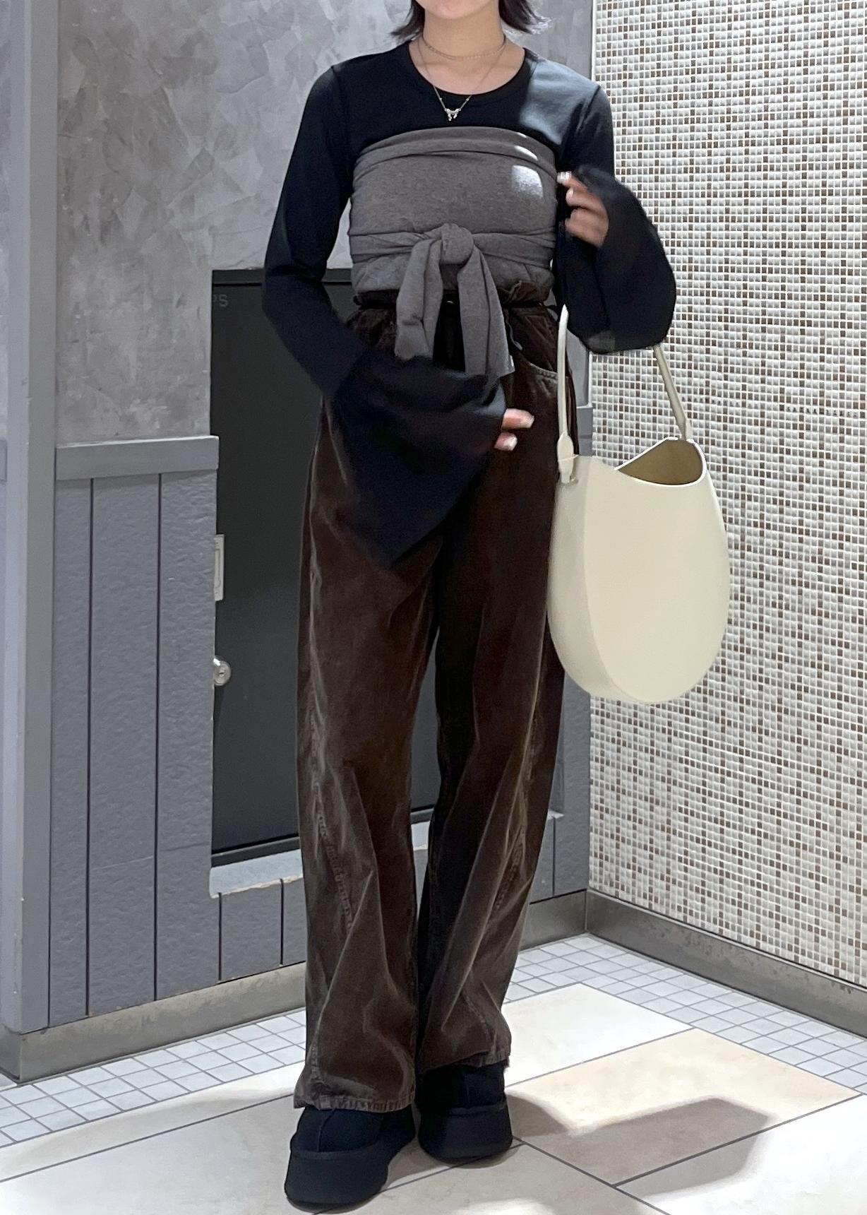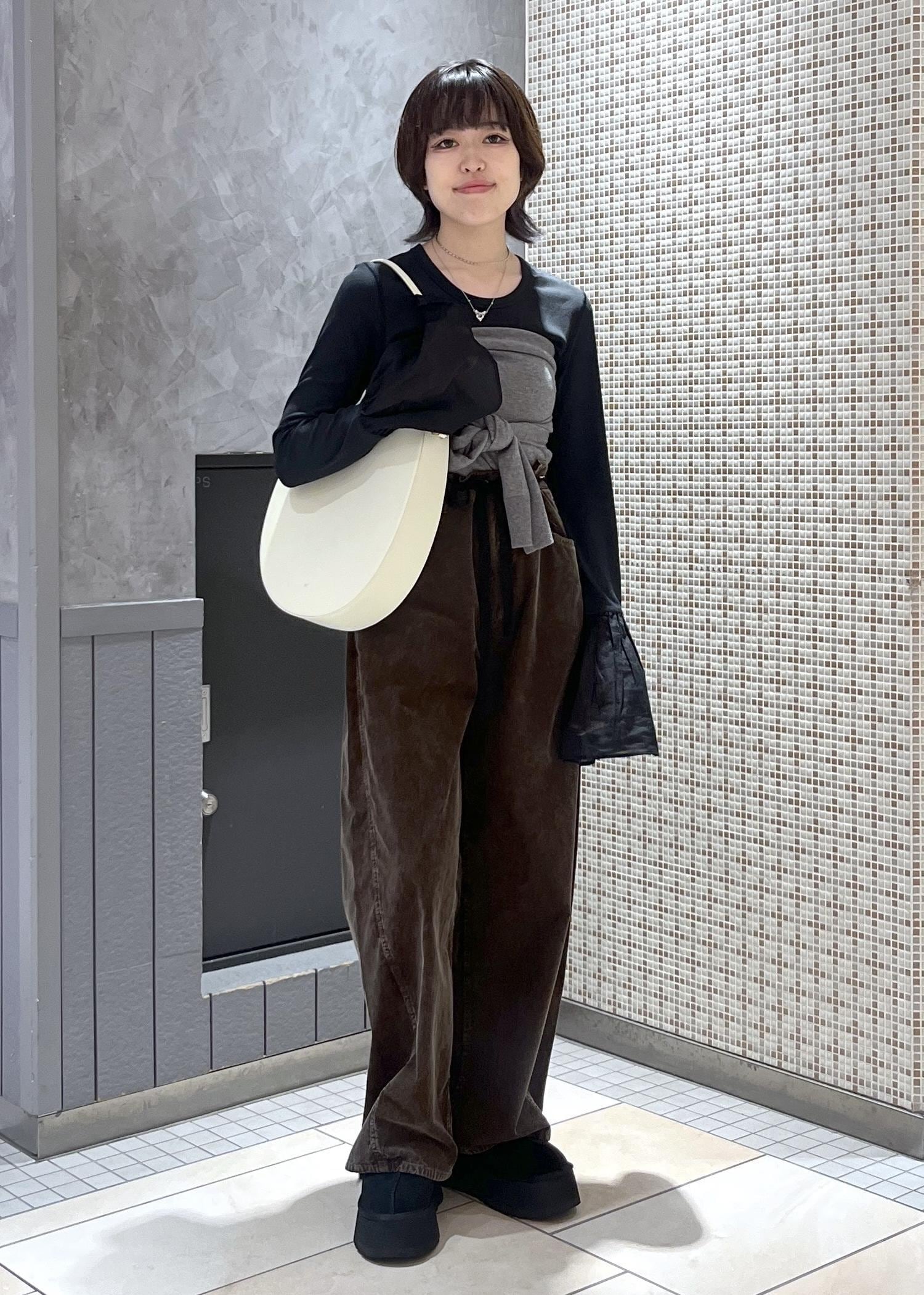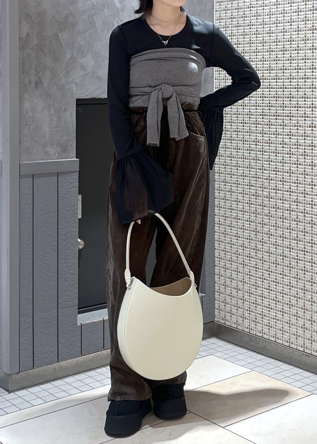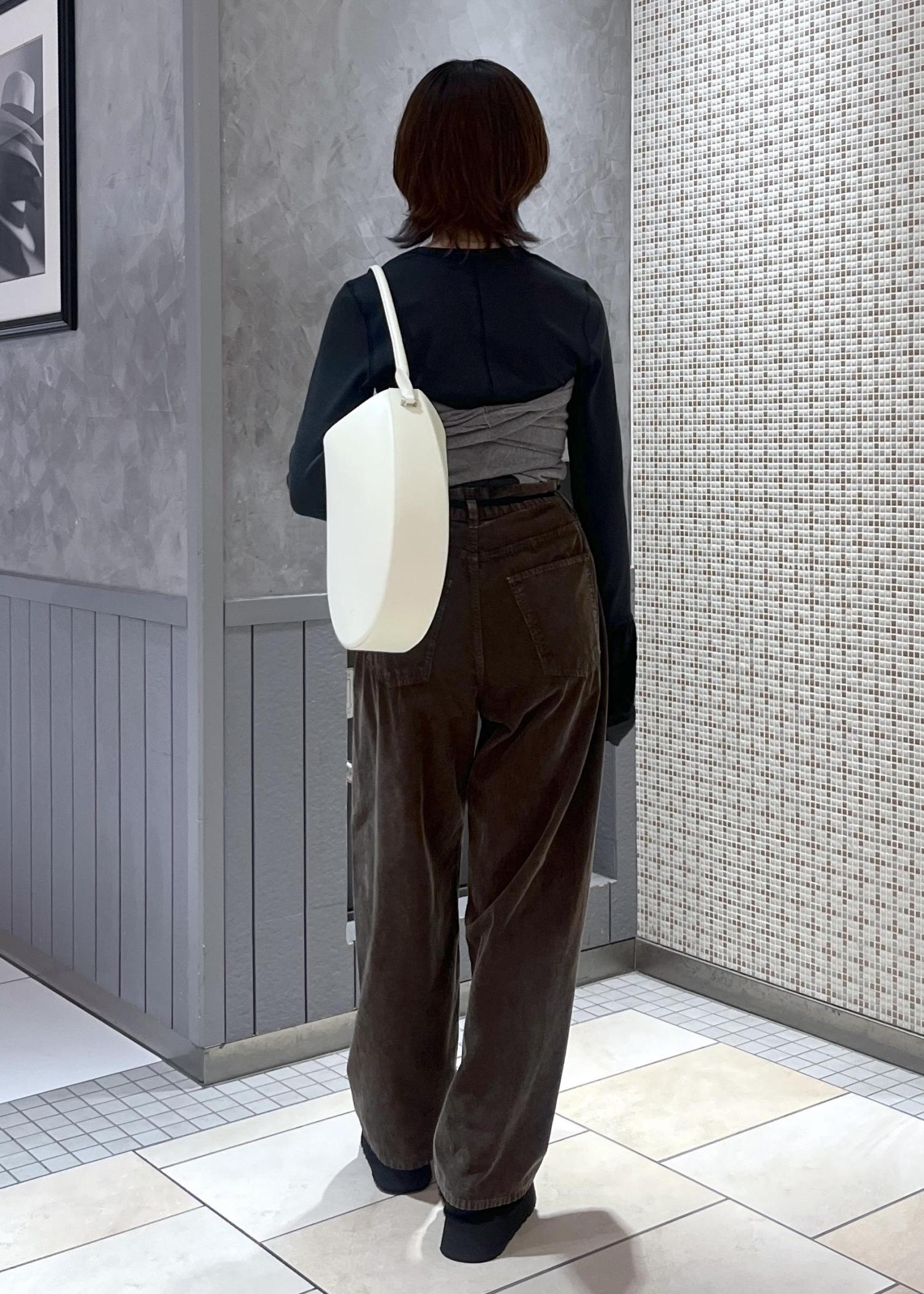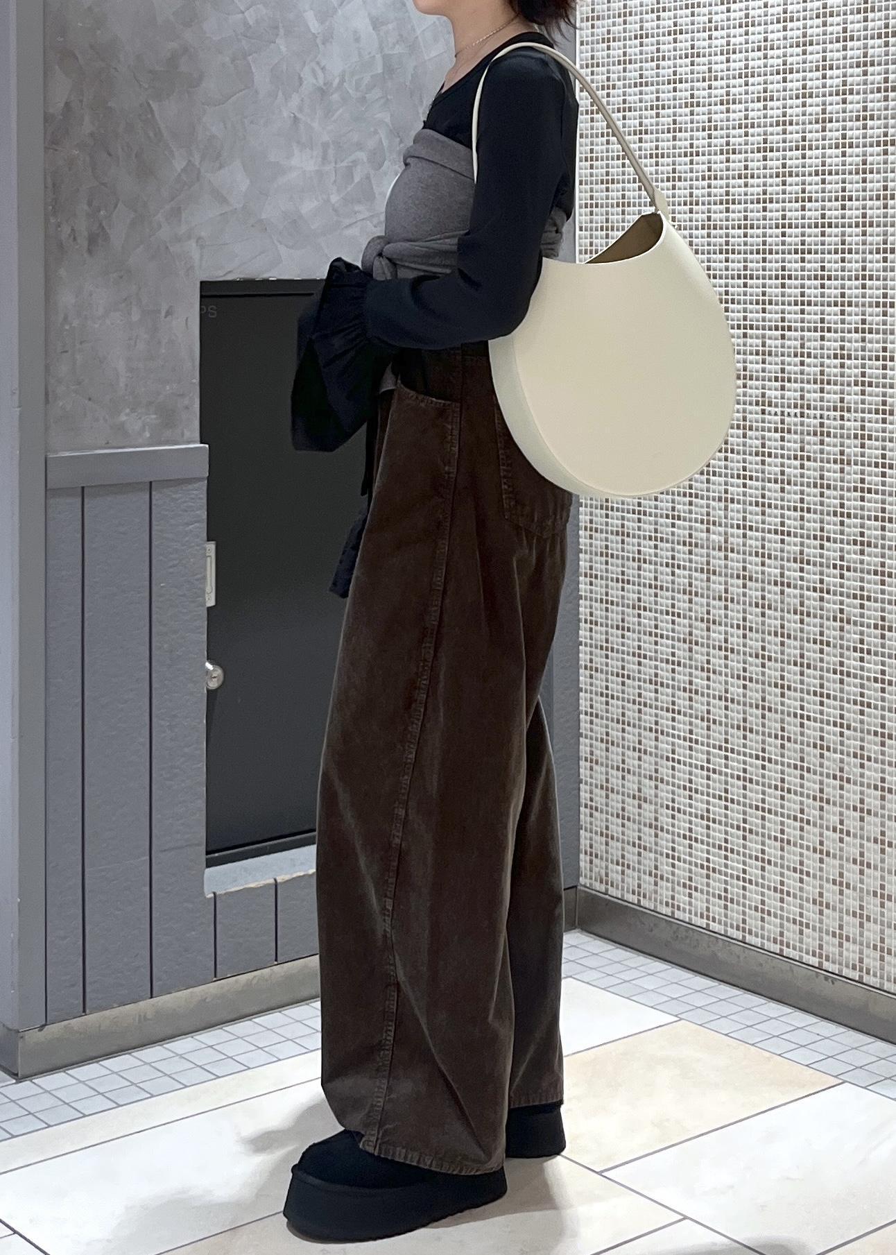 今回はPFTのTamago Medium バッグを使ったコーディネートです。フォルムが卵のようにころんとしているので女性らしさがありますよね⭐︎
