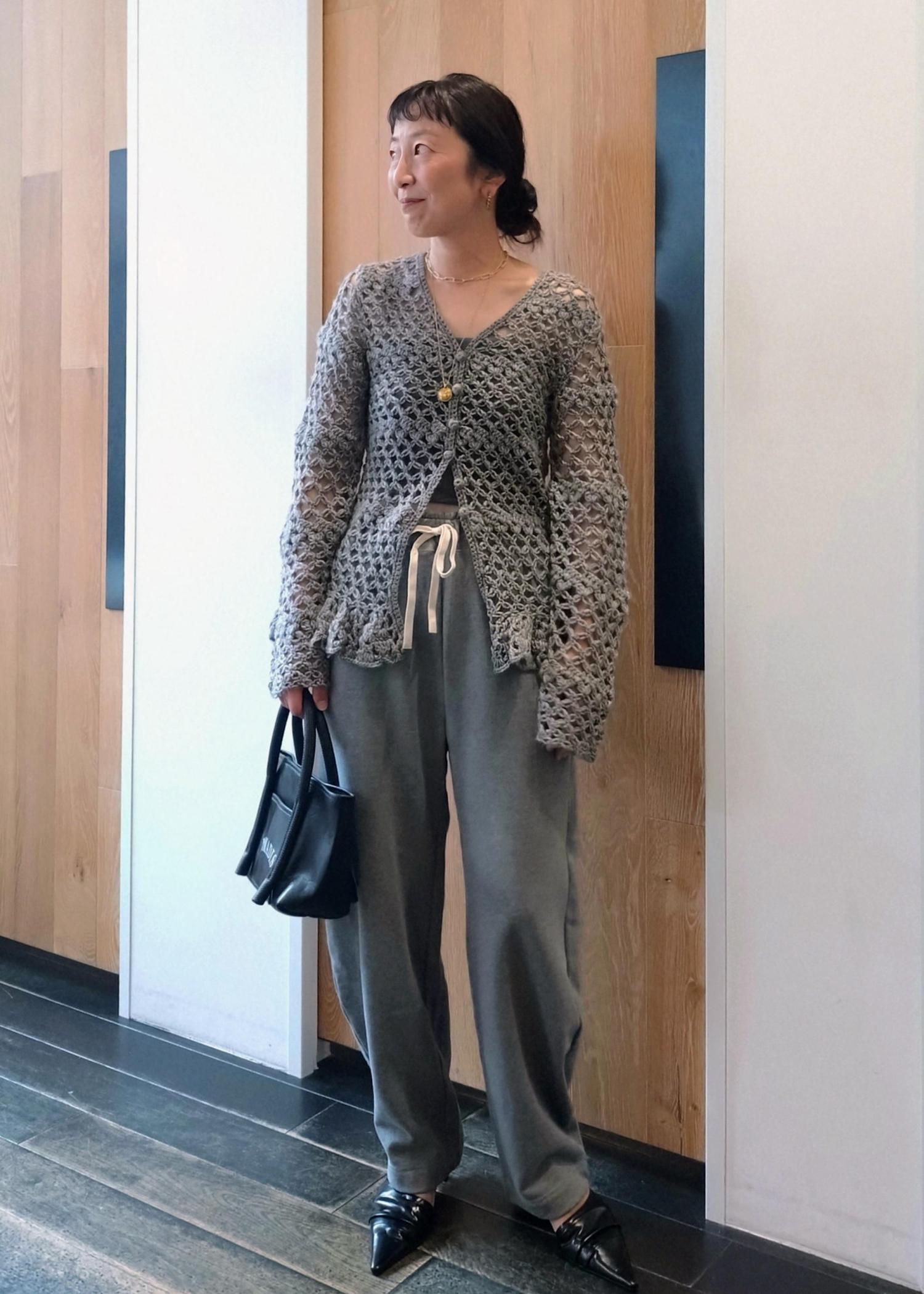 今回はカジュアルにスウェットパンツと合わせていますが、キレイめなパンツと合わせるコーディネートも絶対素敵だと思います。