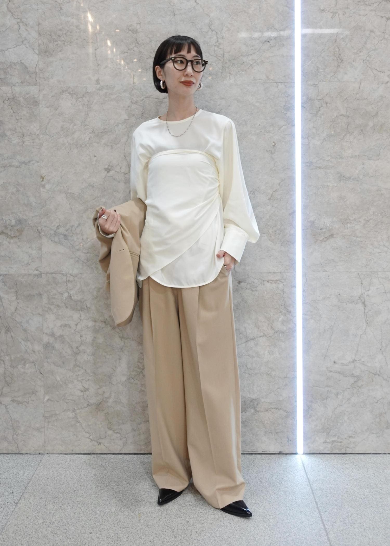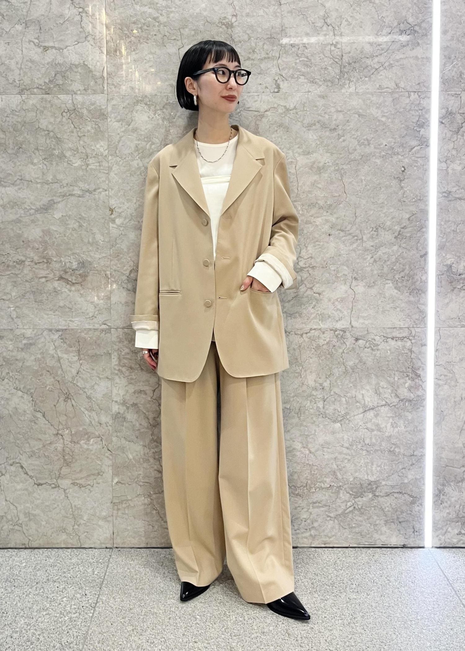 シャツとジャケットで同系色で合わせて秋っぽいスタイリングにしました。