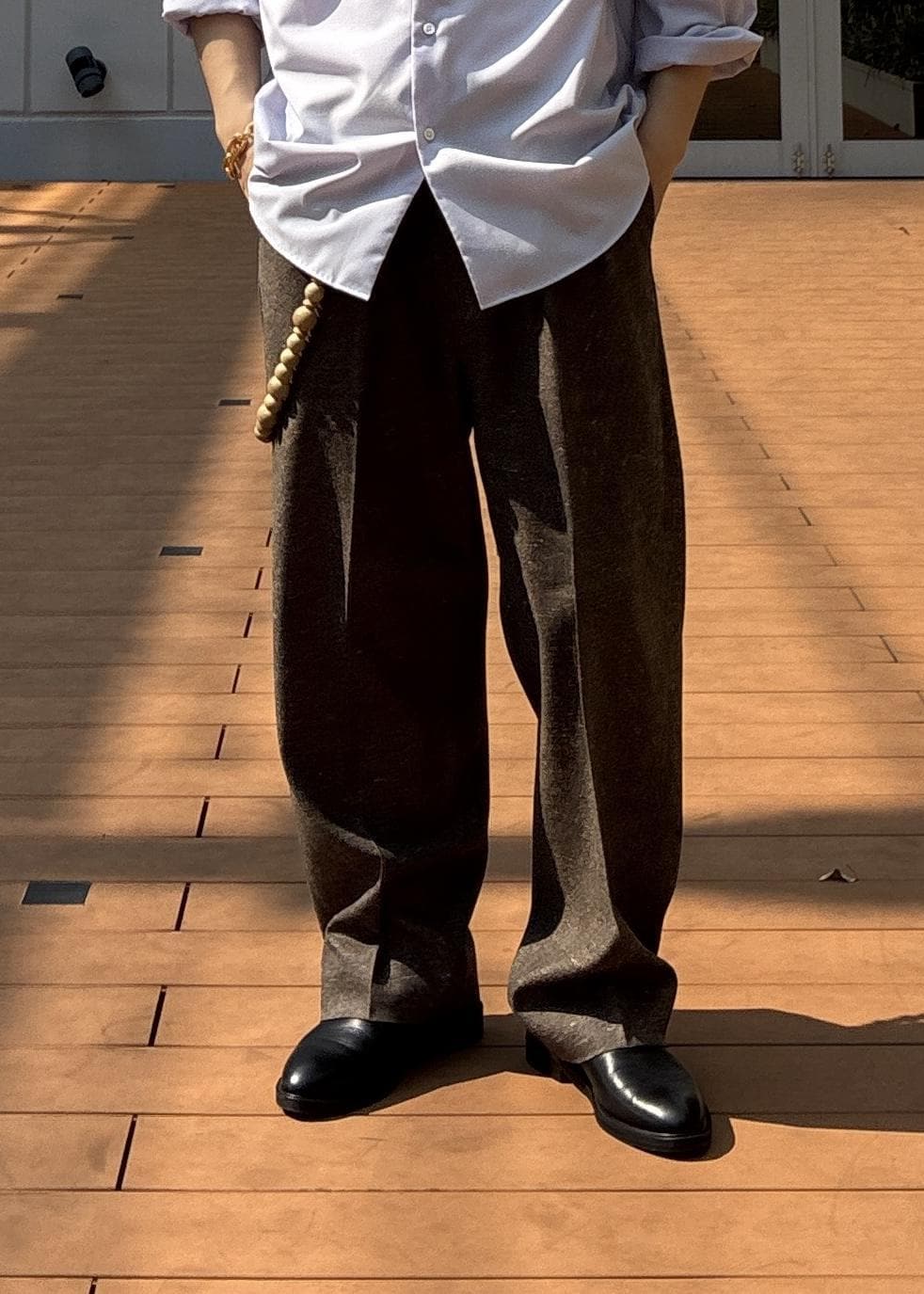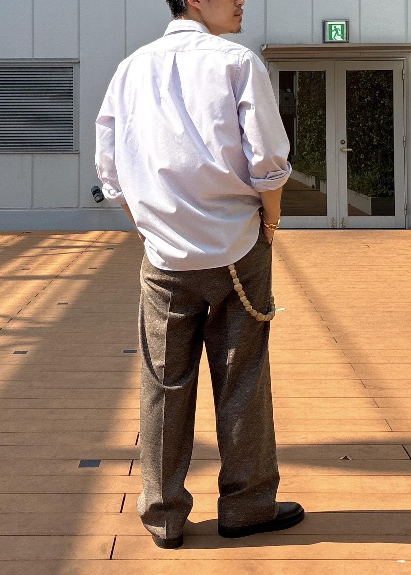 ADAM ET ROPÉ HOMMEハードクロス 2プリーツ スラックスダークブラウン系 / M¥35,200レビューウエスト周りは大きすぎず、僕の体型でMでベルトは無くても腰できちんと止まるくらいのサイズ感でした。生地感とシルエットがとにかく美しく、履くだけでスタイリングの主役になるようなパンツです。
