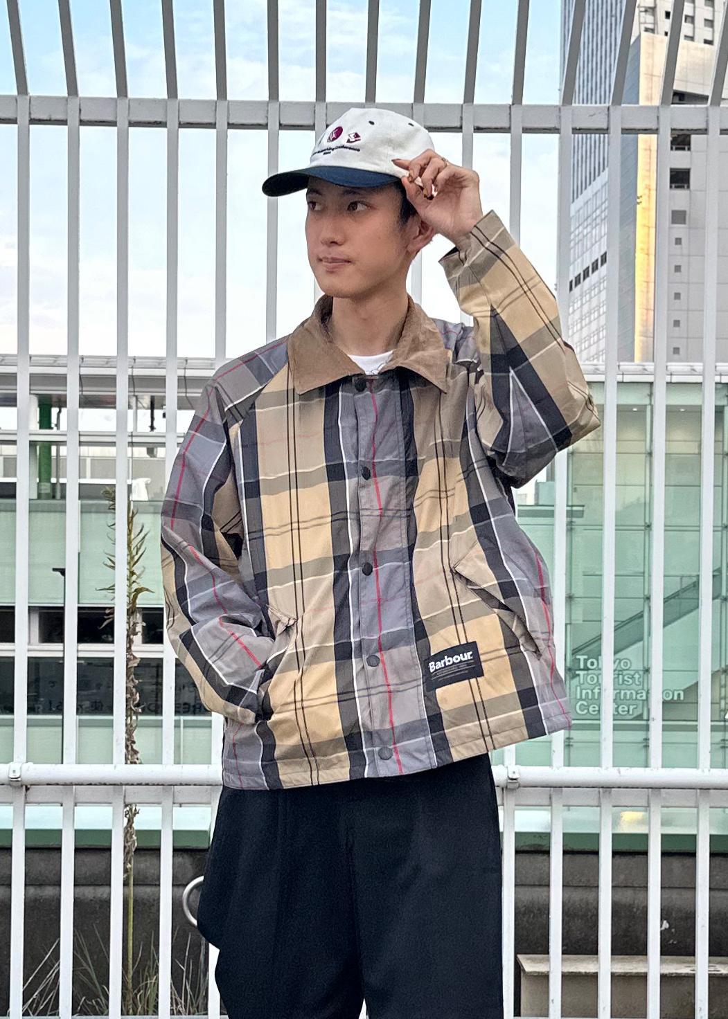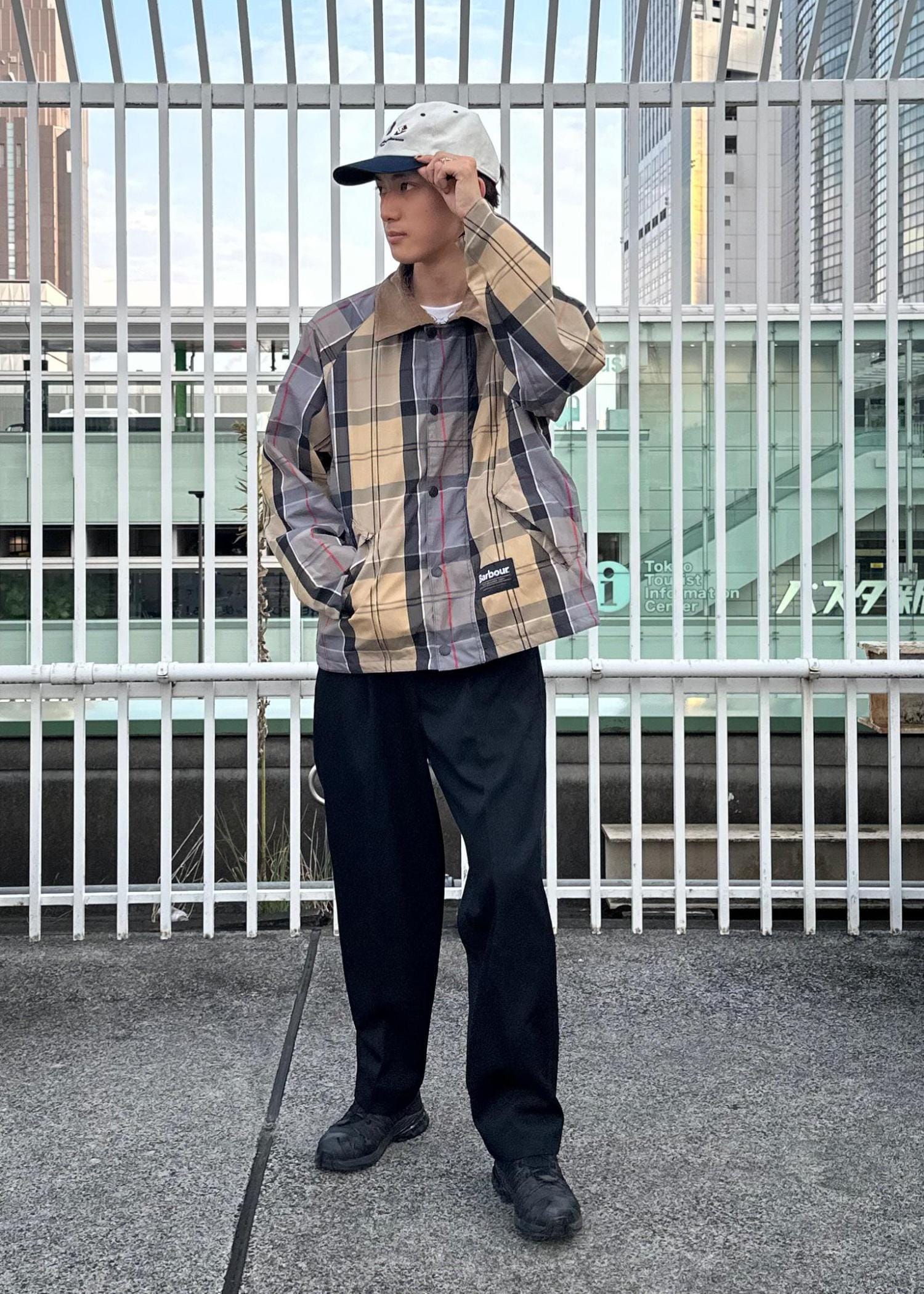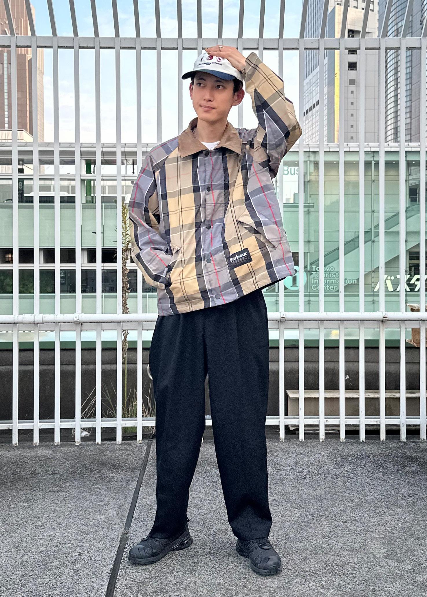 バブアーのジャケットを主役に、クリーム色のキャップを合わせたアースカラーコーデです。ベージュを基調とし、パンツはシンプルに黒のデニムスラックスを合わせてベージュの色合いを際立たせてみました。パンツのシルエットがキレイなのでカジュアルすぎず、大人っぽい雰囲気に仕上げました。