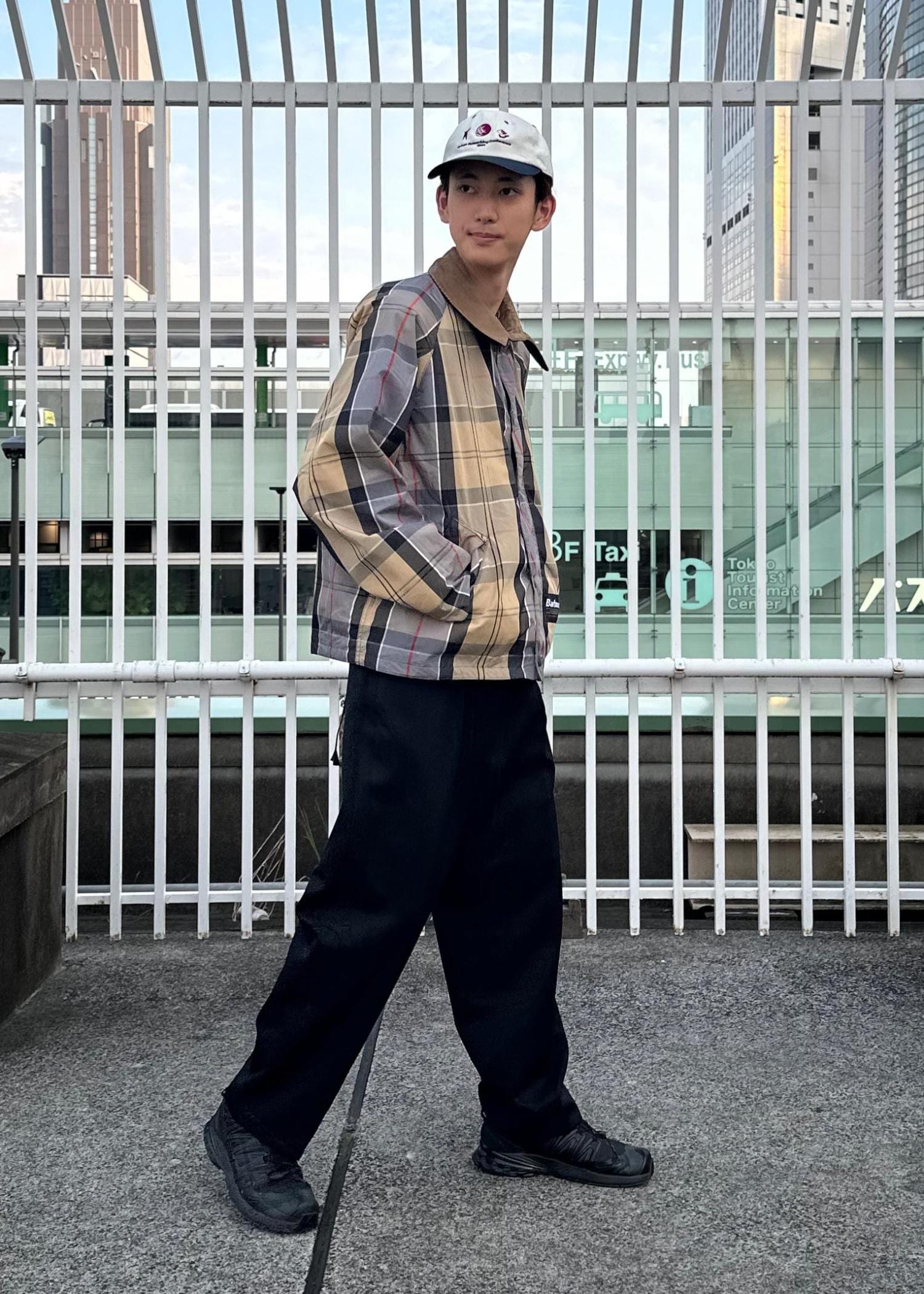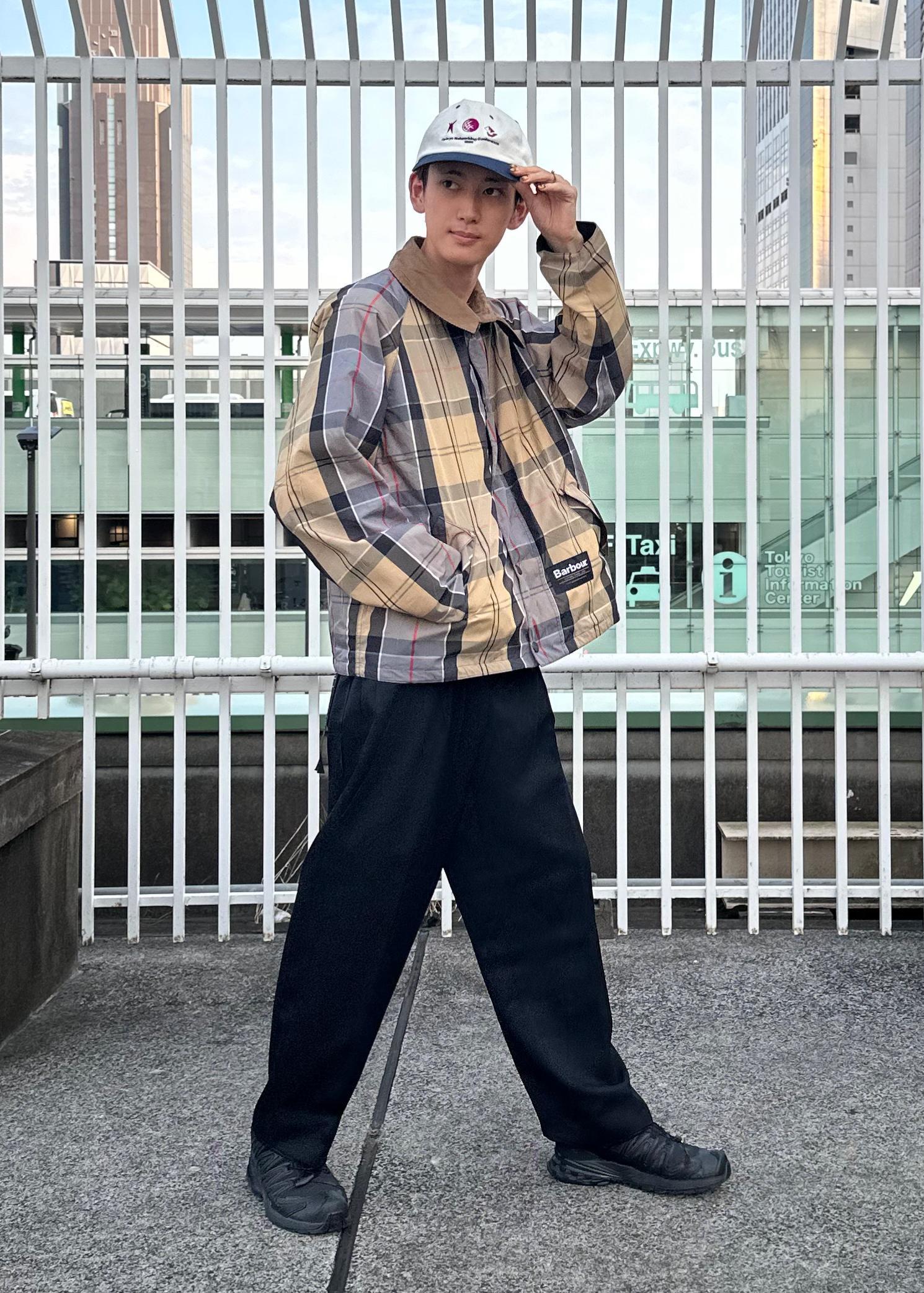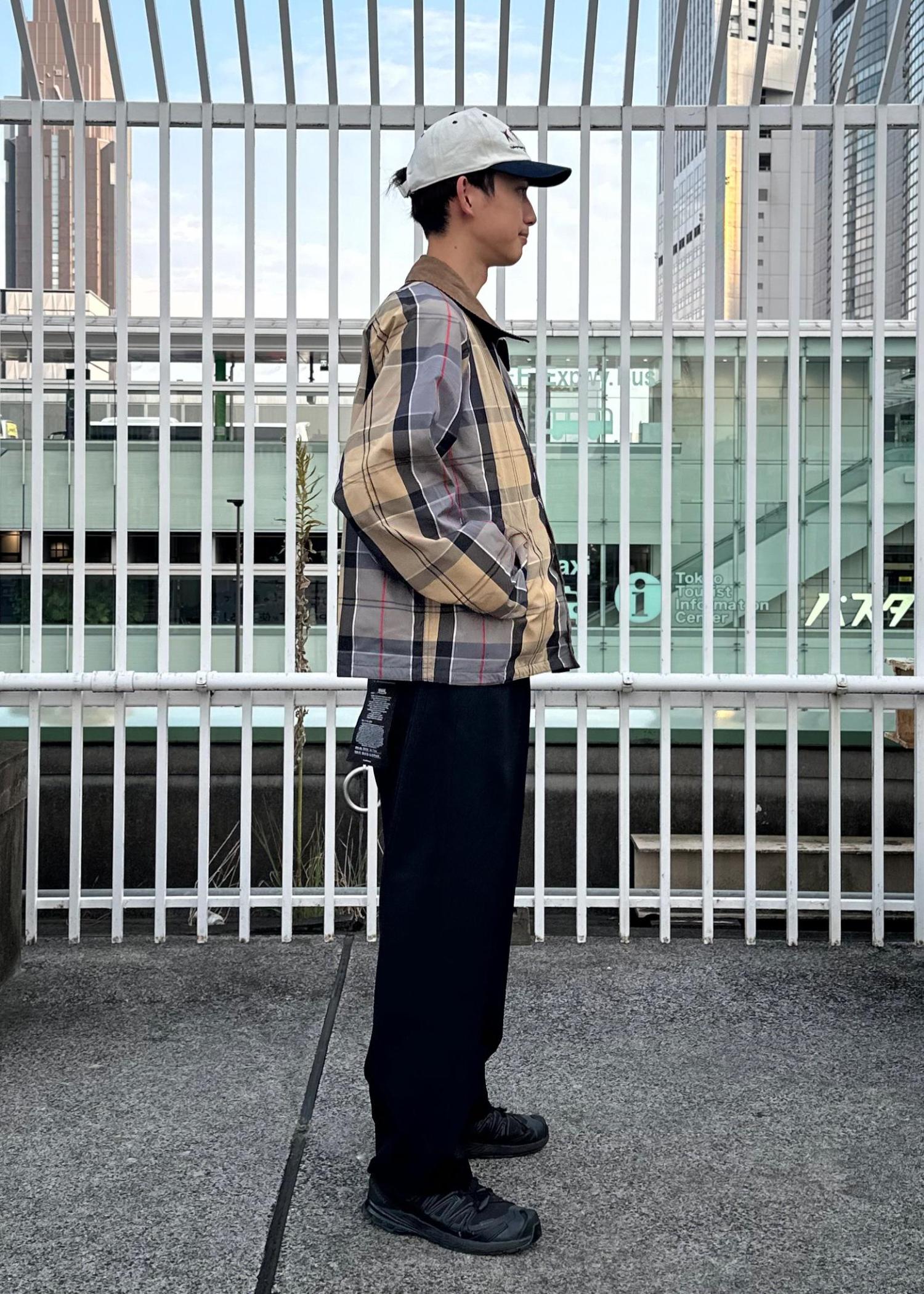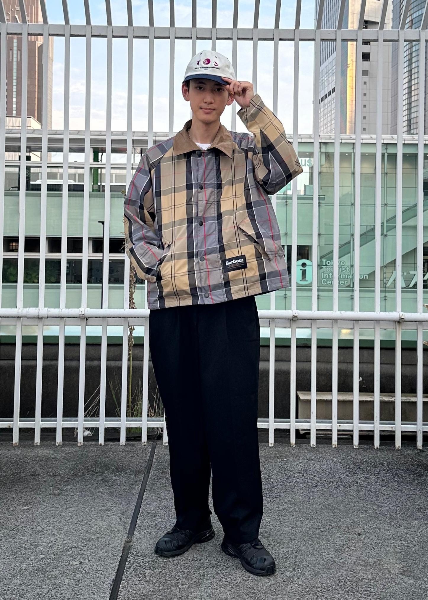 バブアーのジャケットを主役に、クリーム色のキャップを合わせたアースカラーコーデです。ベージュを基調とし、パンツはシンプルに黒のデニムスラックスを合わせてベージュの色合いを際立たせてみました。パンツのシルエットがキレイなのでカジュアルすぎず、大人っぽい雰囲気に仕上げました。