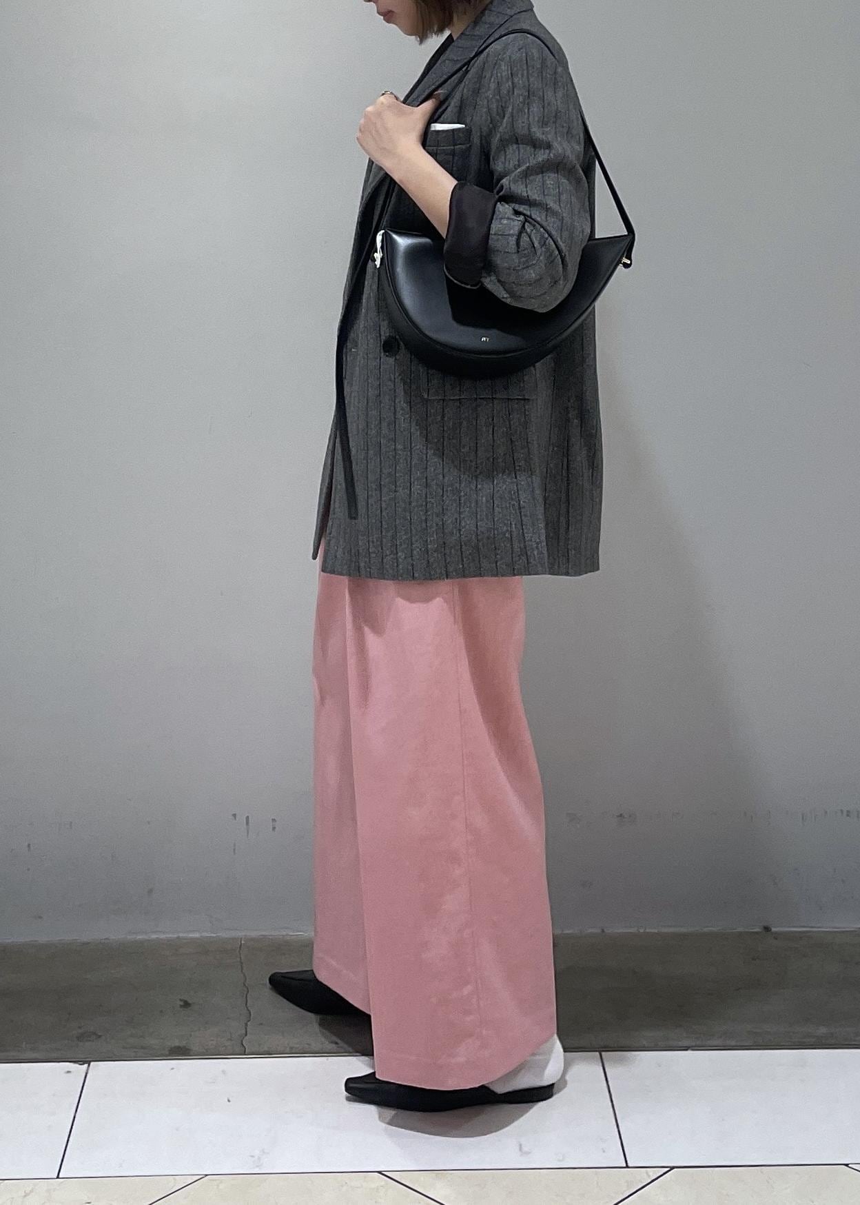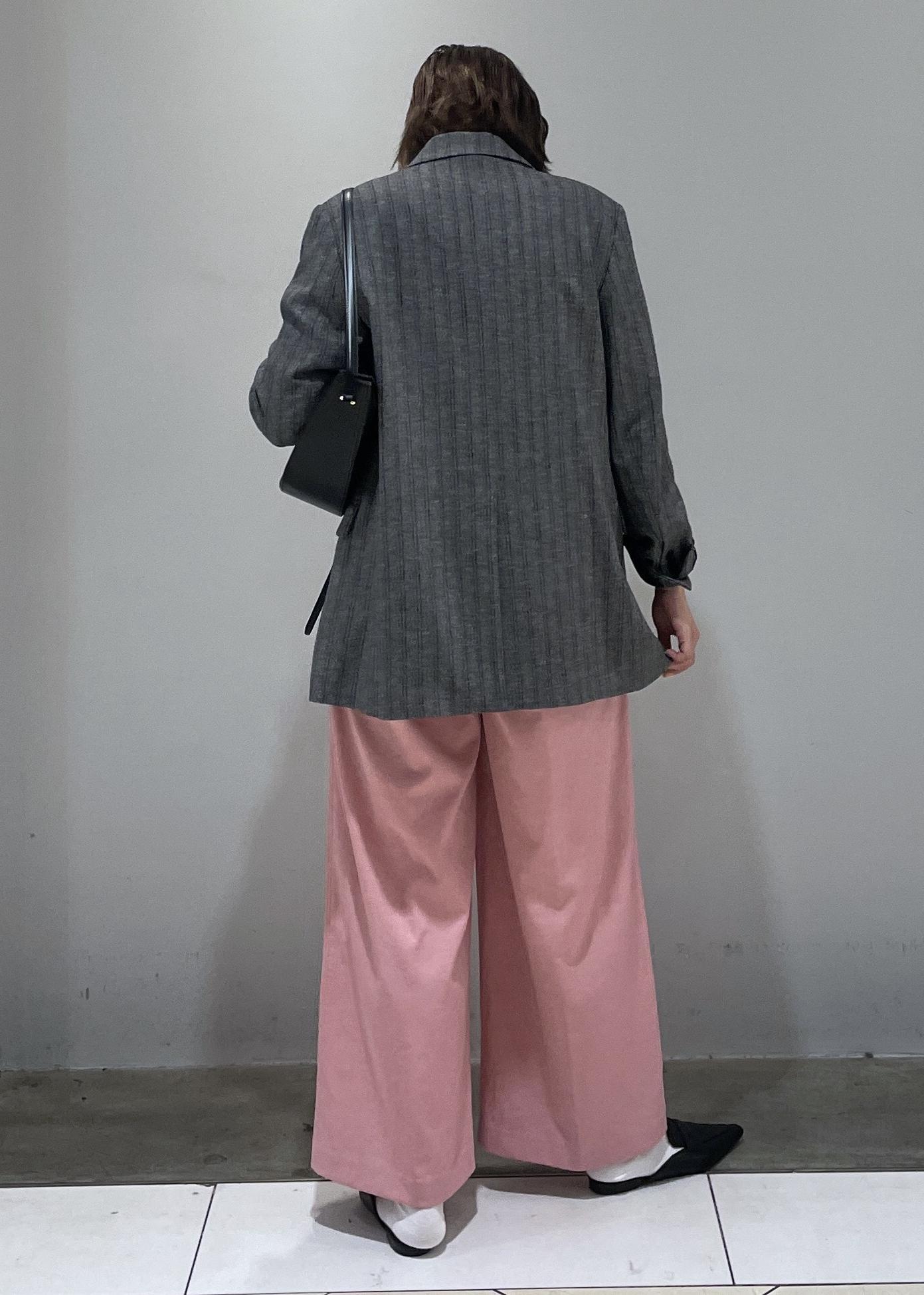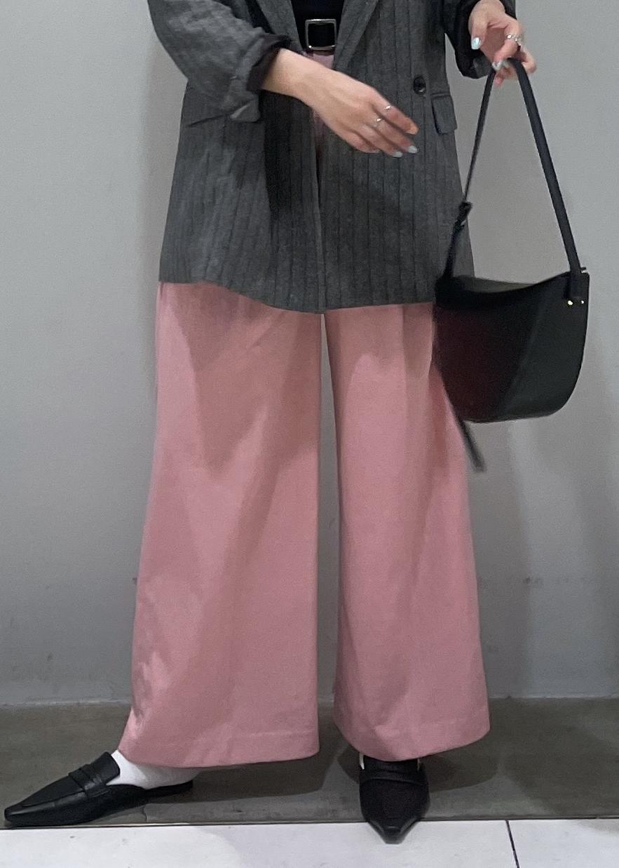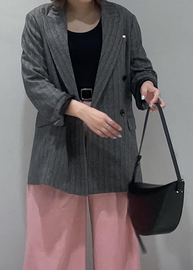 また、ピンクは甘すぎて挑戦しにくいという方もおられると思いますが、今回のように落ち着いたグレーと合わせれば、大人っぽく着られるので挑戦しやすいかと思います☺︎