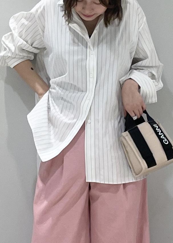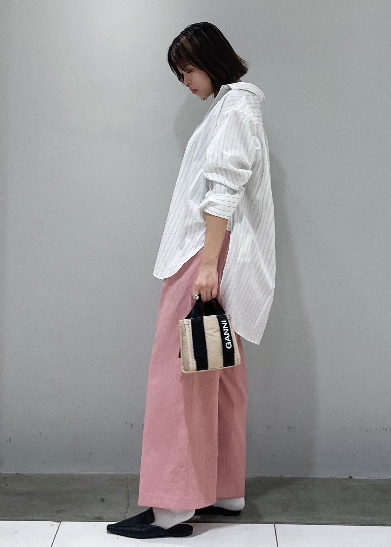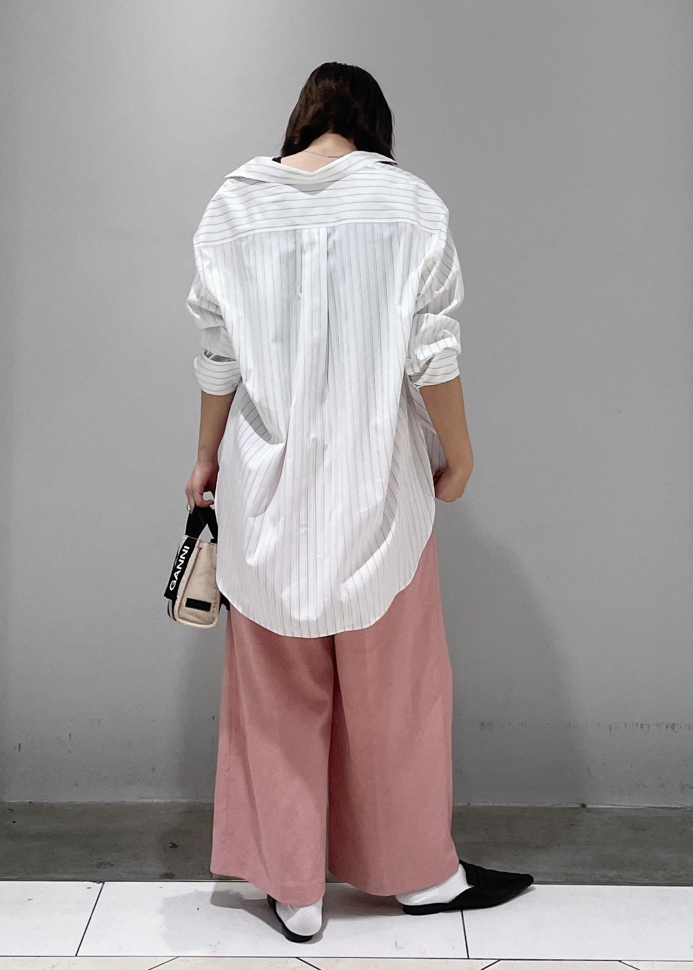 今回オーバーサイズシャツは、上ボタンと下ボタンを開けて、後ろに少し抜くことですっきり着てみました◎