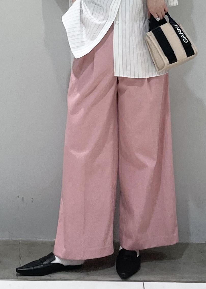 ピンクのフレアパンツは女性らしさを出してくれながらも、ハリ感のある生地なので肌よくかっこよさも出せるのが◎