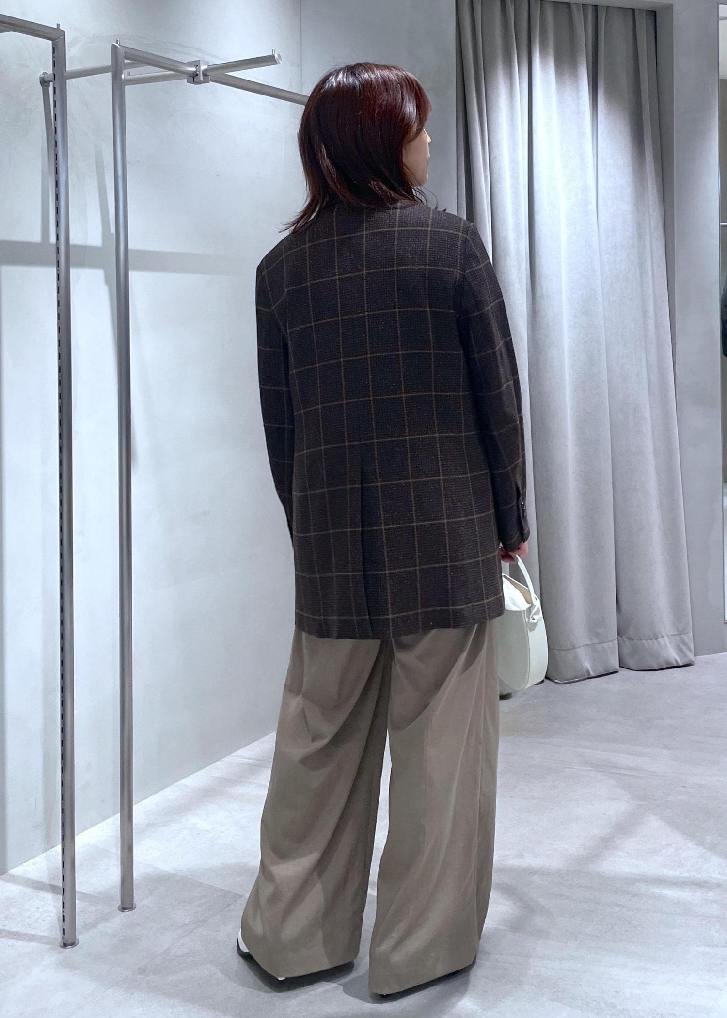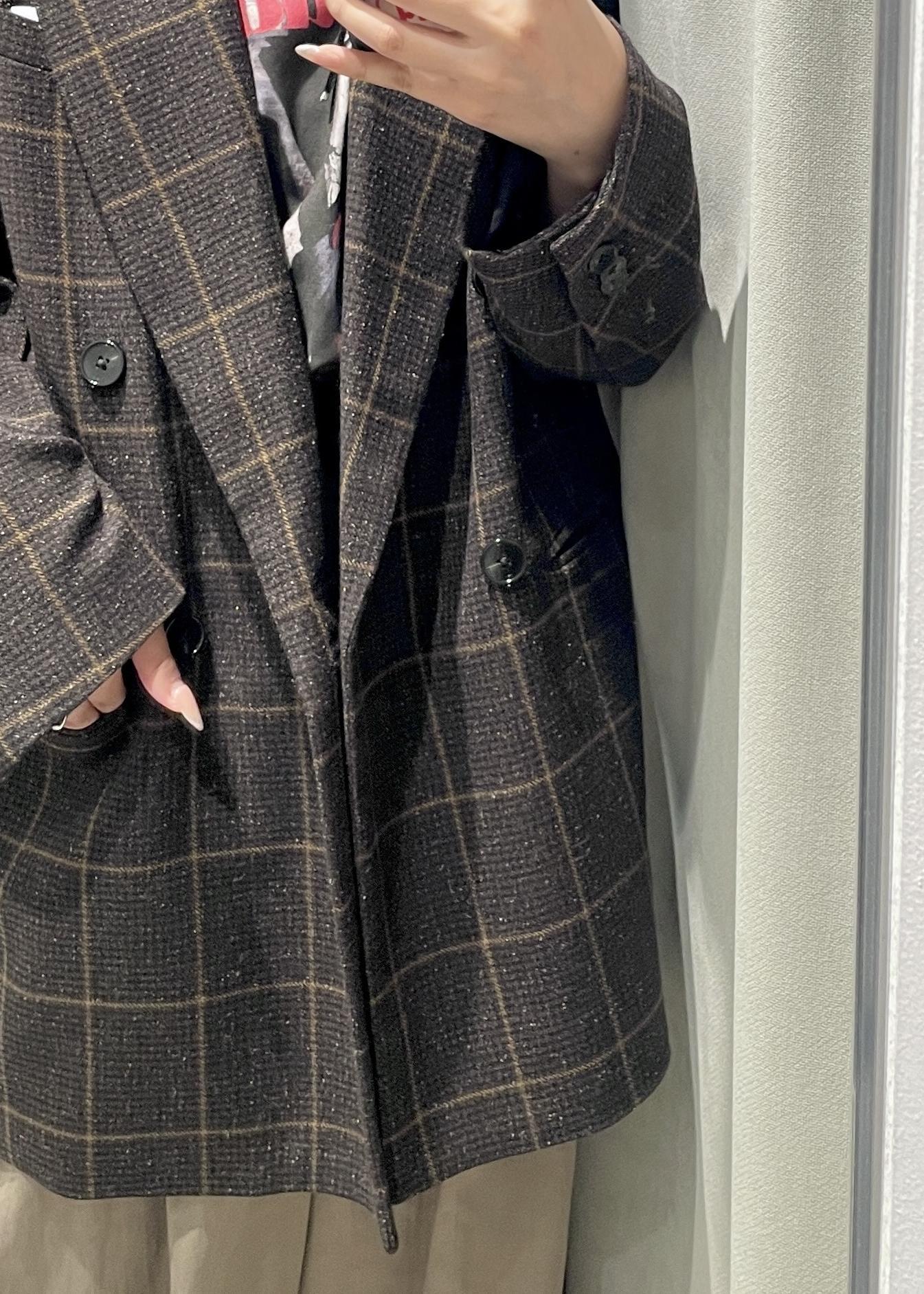 ADAM ET ROPÉ FEMMEダブルブレストツイード&チェックジャケットブラウン /¥40,700レビュー160cmで36着用。さりげないネップなのでツイード感強くないので、メンズライクのスタイリングにも合わせやすいアイテム。ゆったりルーズなシルエットですが、ダブルブレスト・付属のチーフでかっちり感も演出してくれるジャケットです。