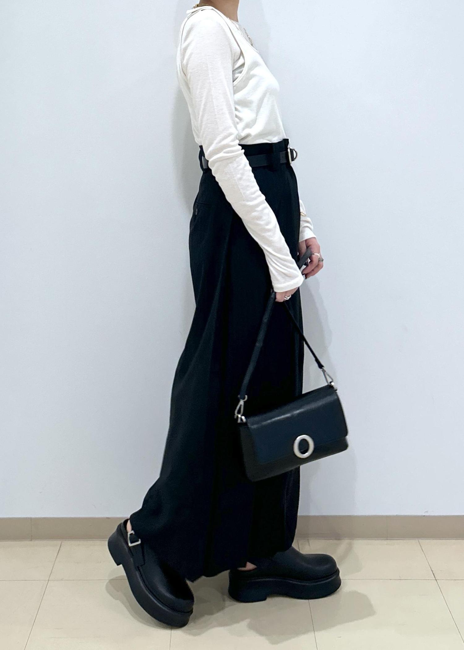 腰履きできるアイテムなので、ウエストはやや緩めですがベルトで絞ってハイウエストで履いても綺麗なシルエットになります。 -