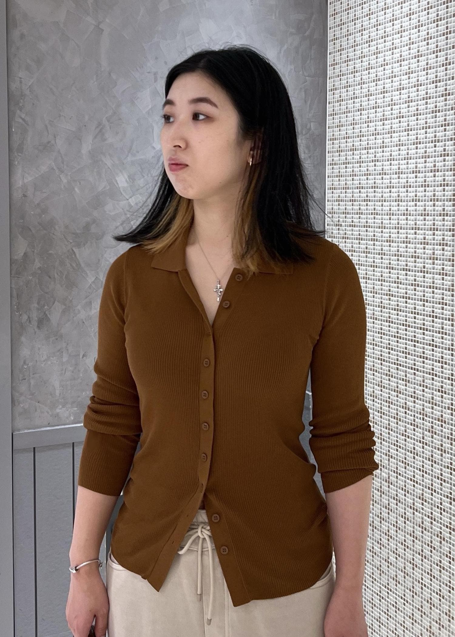 ADAM ET ROPÉ FEMMEポロニットリブカーディガンブラウン系 / F¥19,800レビュー程よい薄さのニットカーディガンです。フィット感もありながら着心地の良い素材感です♡丈感は少し長めなので、インできるのもかわいいですが、あえてアウトで着るのも◎