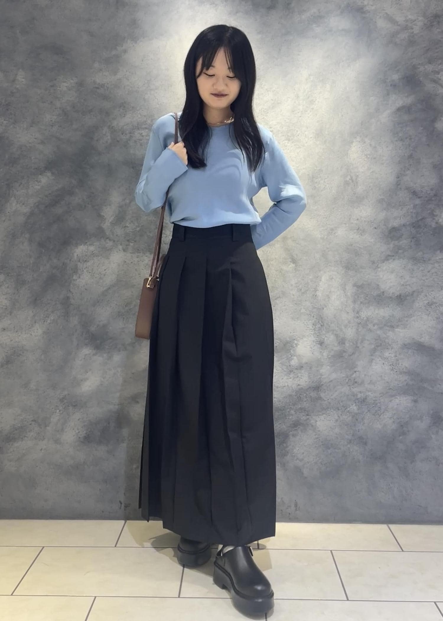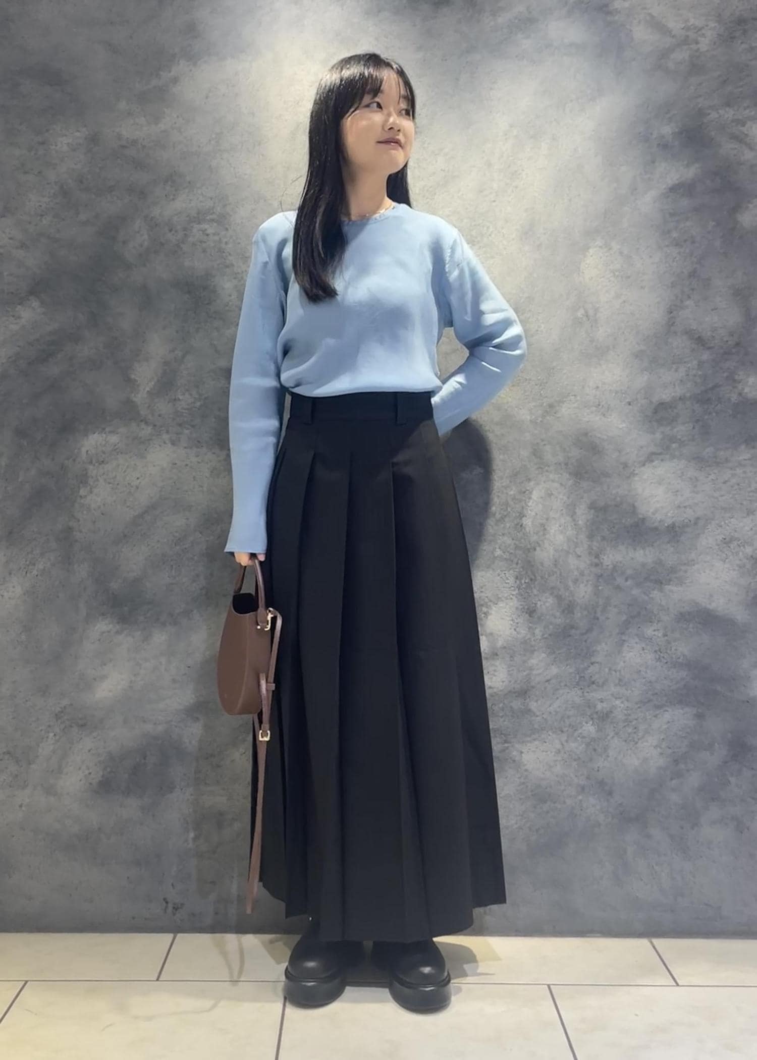 発色の良いブルーのお色味が映えるよう、スカート・バッグ・靴はベーシックカラーでまとめてみました。