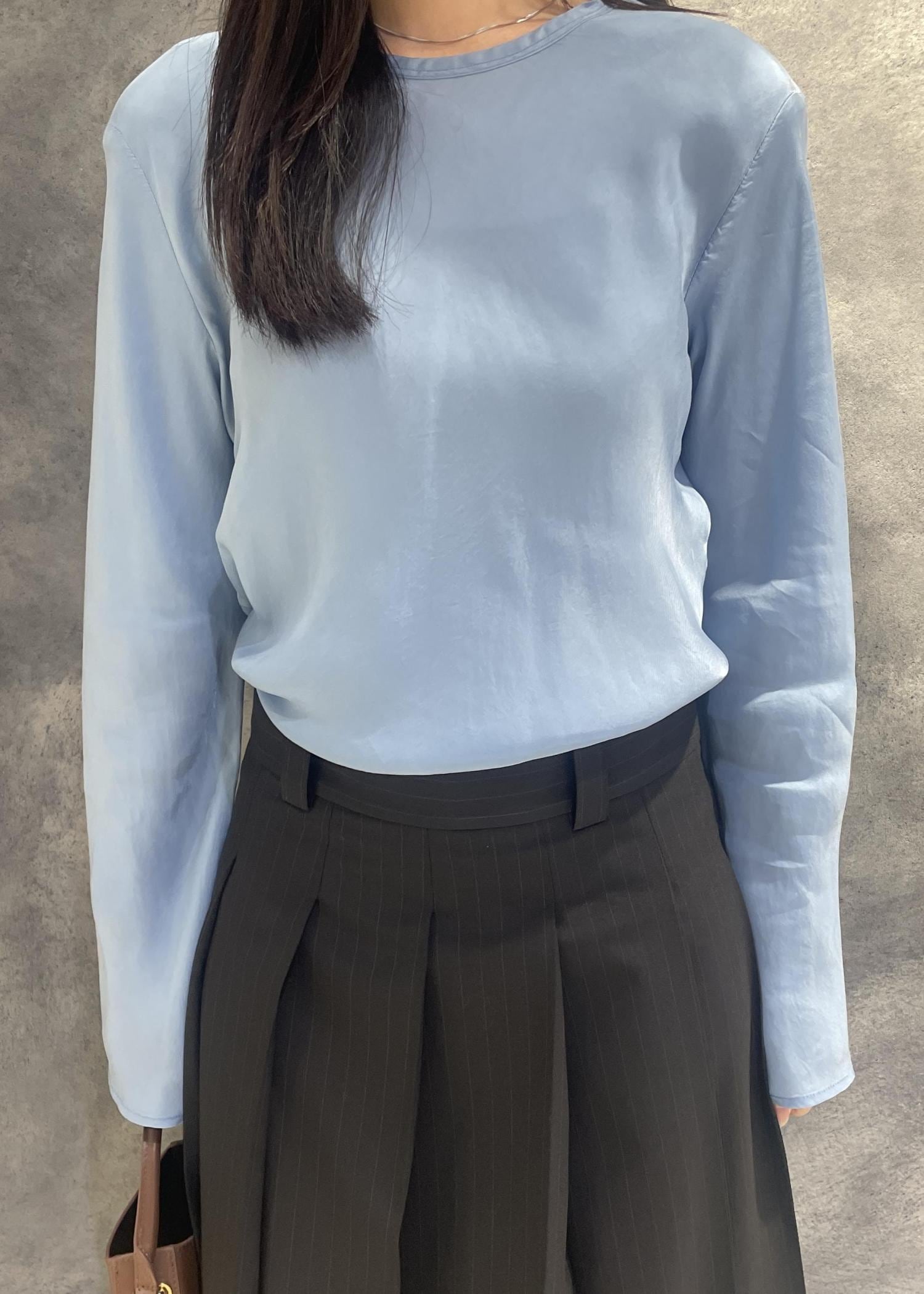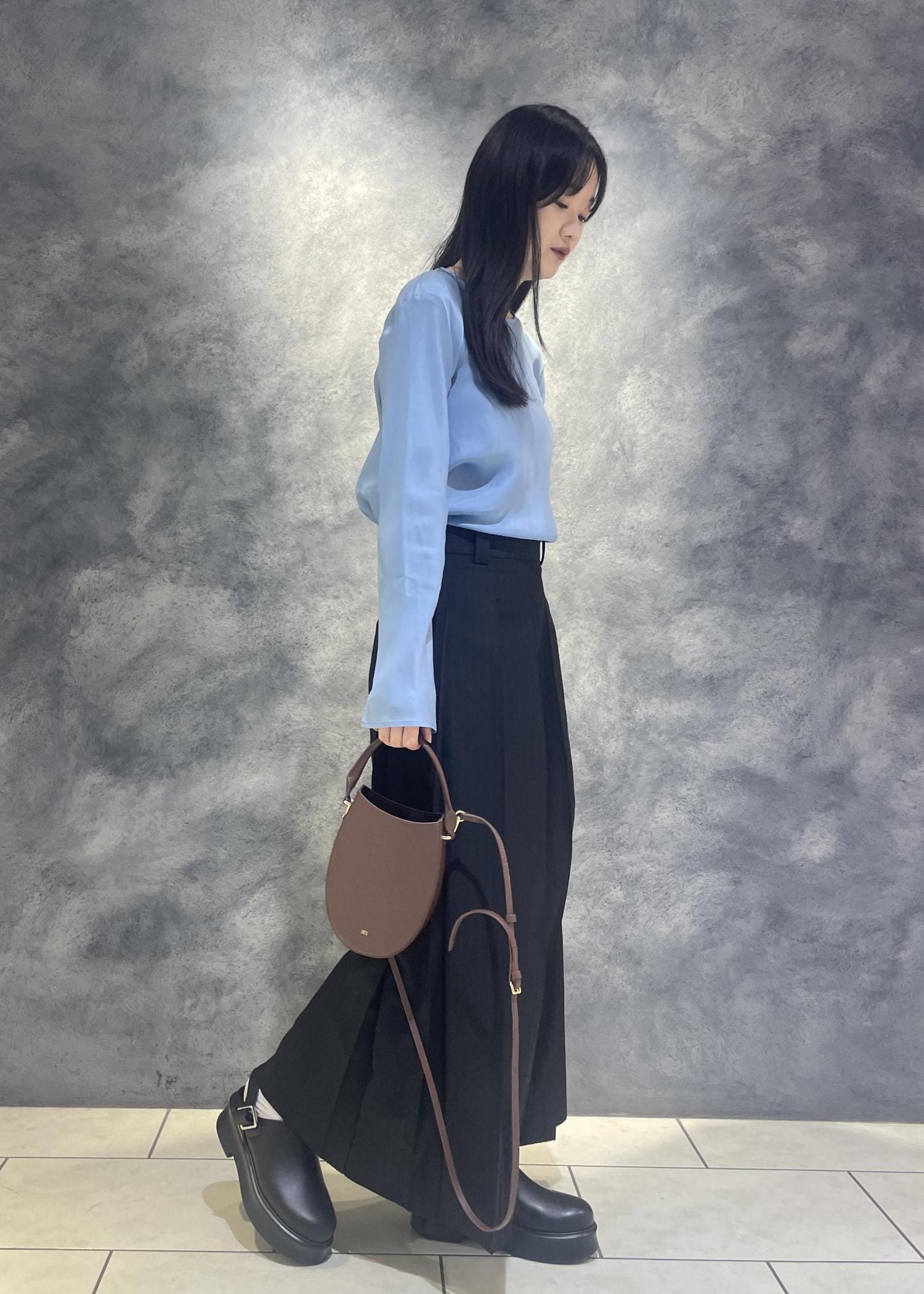 本日はEMOELLEの秋冬新作から、キュプラブラウスとフロントプリーツスカートを使ったスタイリングをご紹介いたします。
