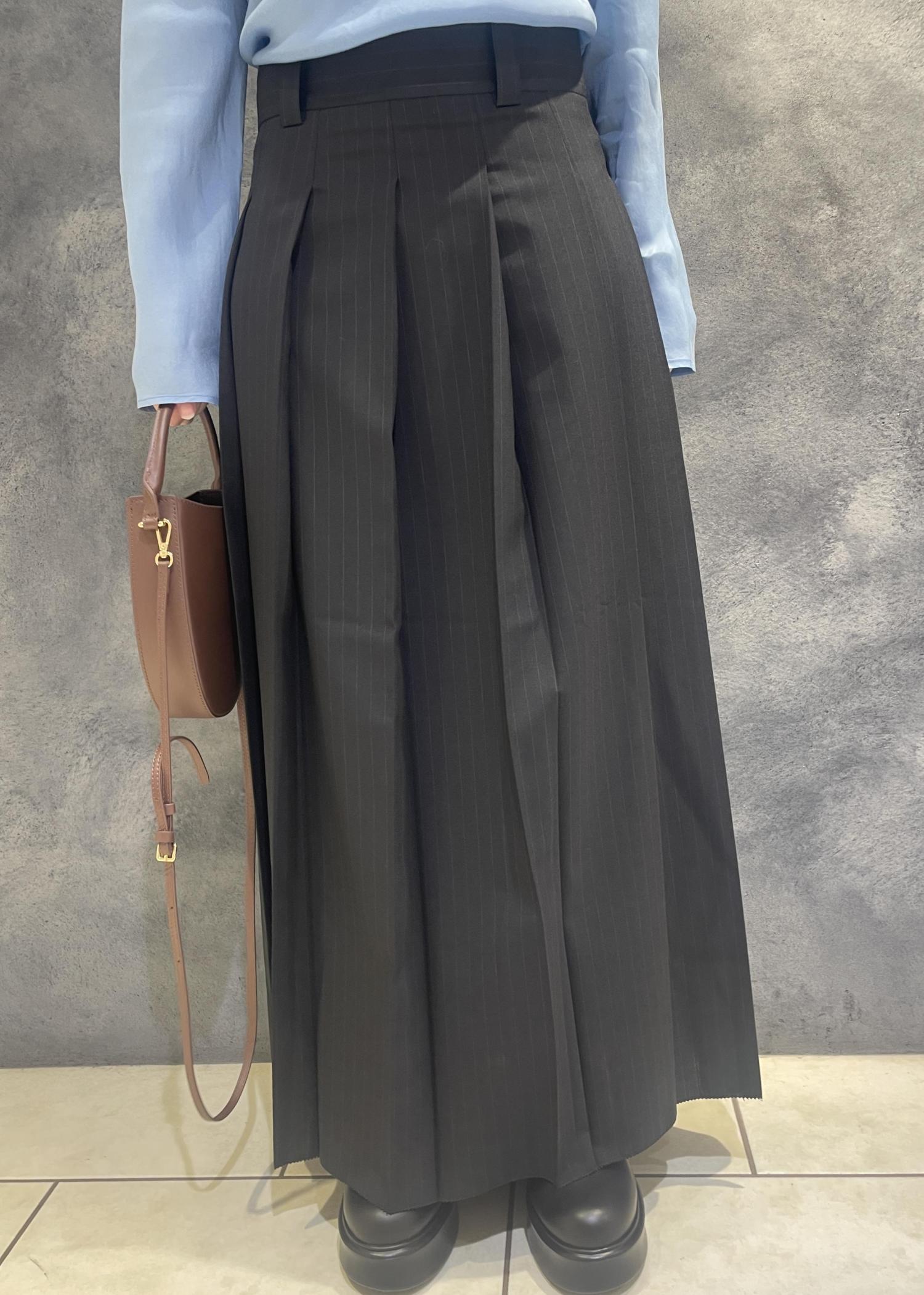 EMOELLE【EMOELLE】フロントプリーツスカートブラック系 / 36¥29,700レビュー160cm36サイズ着用で、地面につきそうな丈感で、広がりはなくストンとしたシルエットなのでモードめな印象です。スリットが開いているので足捌きも良く、動きやすいです◎ ブラウンとブラックの2色で、ブラックは細かめのストライプ柄になっております