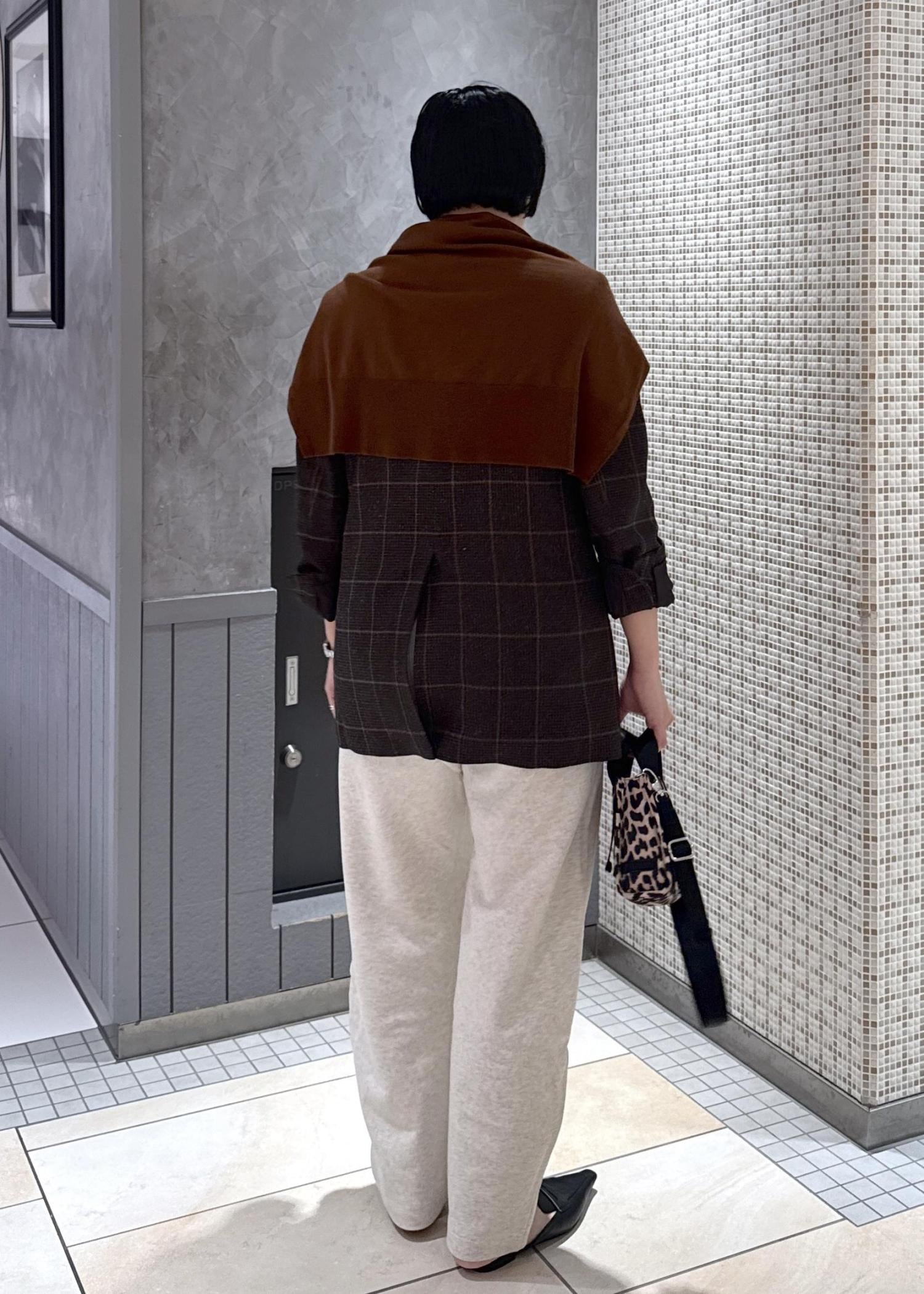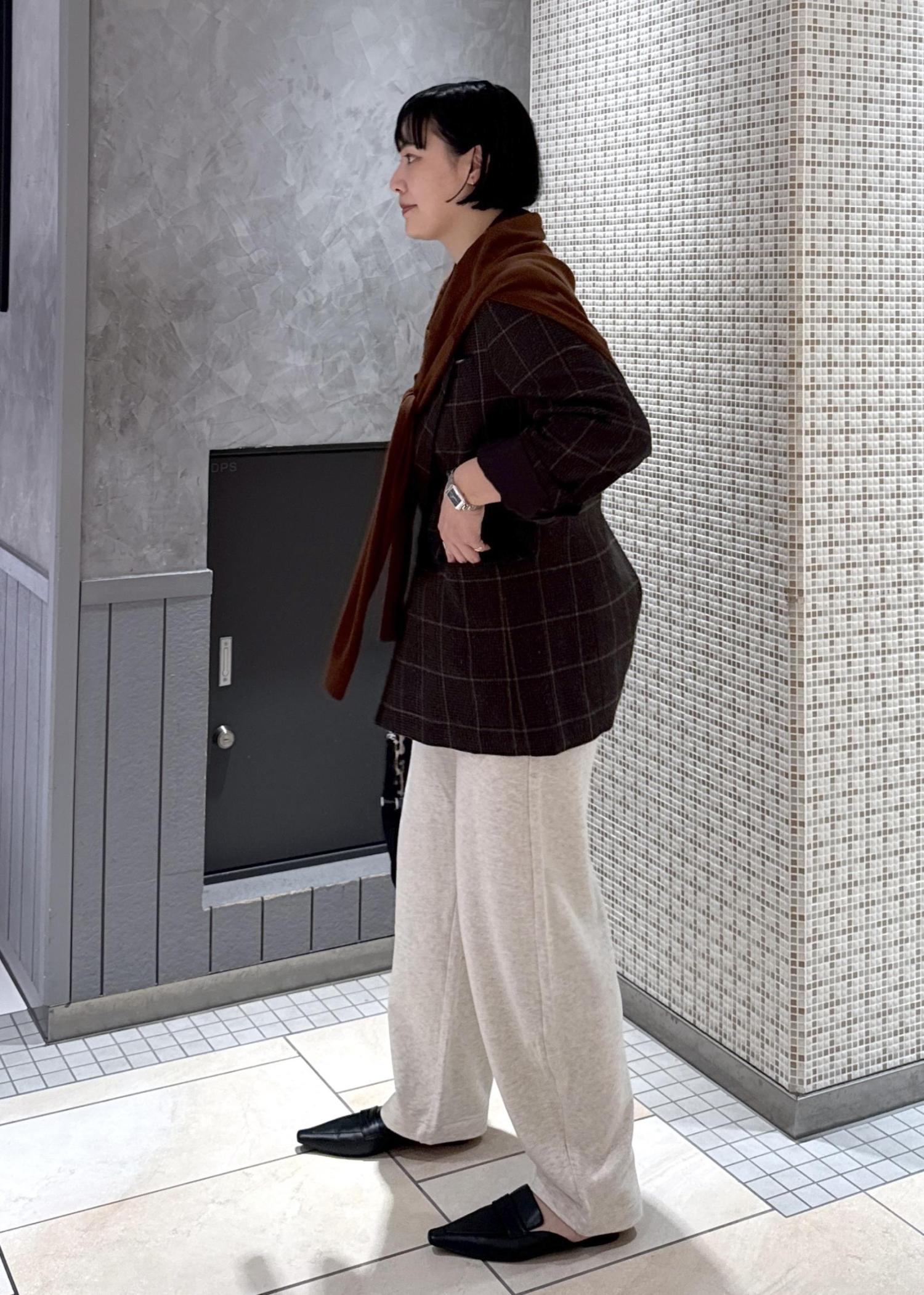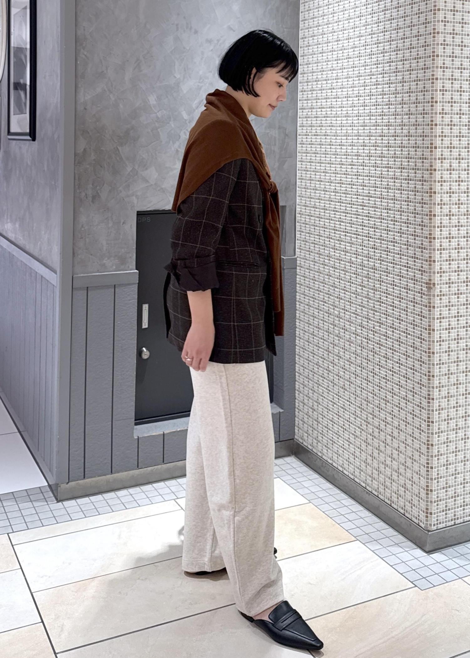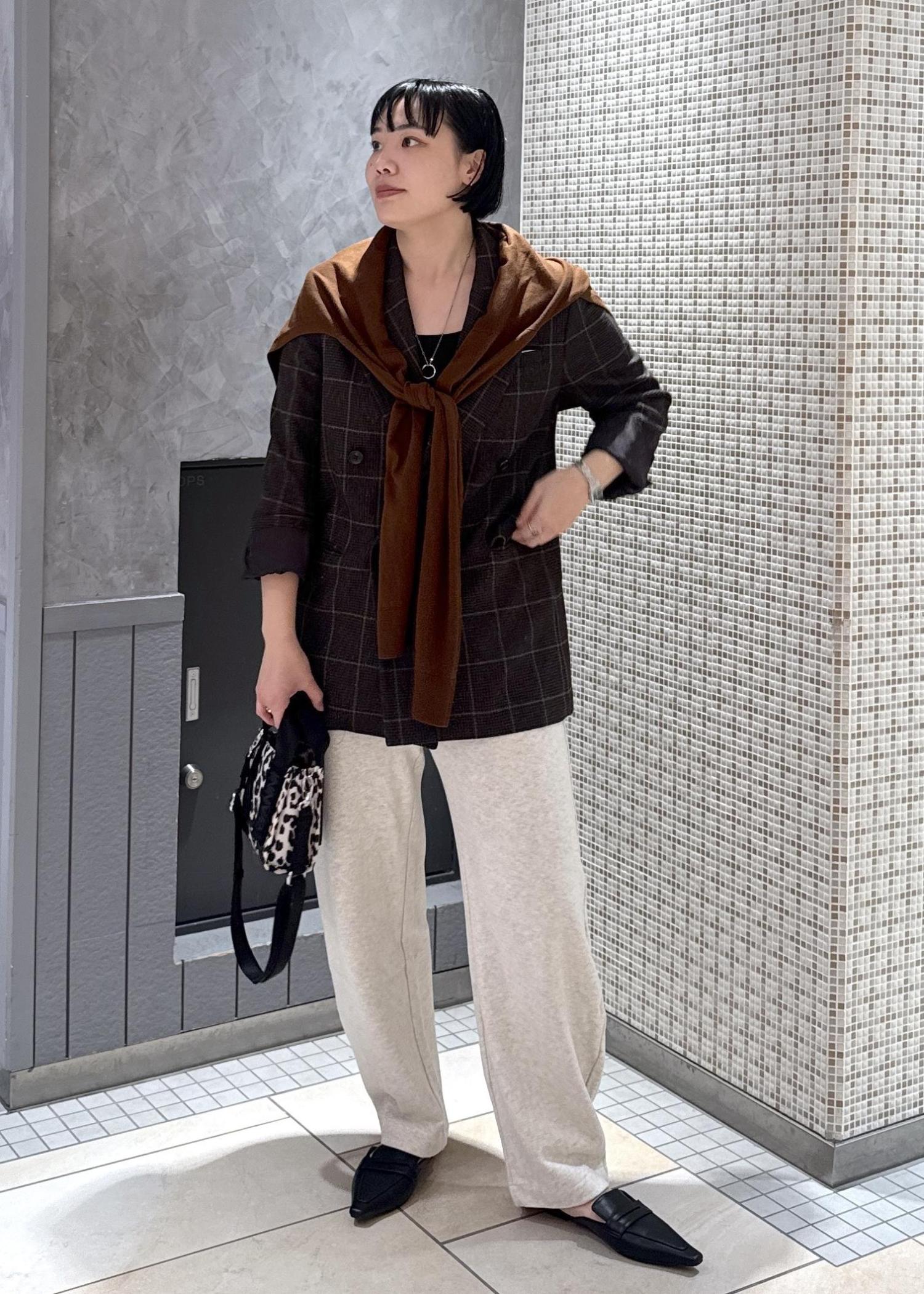 ジャケットできちんと感が出るので、カジュアルなスウェットパンツを合わせてもカジュアルすぎないスタイリングに。