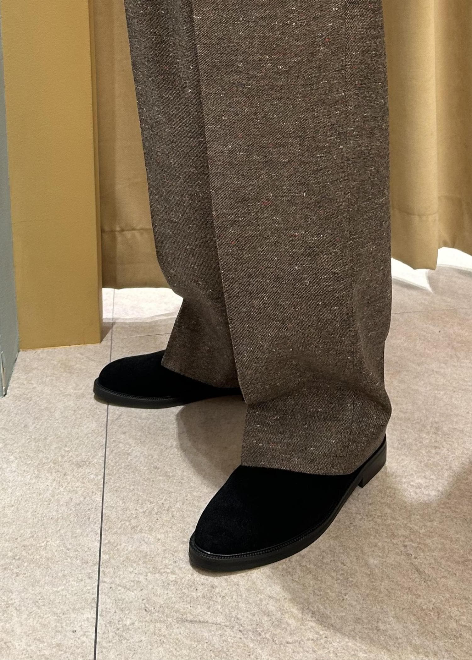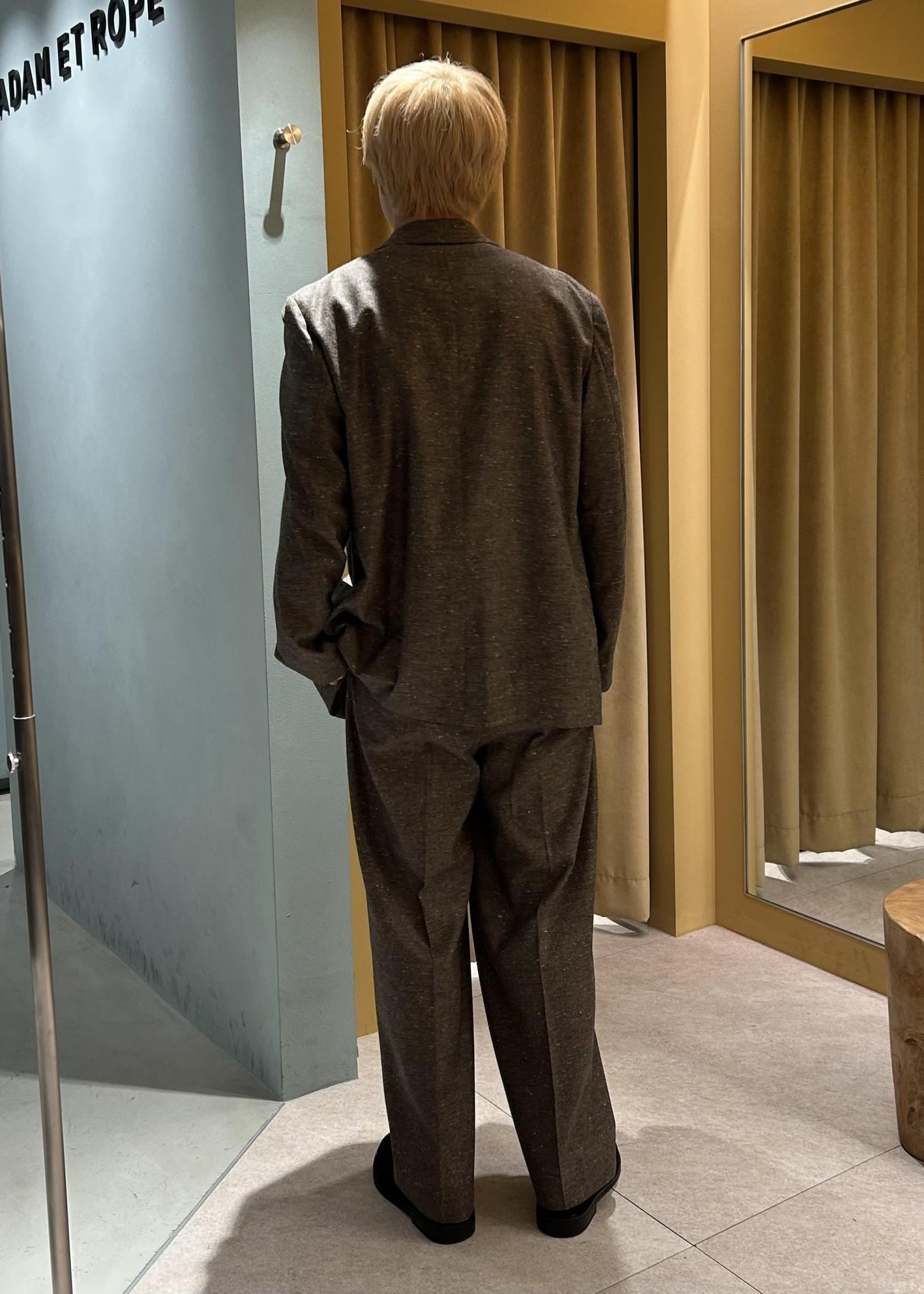 ADAM ET ROPÉ HOMMEハードクロス 2プリーツ スラックスダークブラウン系 / M¥35,200レビュージャケット同様ツイード素材のパンツです。ワイドテーパードのシルエットなので他のアイテムとも相性よくバランスの取れたパンツです。