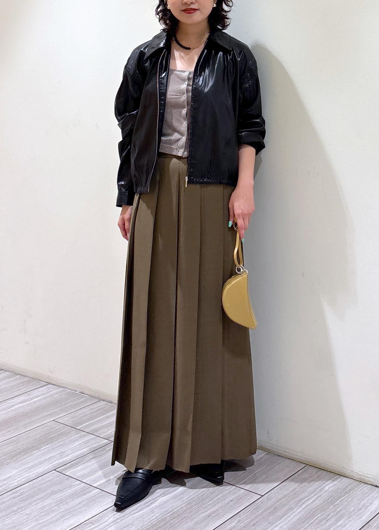 フロントにプリーツが施されたマキシスカート。