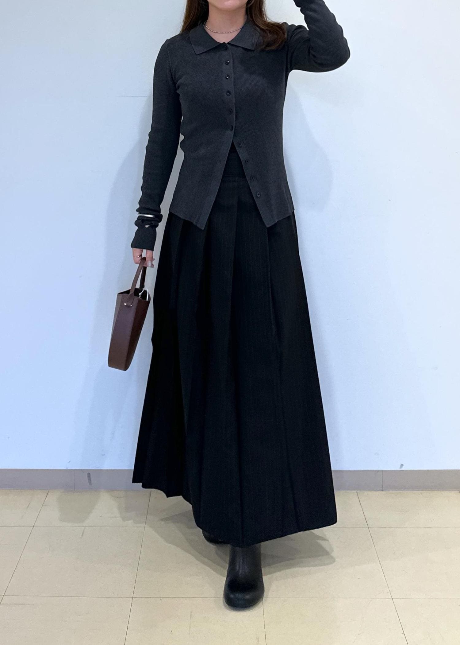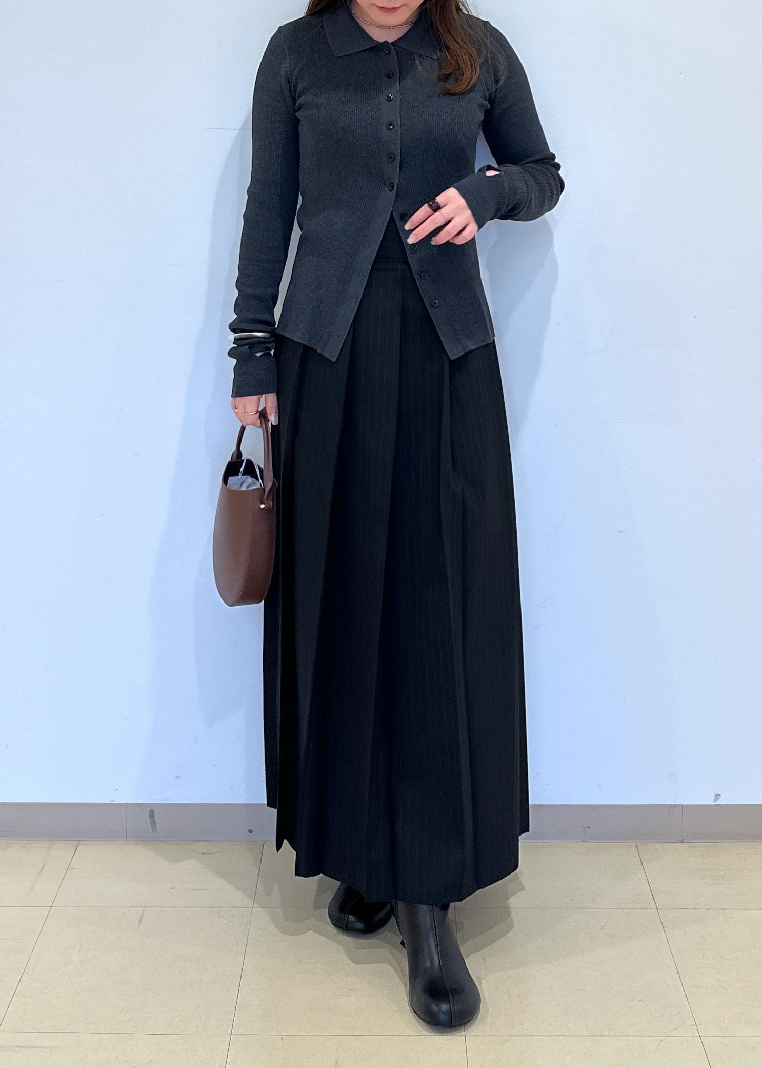 薄手のリブニット、襟付きで綺麗めに着ていただけます。少し身体にフィットするサイズ感でヘルシーな印象になります♡