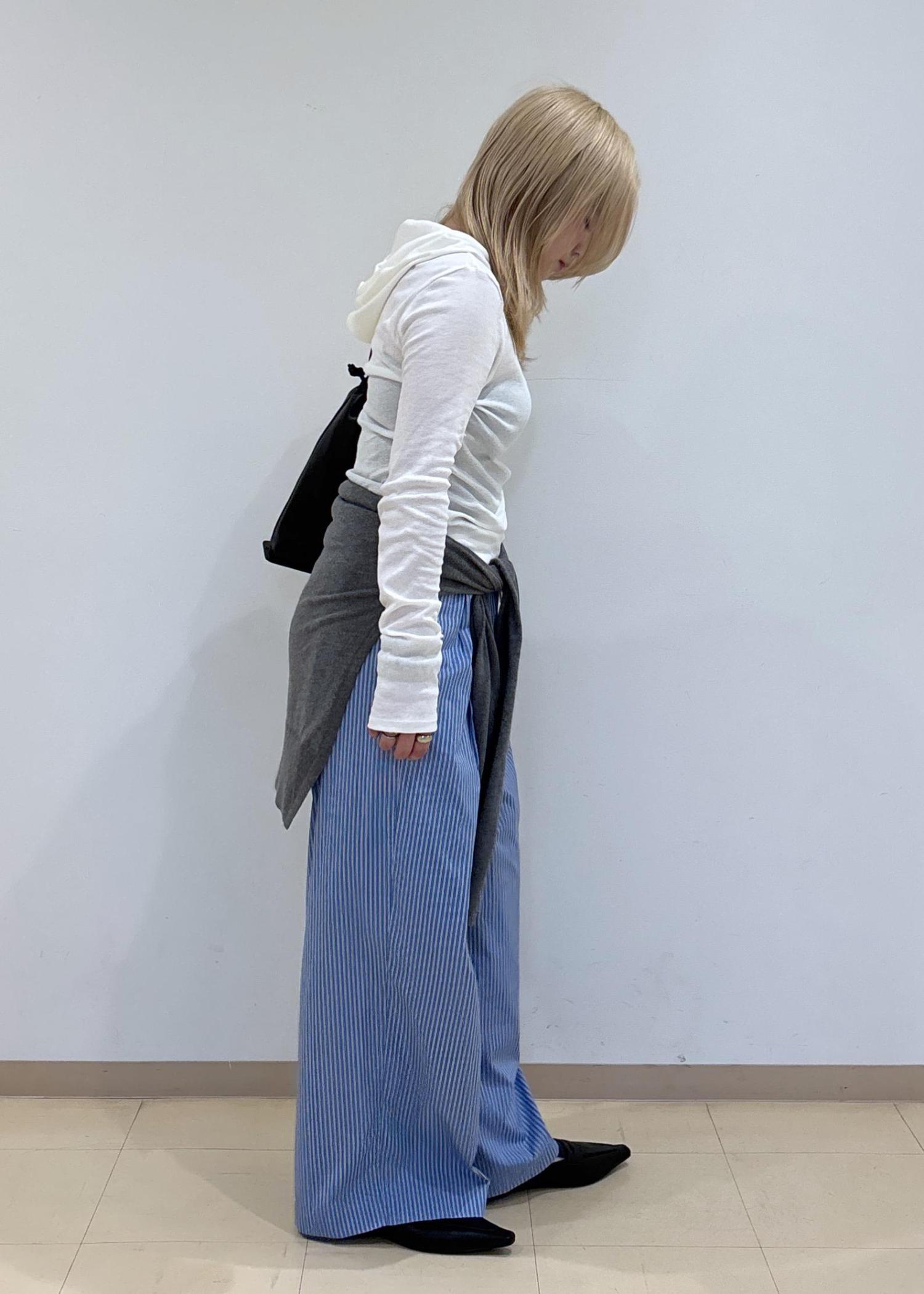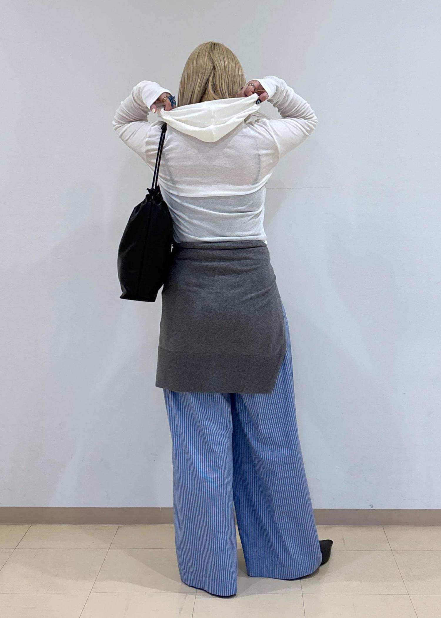 カットソーは、シアー感があり1枚でもインナー使いもでき、フードがトレンド感があり万能アイテムです。