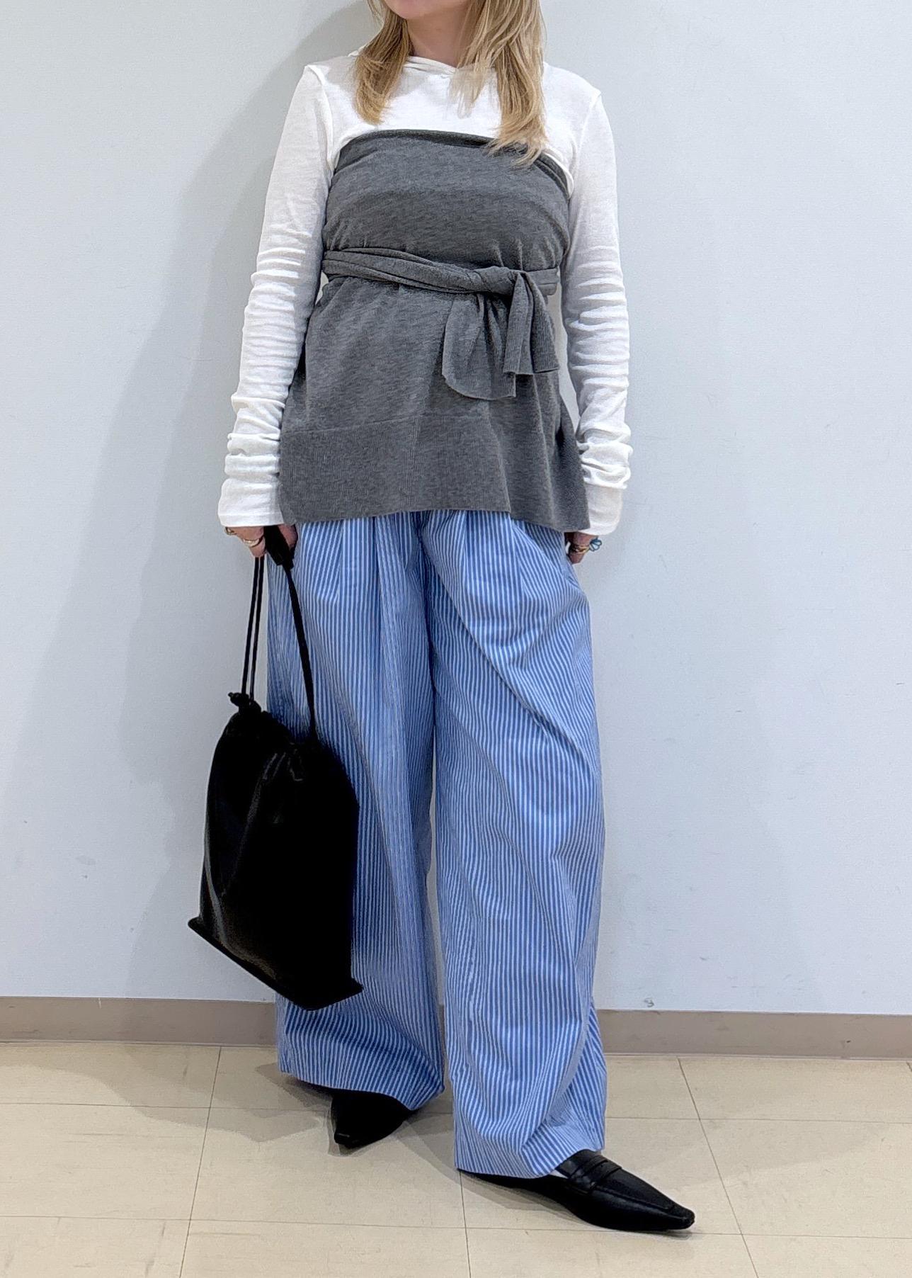 新作のスラックスとカットソーを合わせたコーディネートです。