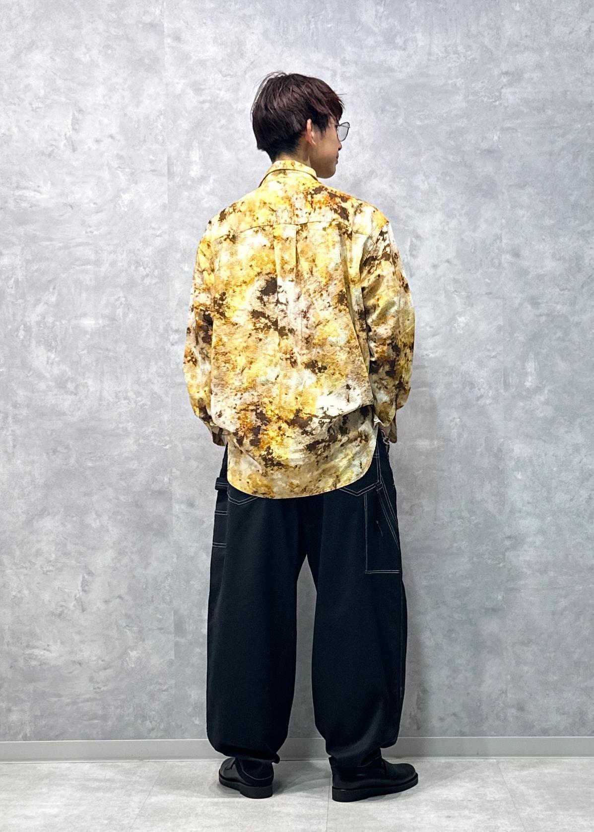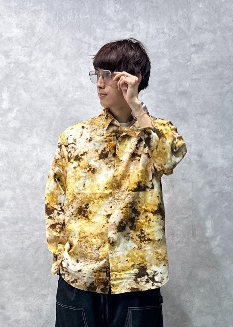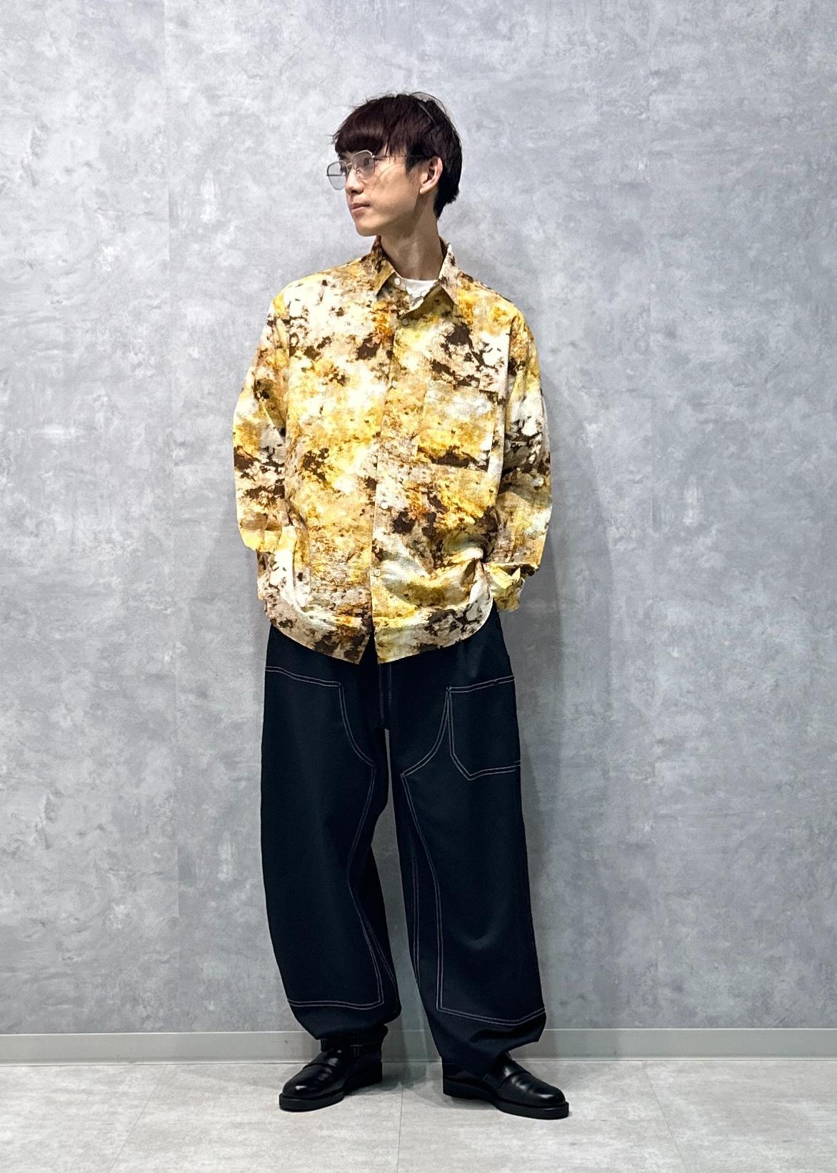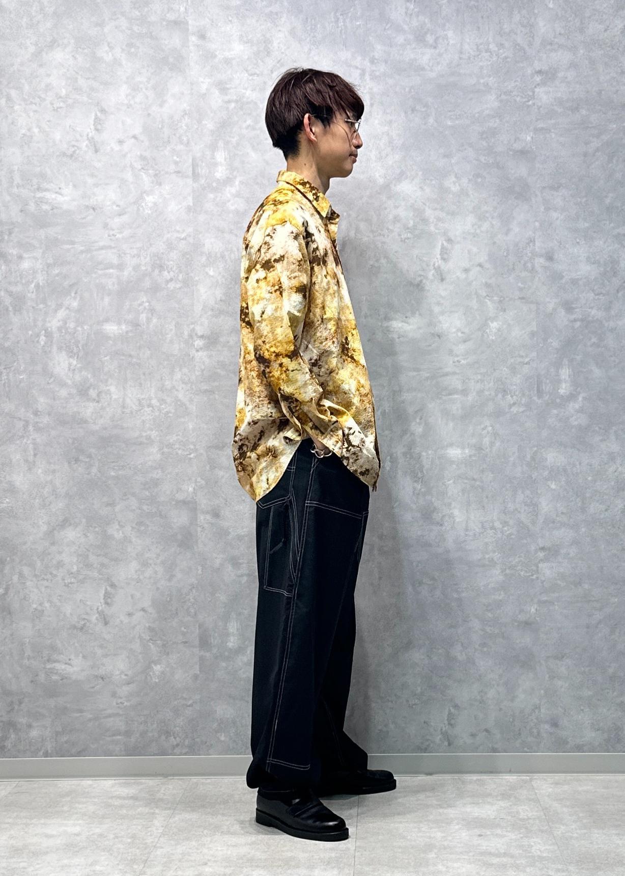 黄色の柄シャツを主役にしたコーデです。シンプルにシャツ以外をモノトーンでまとめてシャツを目立たせました。ローファーを履くことでキレイめな印象にし、柄シャツがうるさくなりすぎないようにしました。