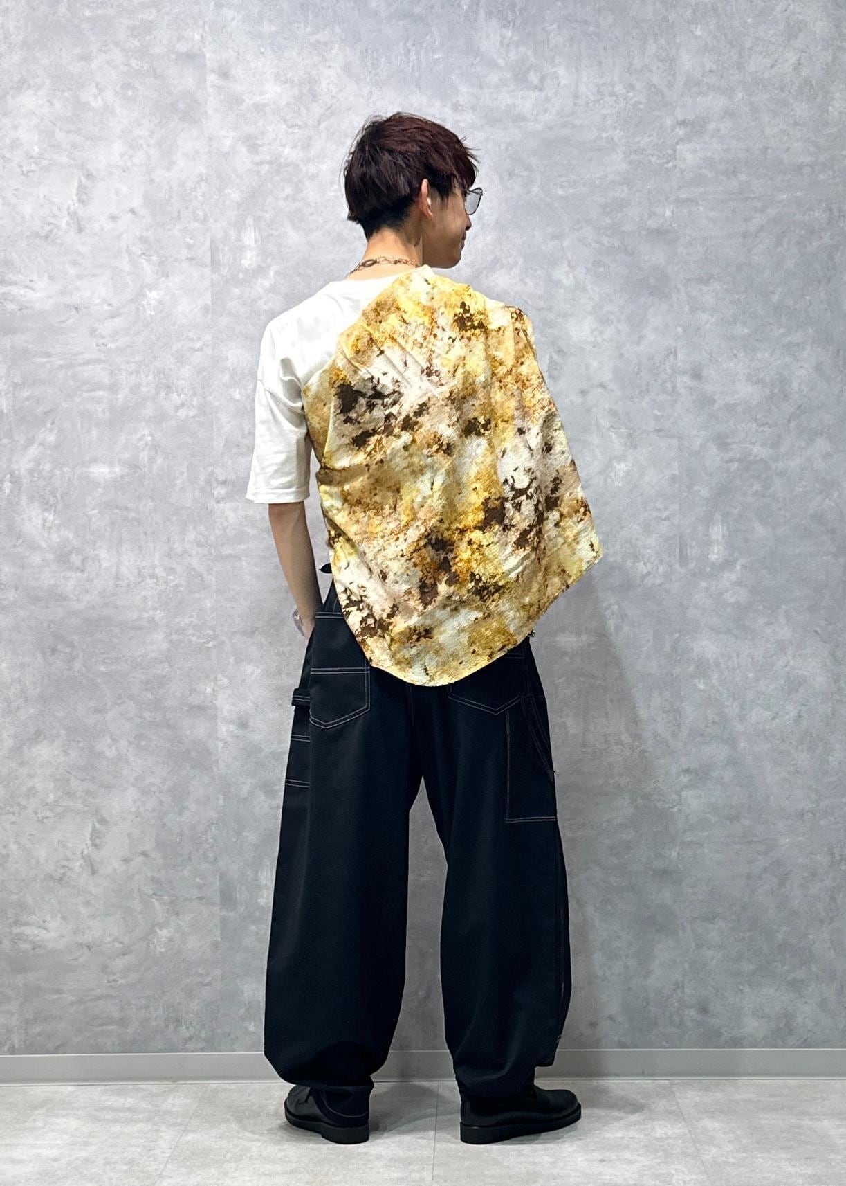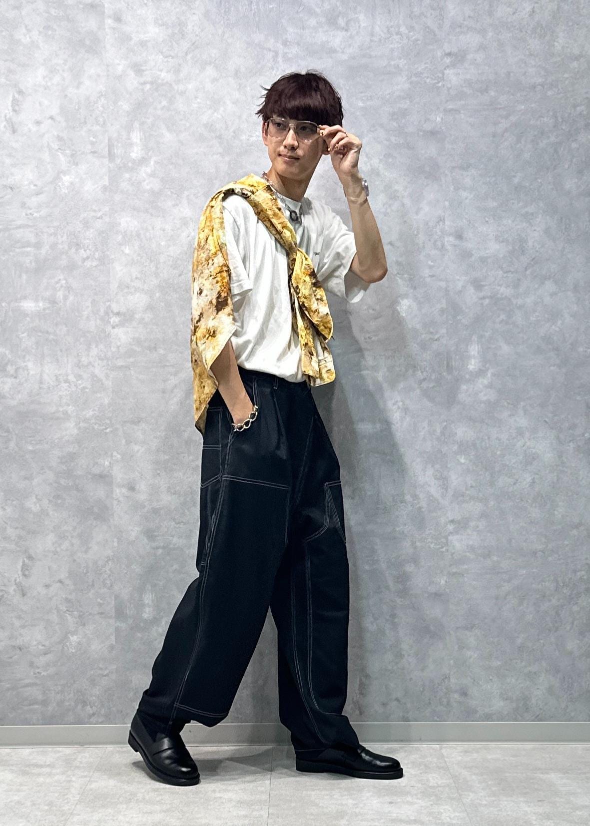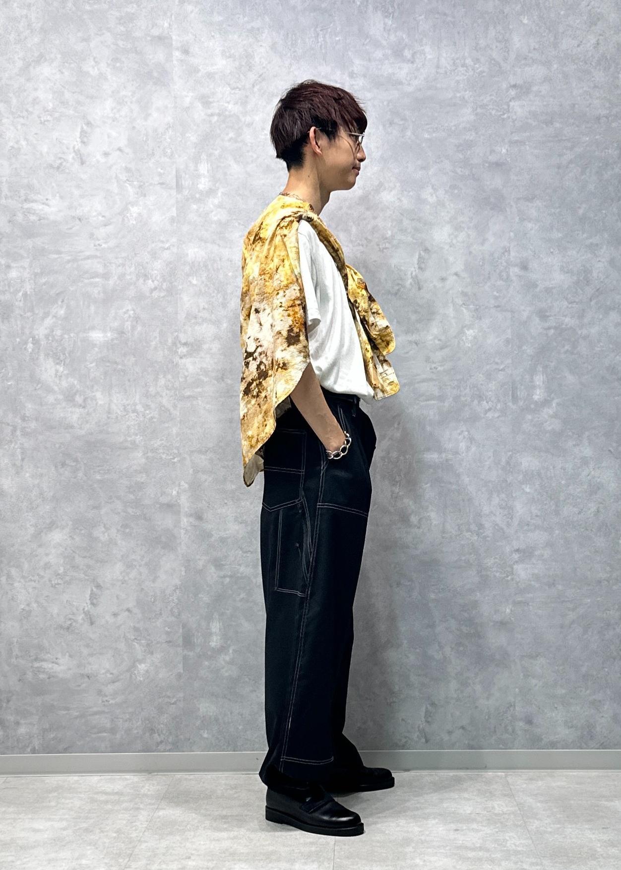 黄色の柄シャツを主役にしたコーデです。シンプルにシャツ以外をモノトーンでまとめてシャツを目立たせました。ローファーを履くことでキレイめな印象にし、柄シャツがうるさくなりすぎないようにしました。