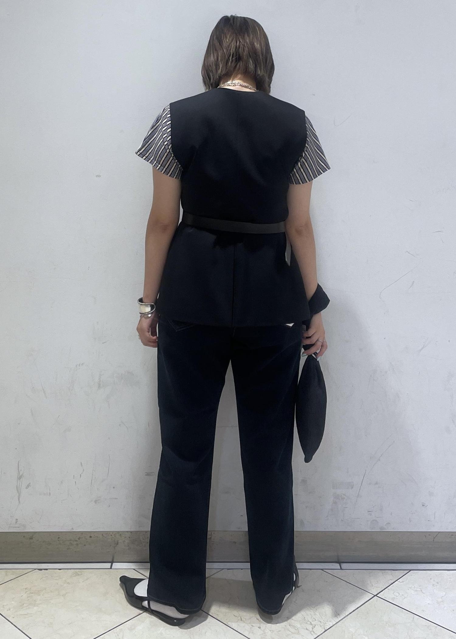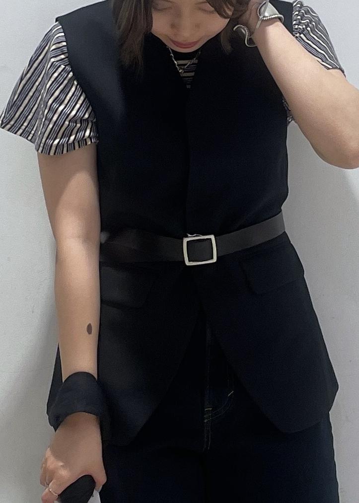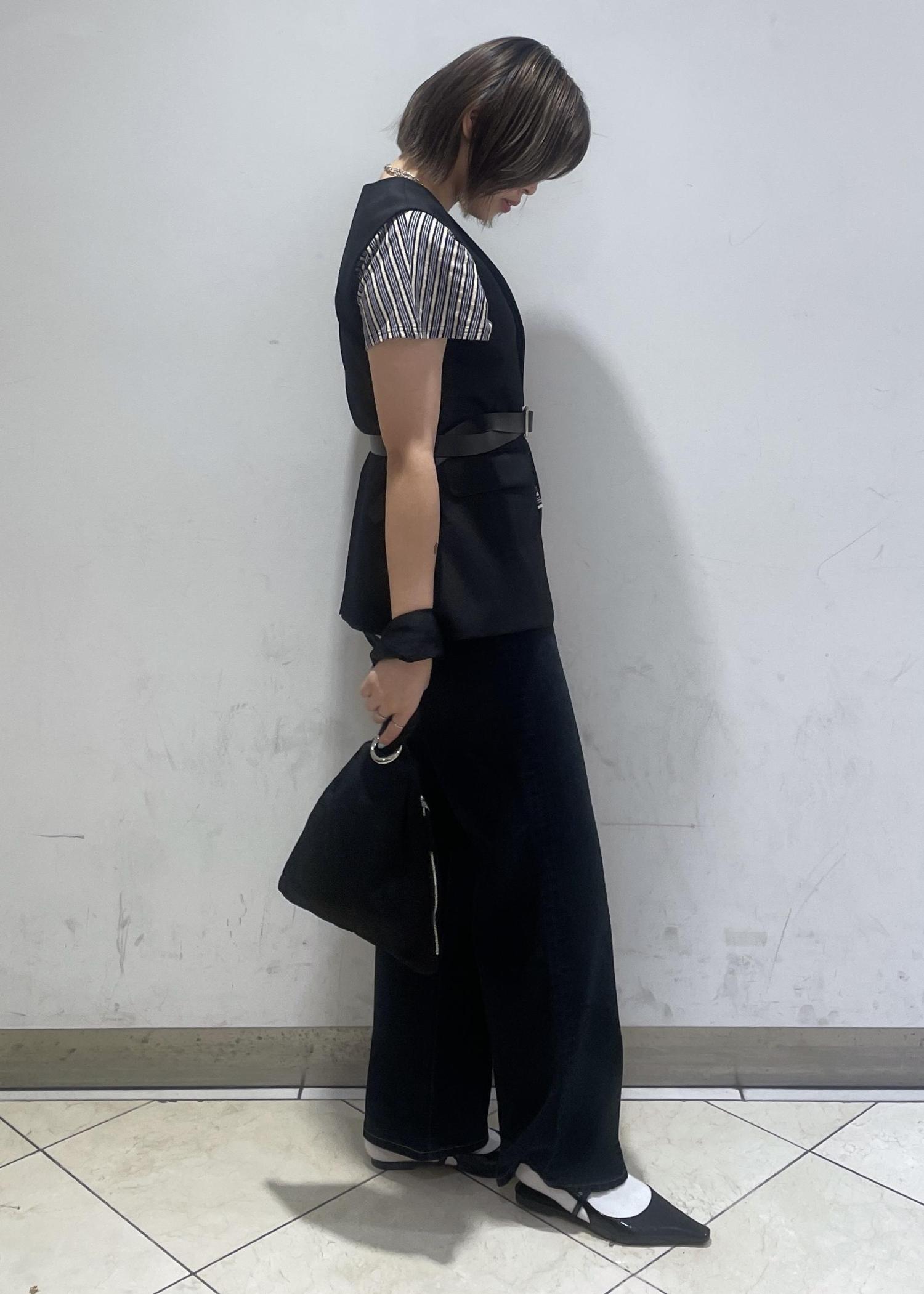 ジレの中に着ているボーダートップスがProvokeのものです♡今回はジレをレイヤードしていて見えないのですが、横側にシャーリングが施されていて、他にないシルエットになっていますので是非チェックしてみてください☺︎