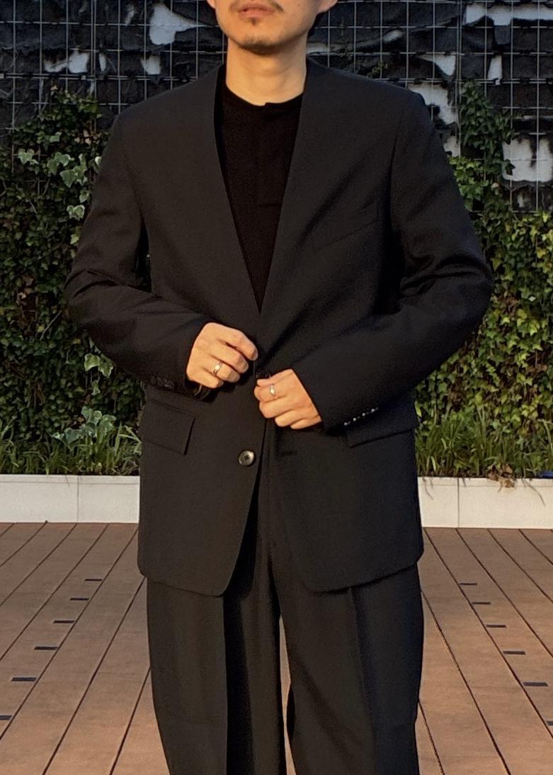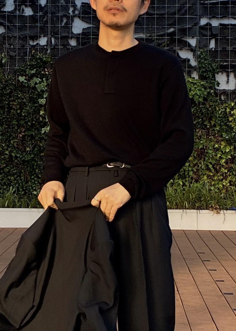 ややゆったりめのサイズ感で、僕自身肩幅がありますがMでも問題なく、厚手のニットを着ても窮屈感はありませんでした。今回着用のブラックカラーは、素材に張りがあり、光沢感がかなり美しく、かなり上品な印象にスタイリングいただけます。