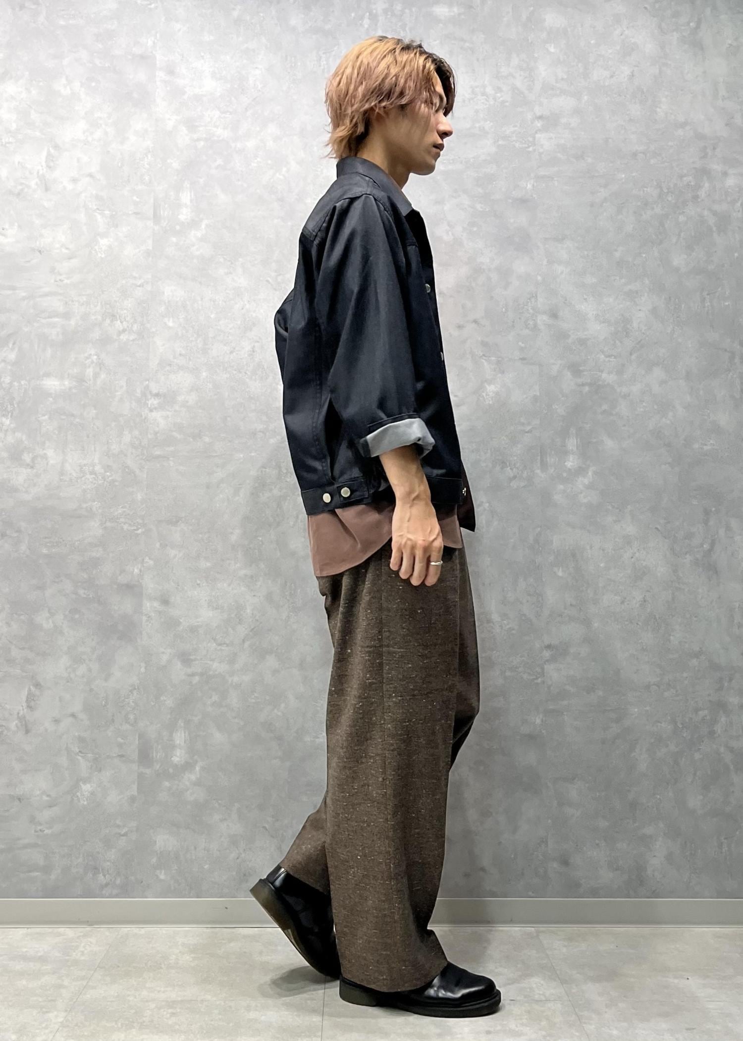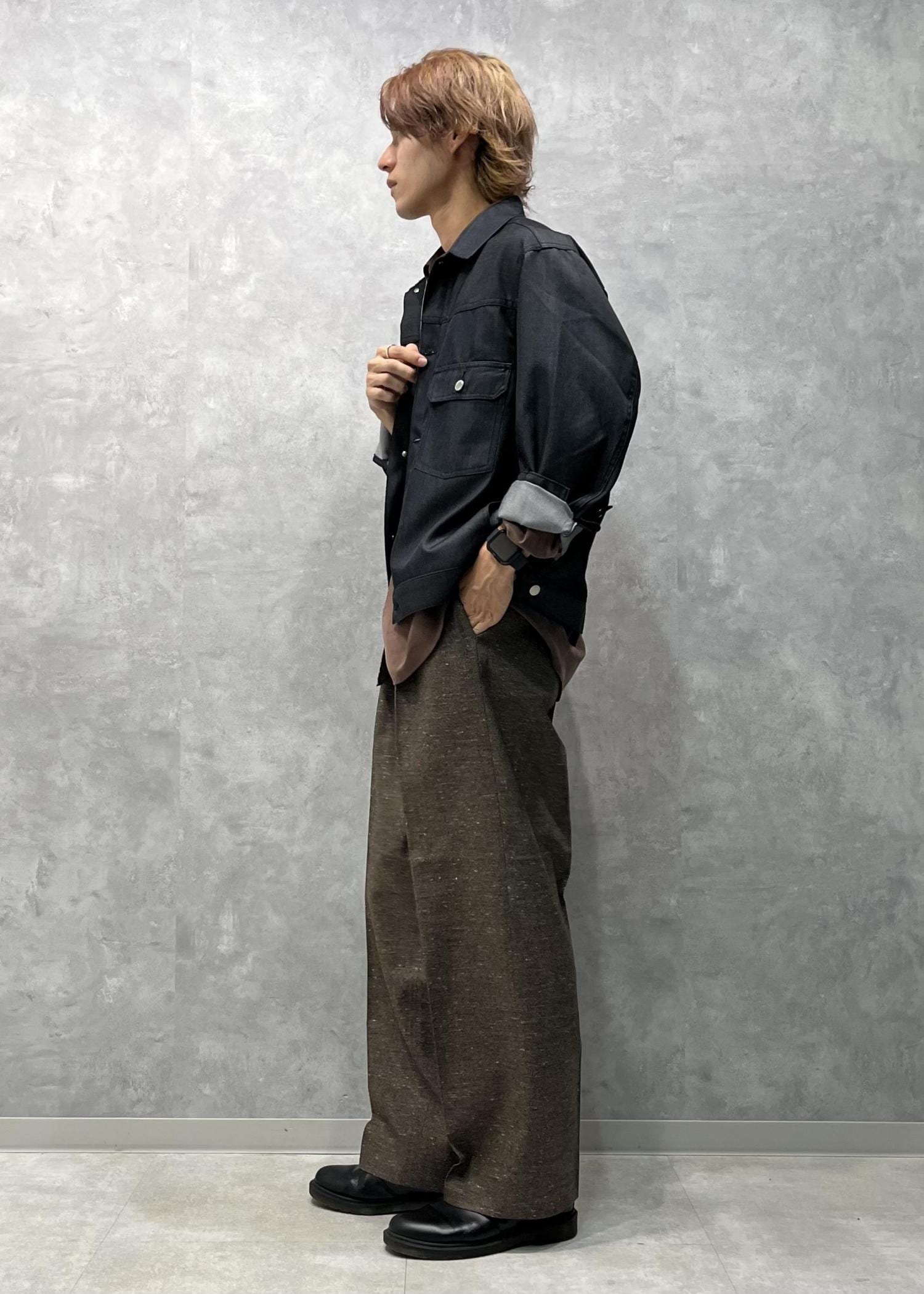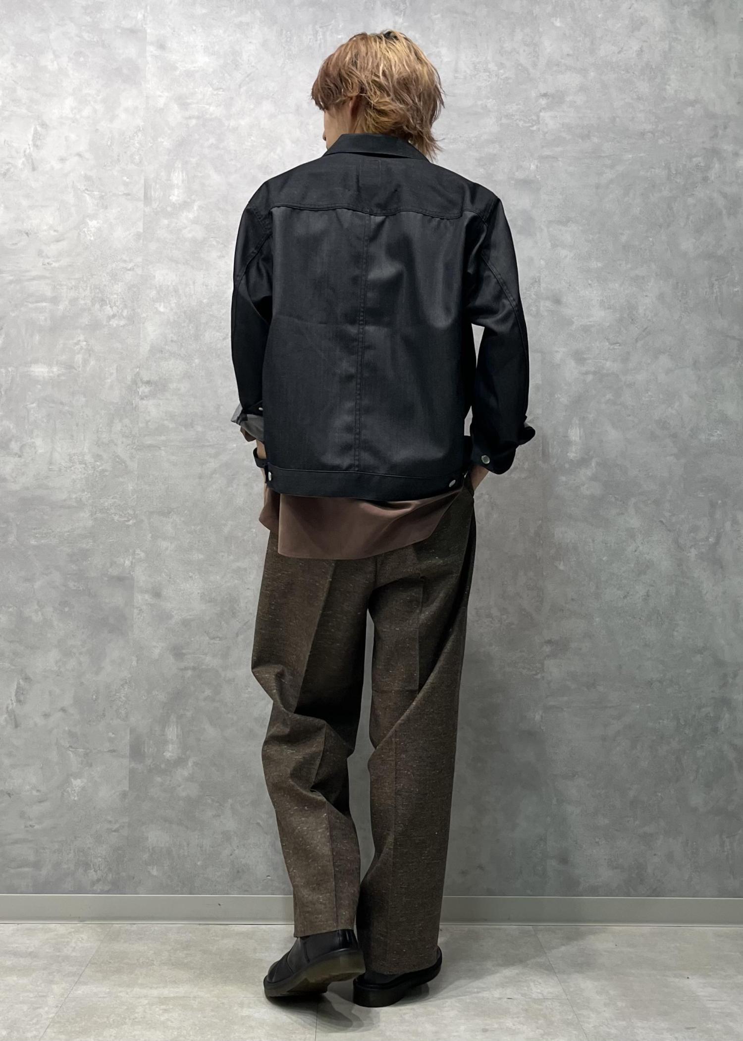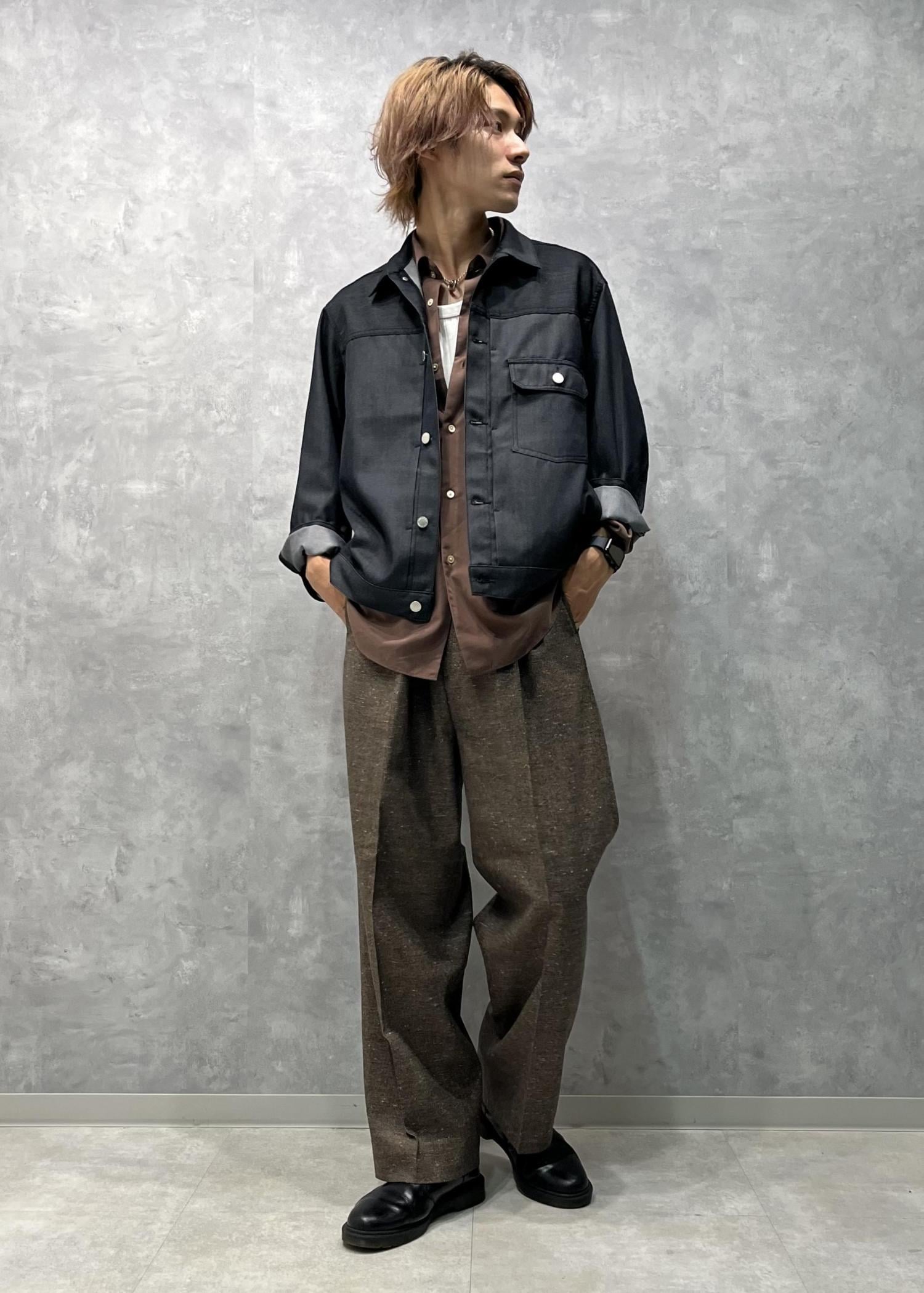 ブラウンでまとめつつグレーのジャケットでしめたスタイリングにしました。