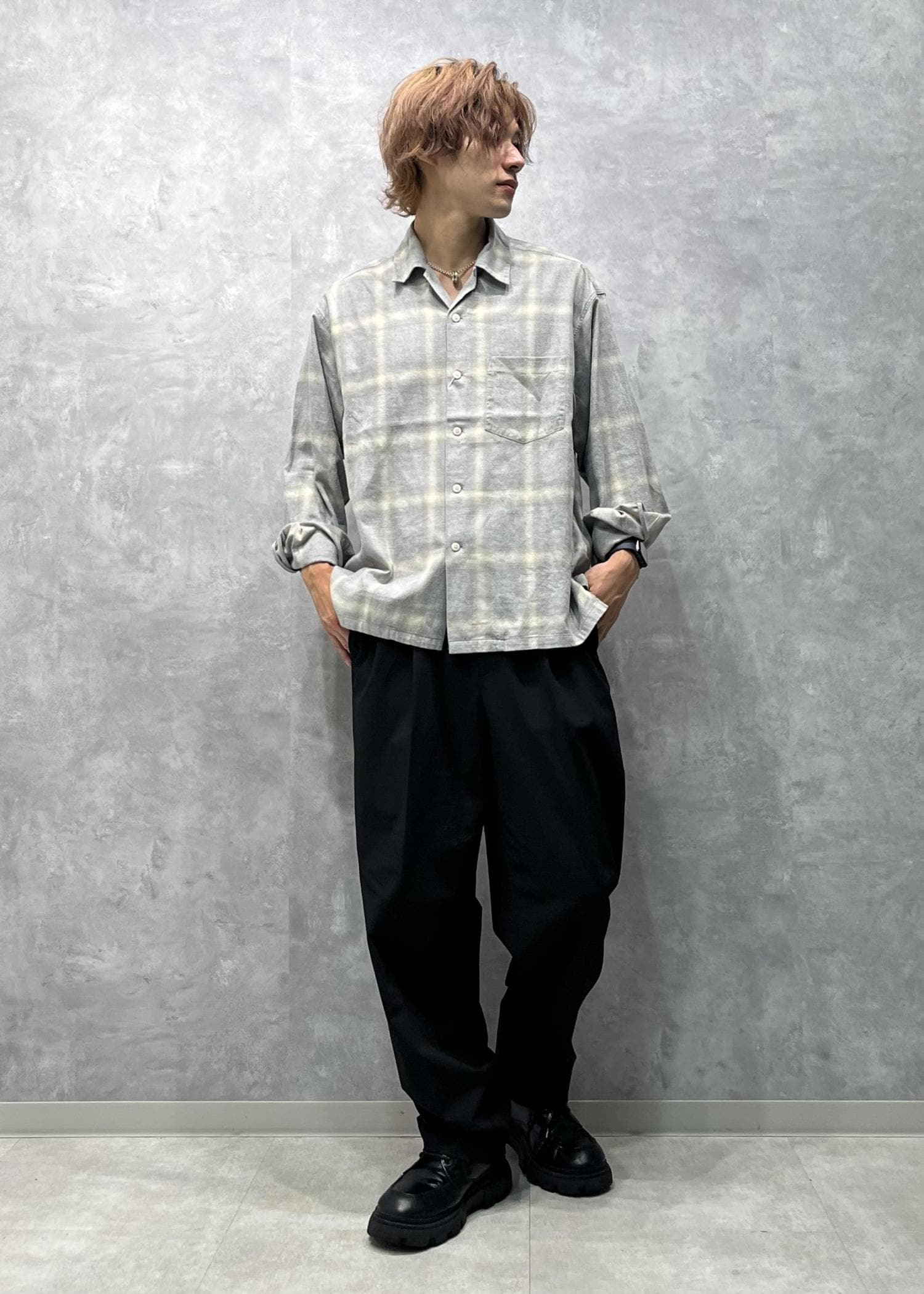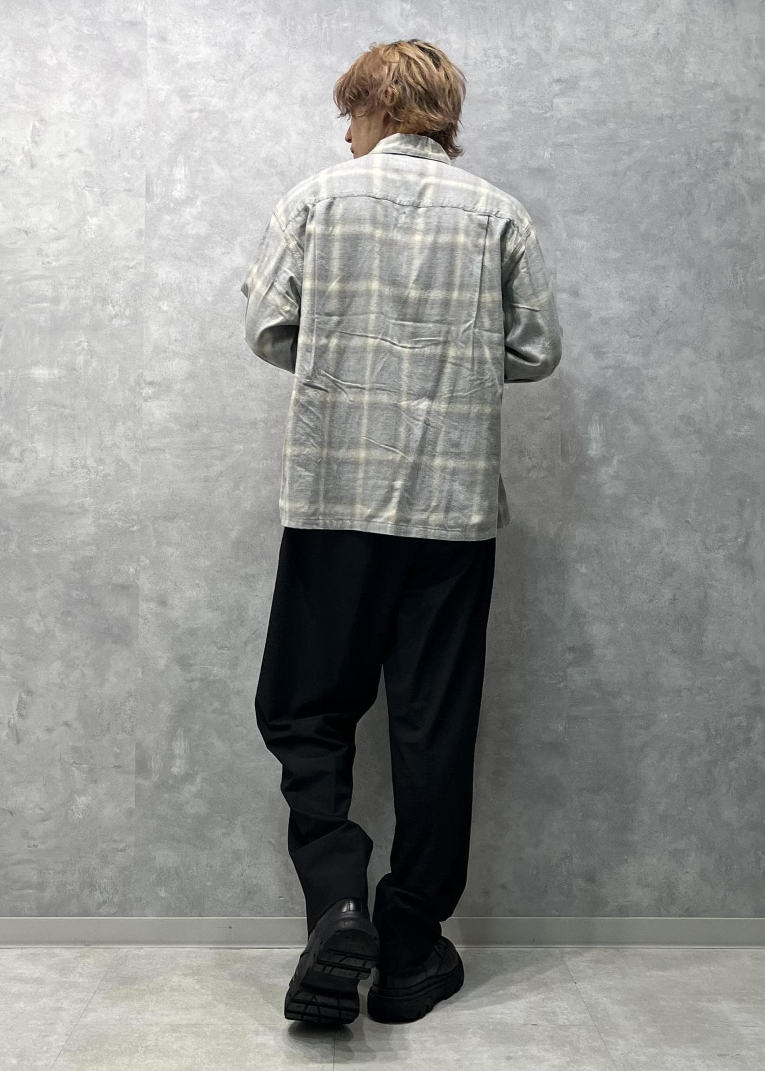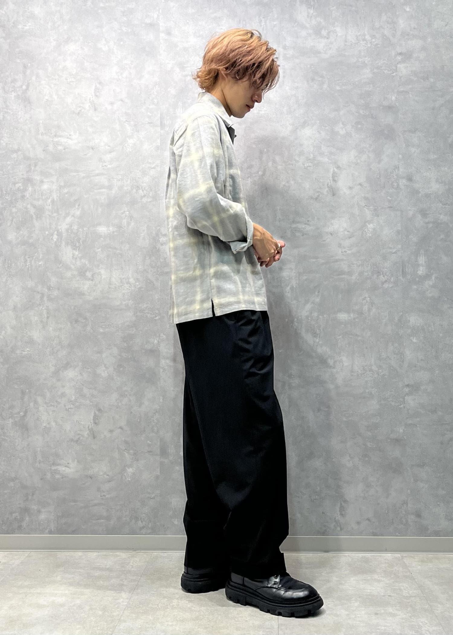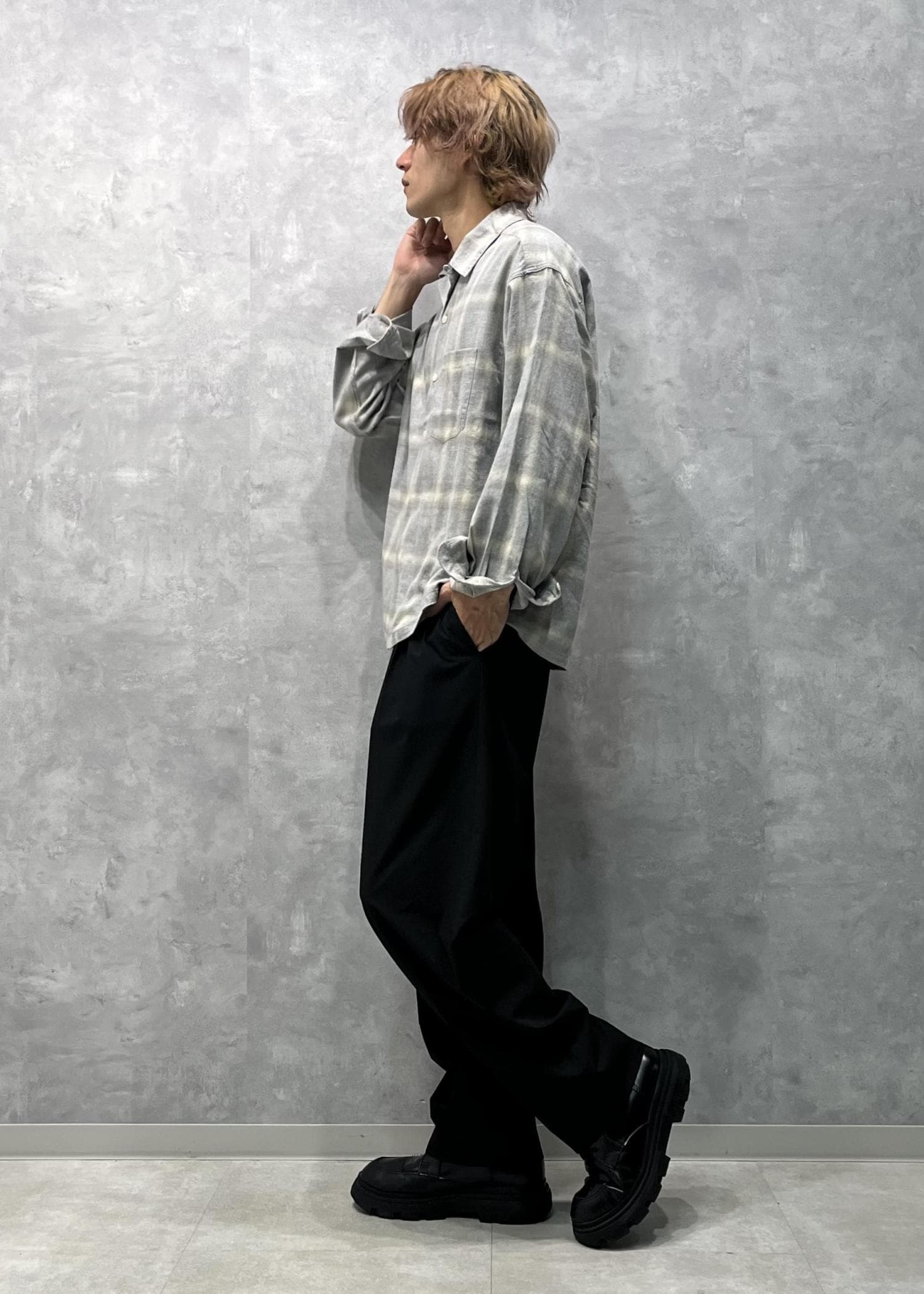 シンプルにスラックスとチェックシャツ合わせでキレイめカジュアルスタイリングにしました。