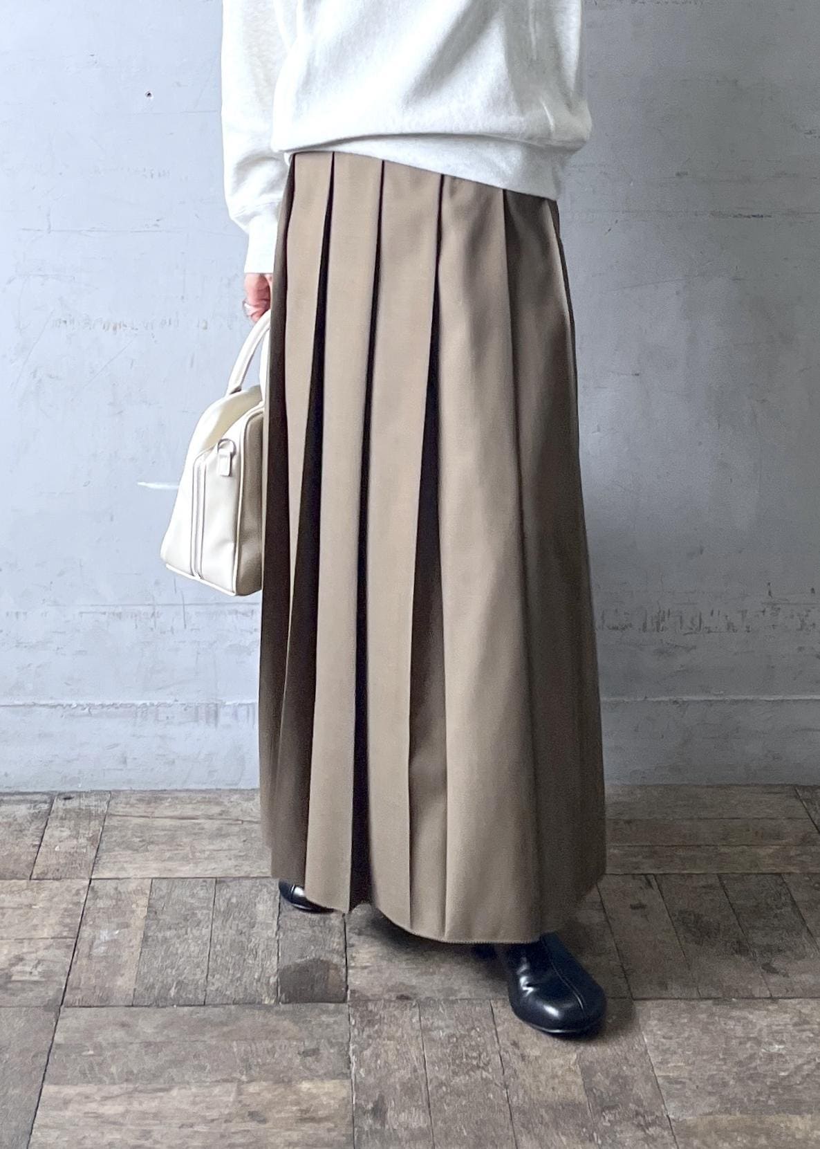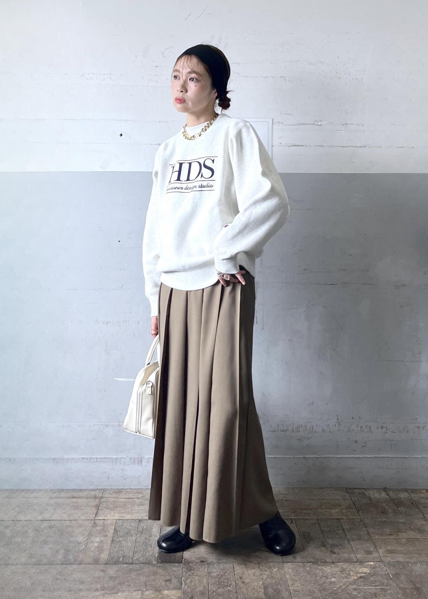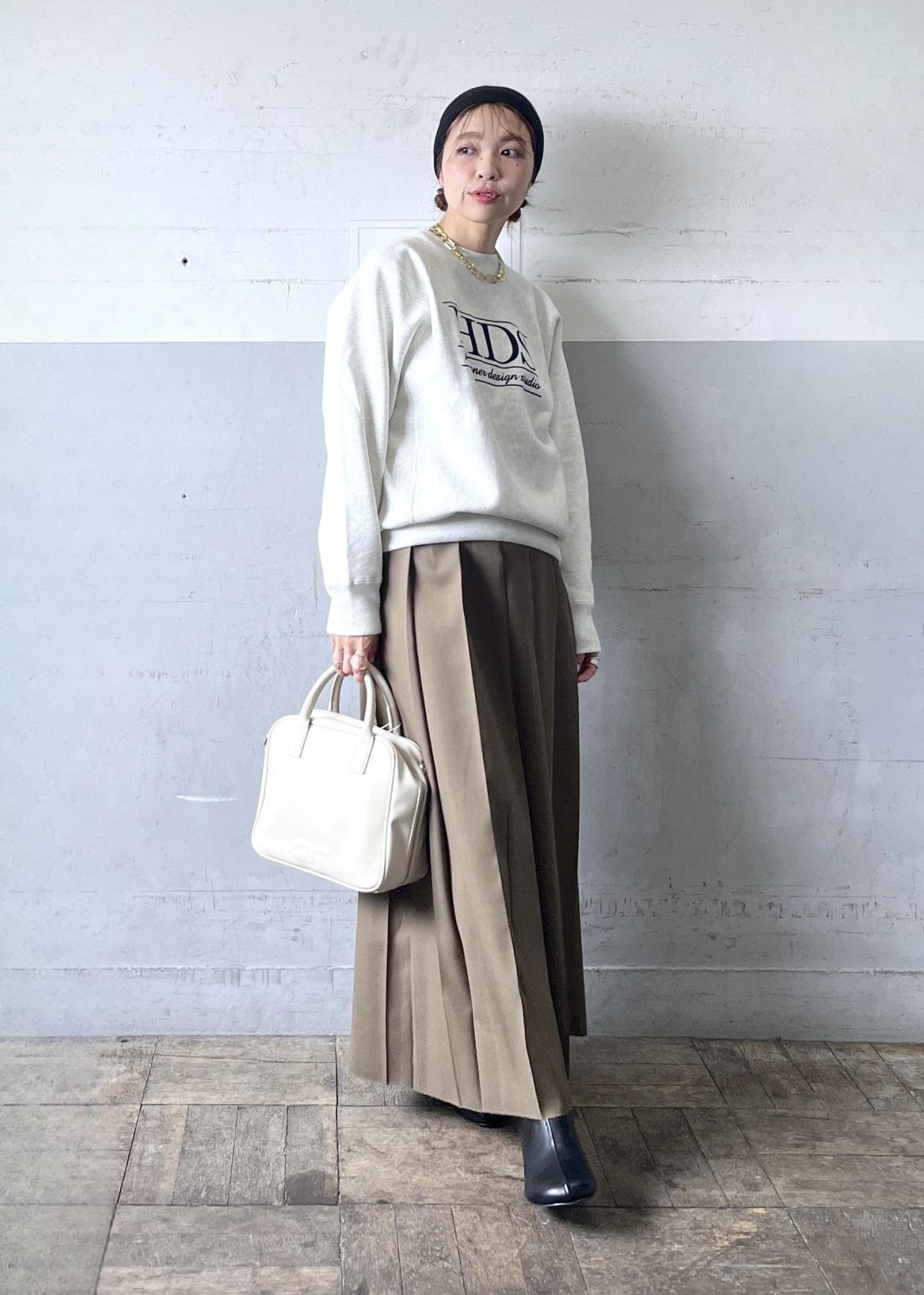 今回はプリーツスカートを合わせて女性らしさもあるスタイリングに。