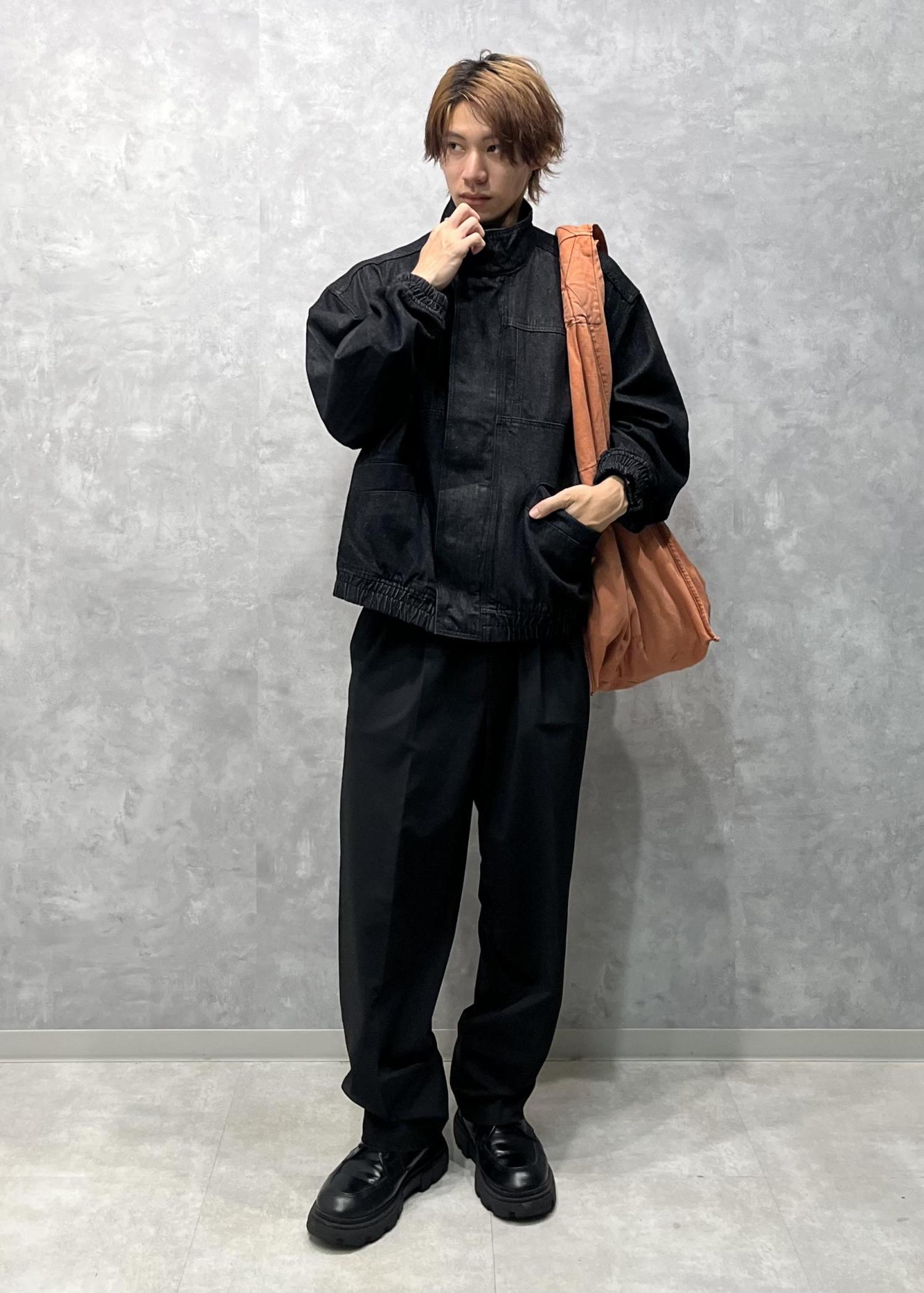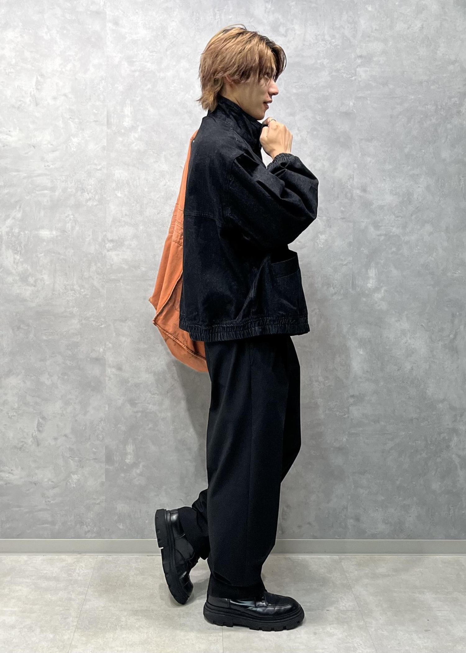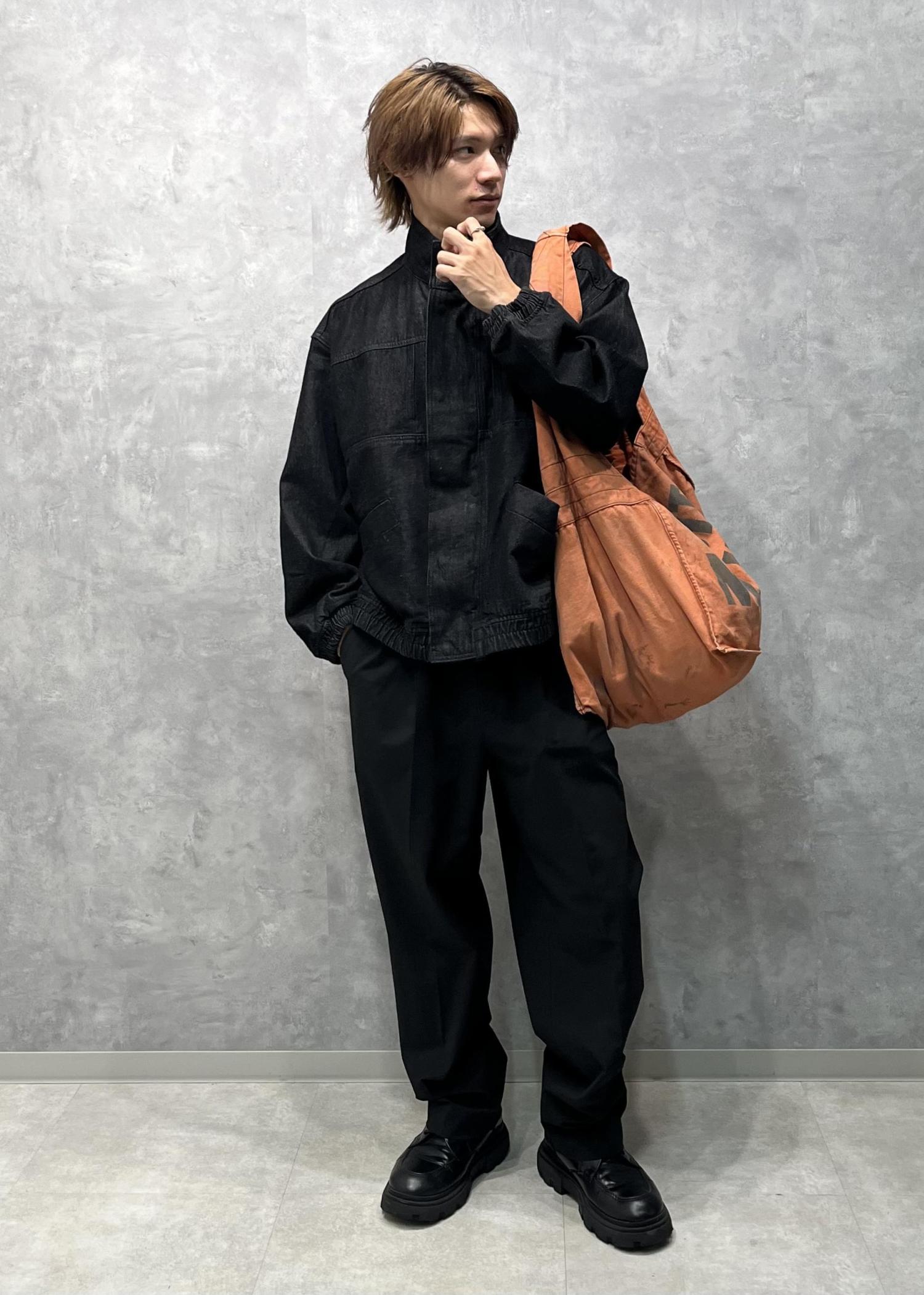 ブラックカラーワントーンでまとめてパンツはスラックスでカジュアルになりすぎないスタイリングにしました。