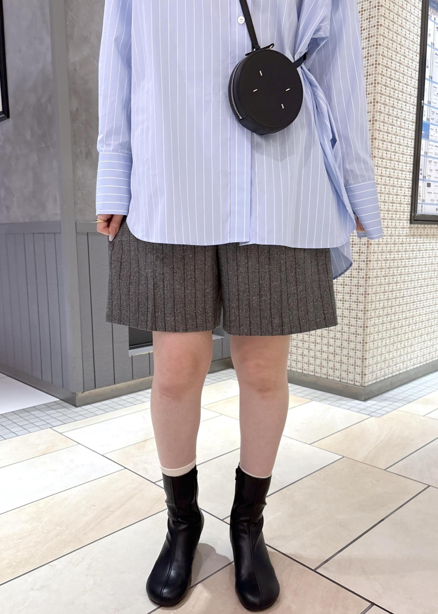ブルーのストライプシャツにグレーのショートパンツ合わせで爽やかさを出してみました!