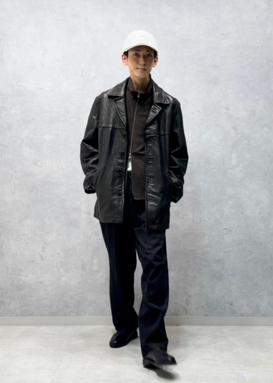 ブラウン、ベージュの秋カラーをアクセントにしたレザージャケットコーデです。黒をベースに、モードさがありながらもラフな印象に仕上げました。ジップブルゾンをドライバーズニットのような使い方をしたのもポイントです。