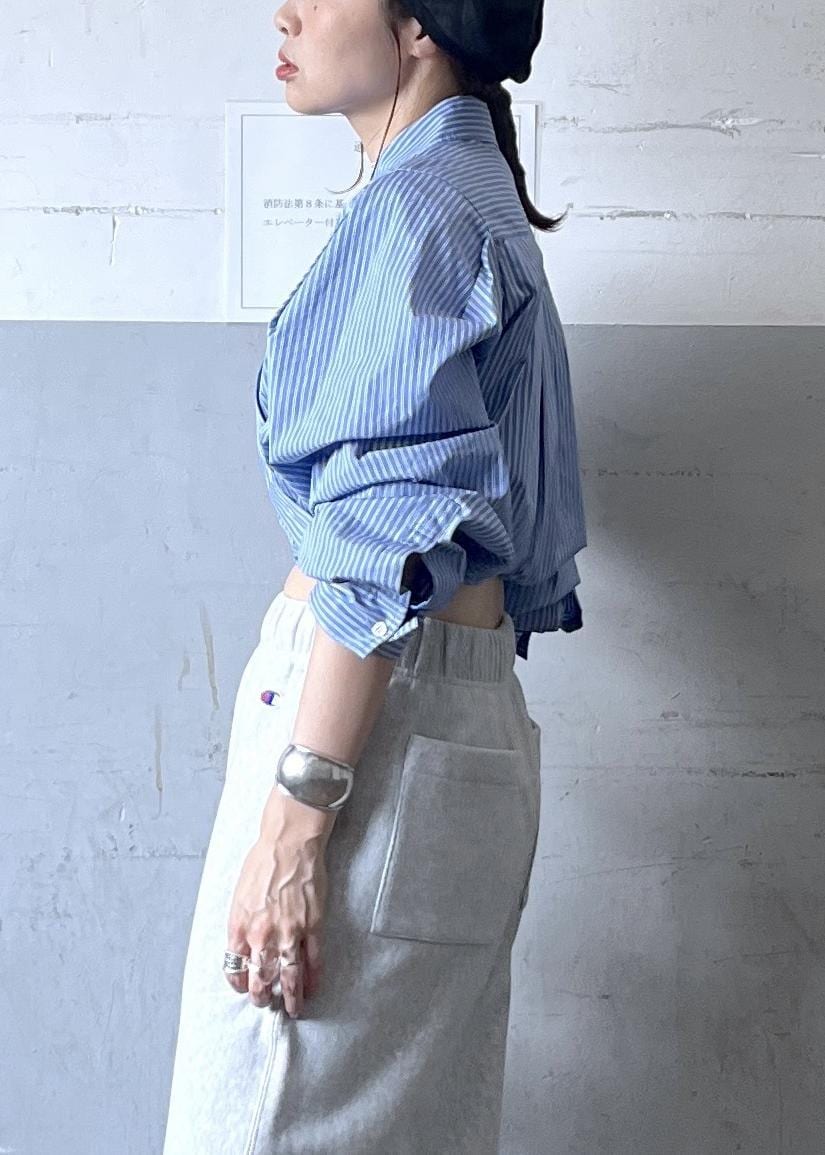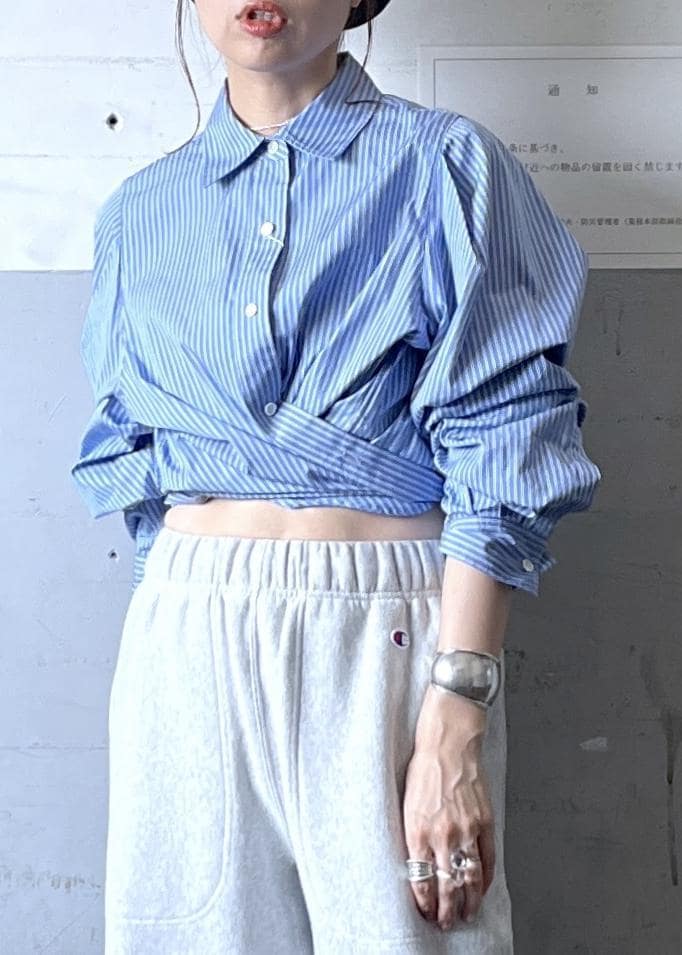 オーバーサイズのシャツを腰に巻き付けてコンパクトなサイズ感にアレンジ。