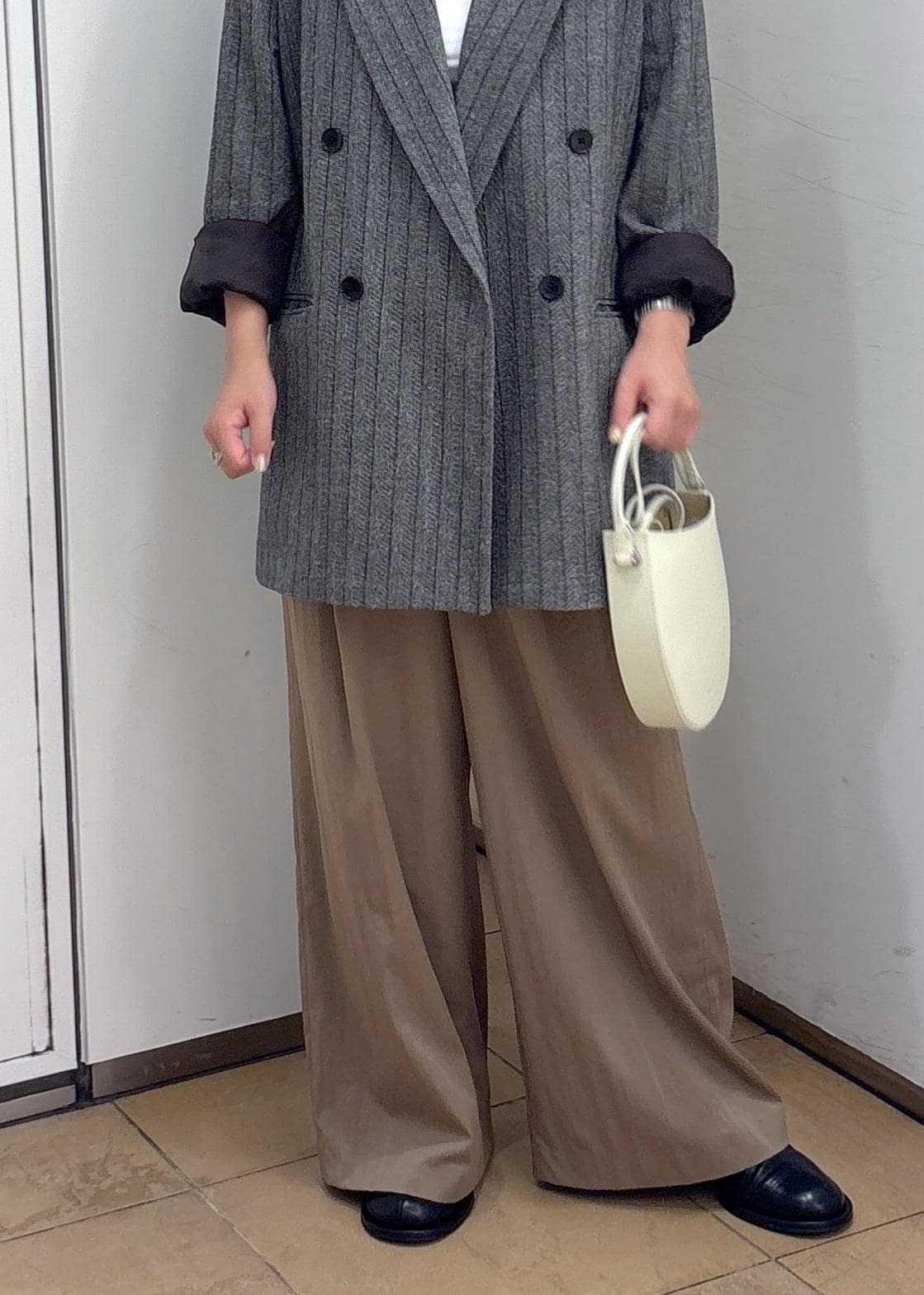 ウエストが黒のサタンベルトなので、ベルトを着用しなくてもスッキリした印象に見えるパンツです。