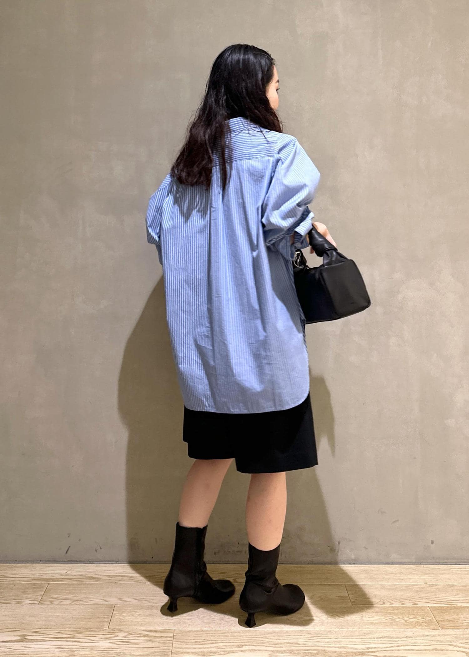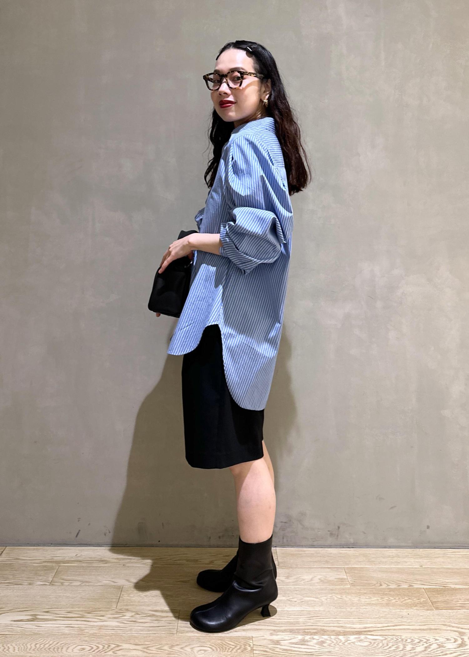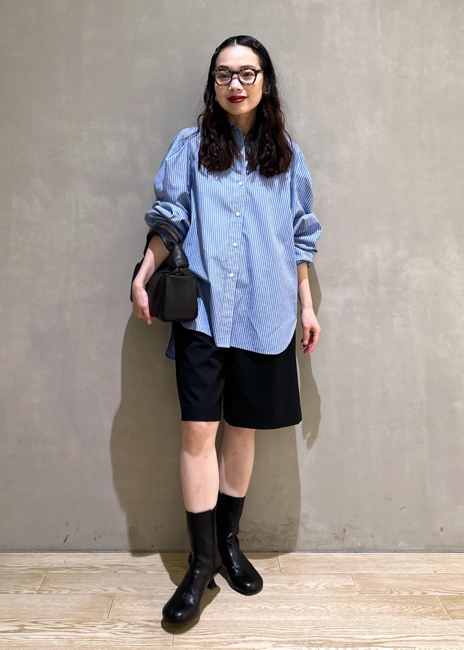 ハーフパンツにブーツと綺麗目なスタイルに。
