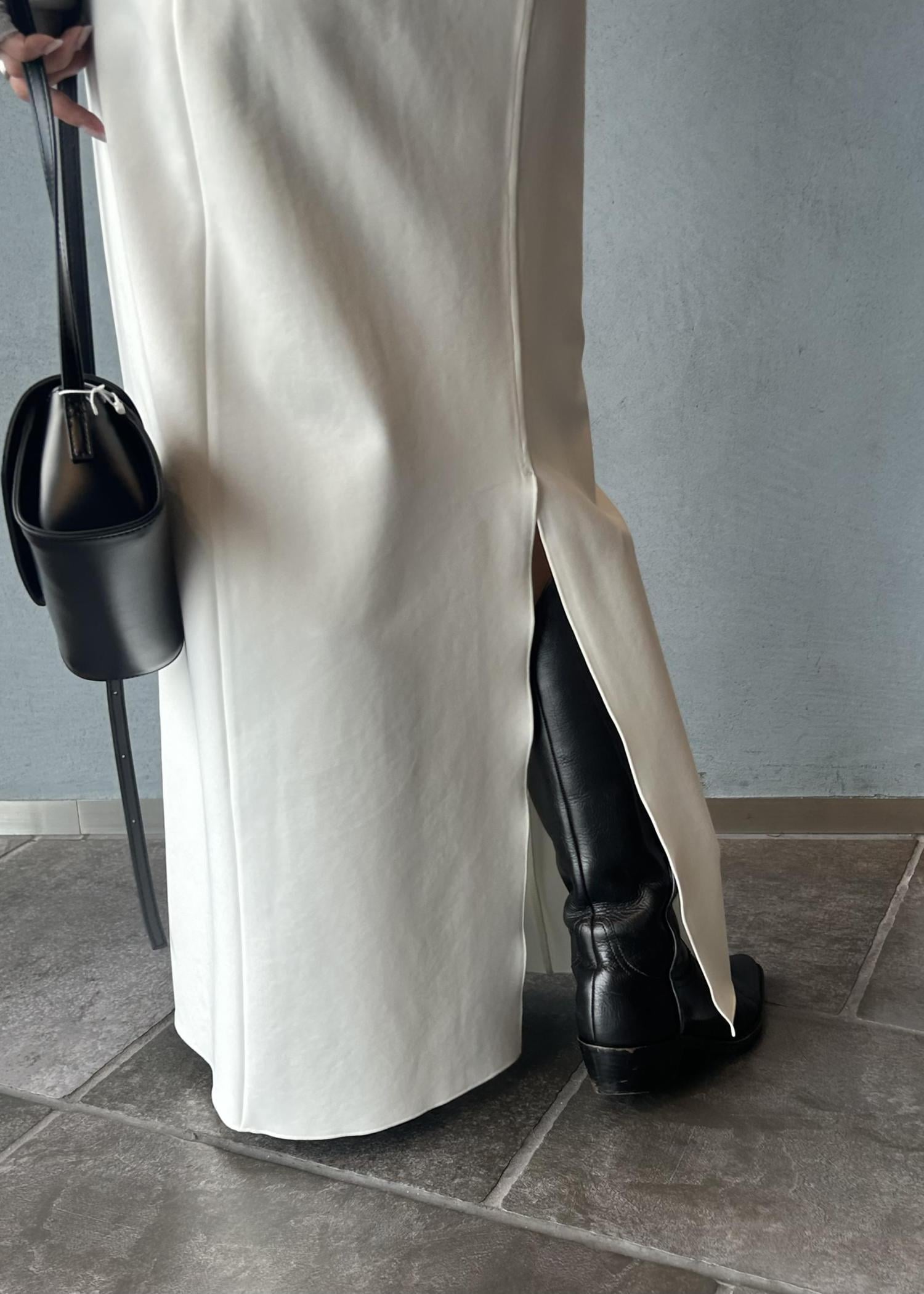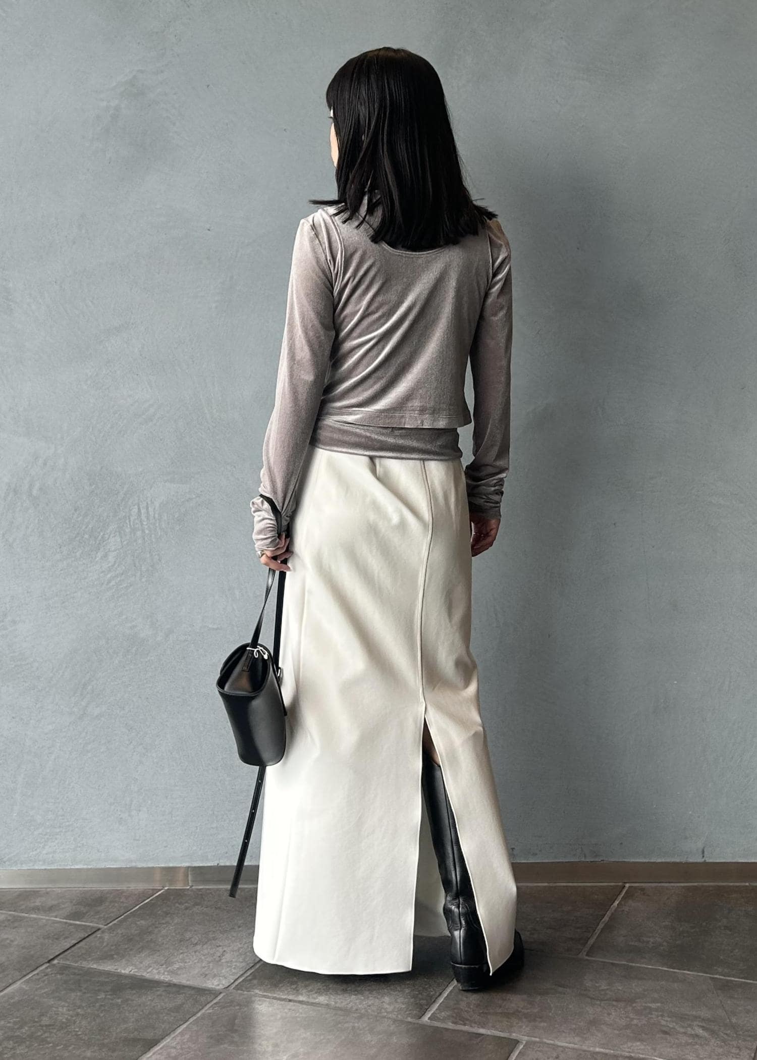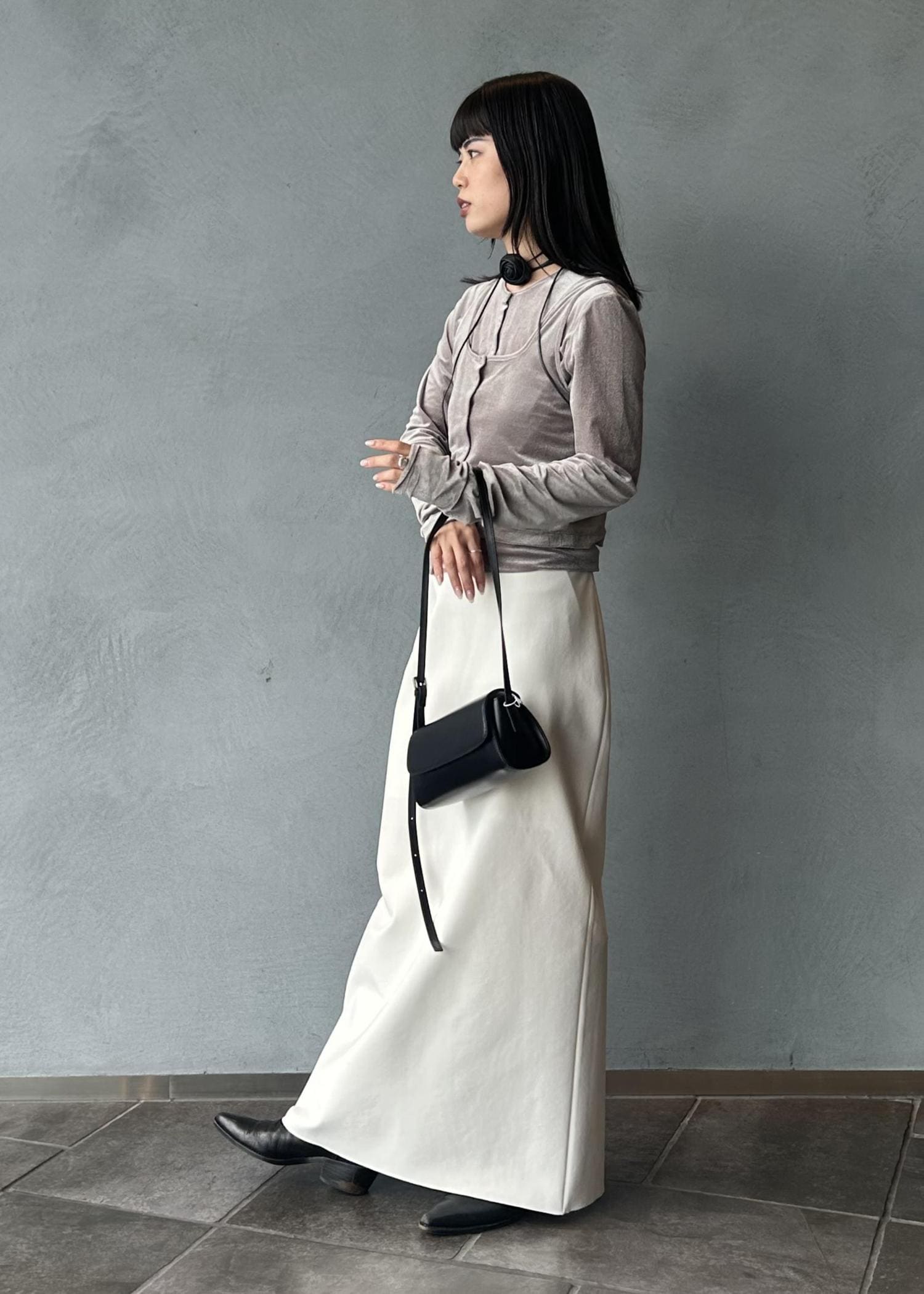 EMOELLE【EMOELLE】バックスリットIラインロングスカートホワイト / 36¥26,400レビュータイトなシルエットですが、ジャージのように伸縮性があるので着心地は楽です。深めのスリットで足さばきしやすく、ロングブーツなどをちら見せするのも素敵です。