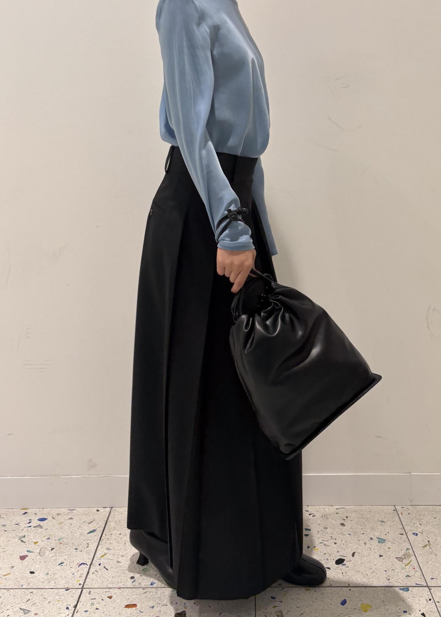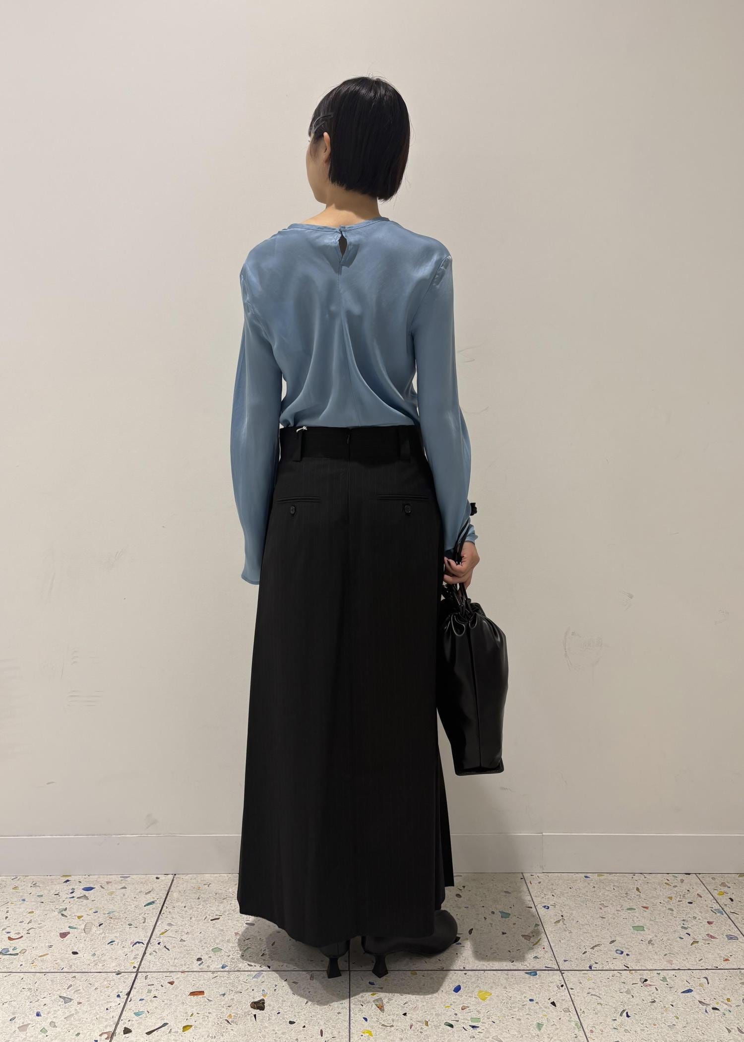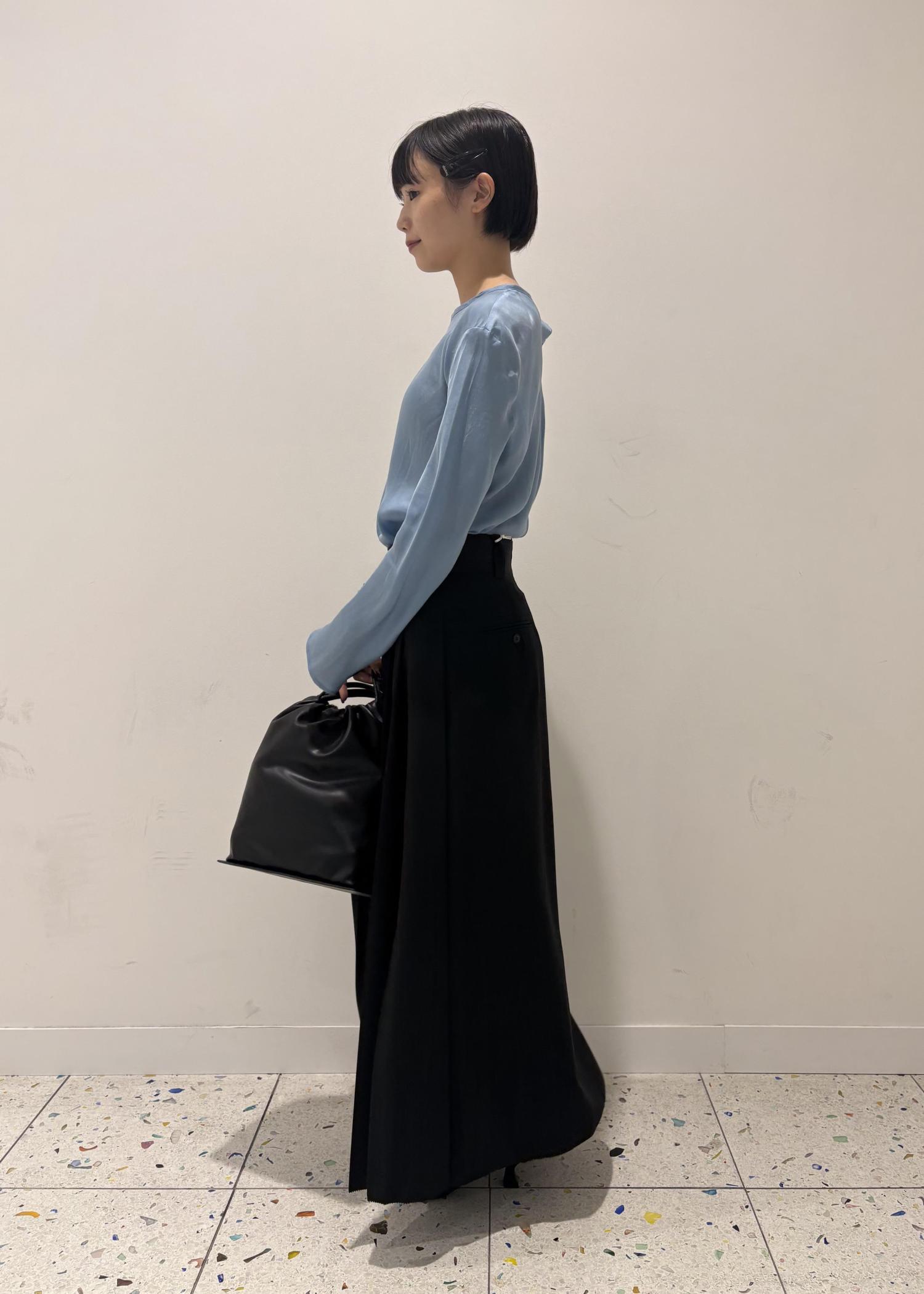 爽やかな印象のブルーのトップスに少しクールな印象にしたかった為EMOEELEのプリーツスカートでまとめました。