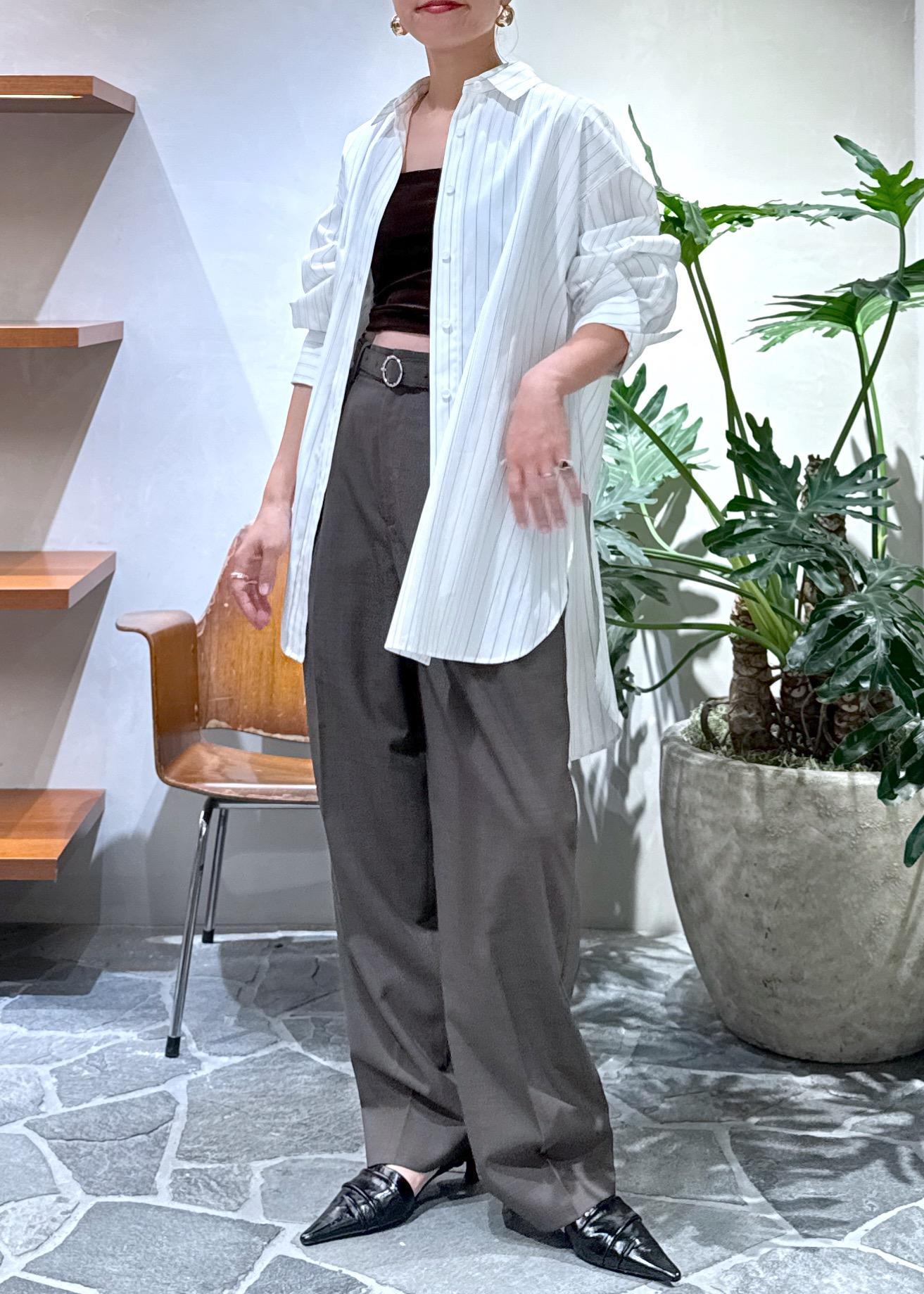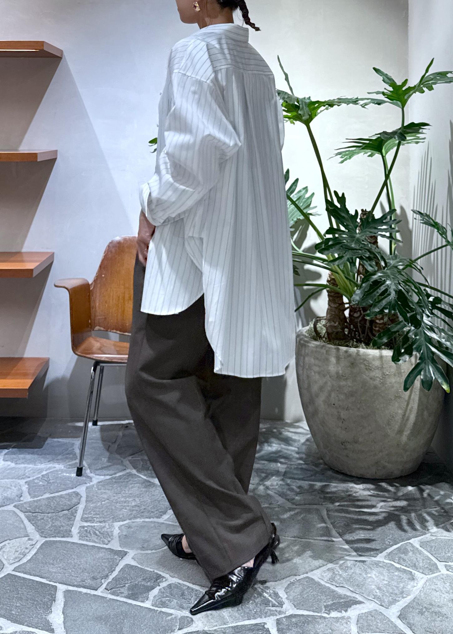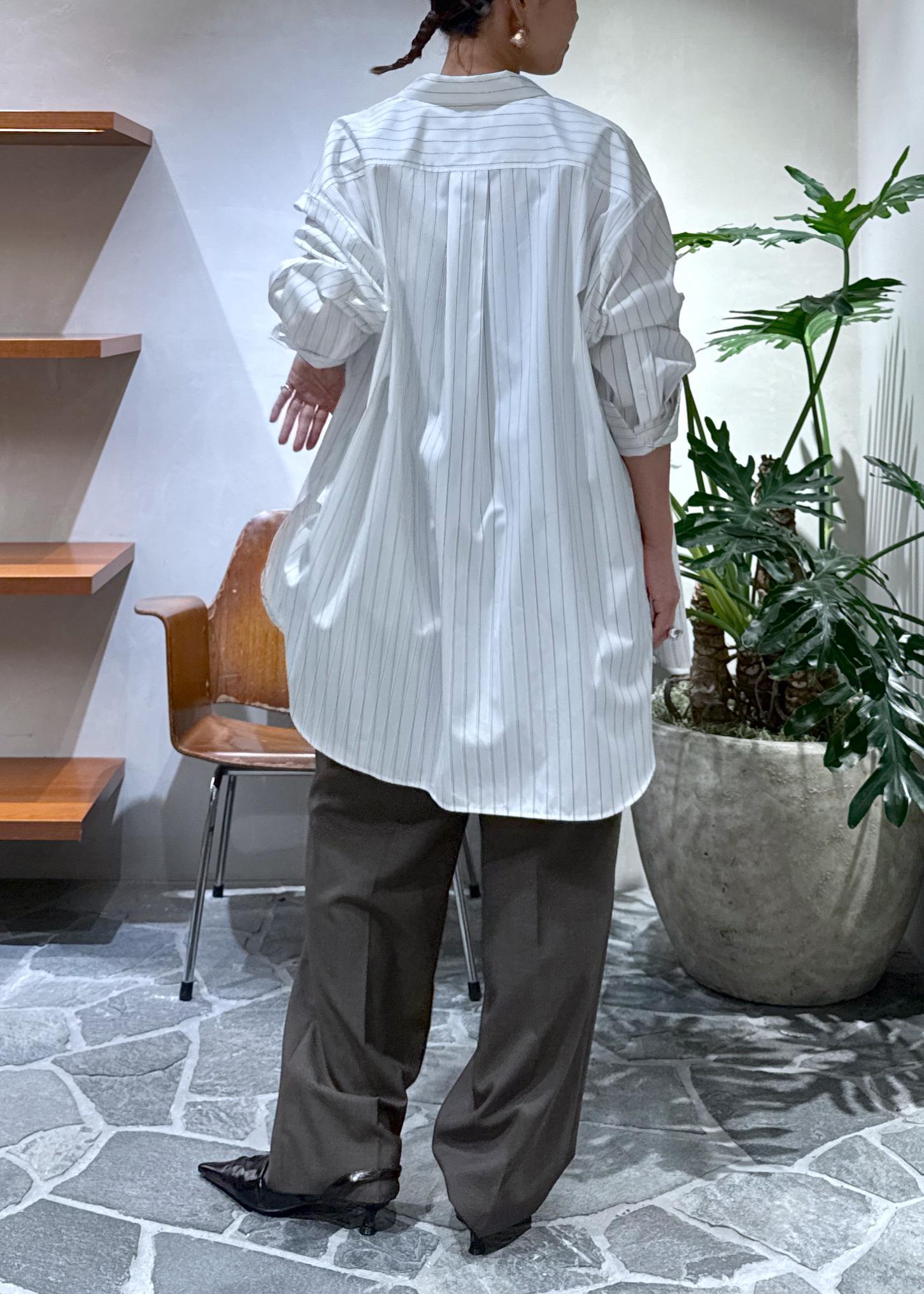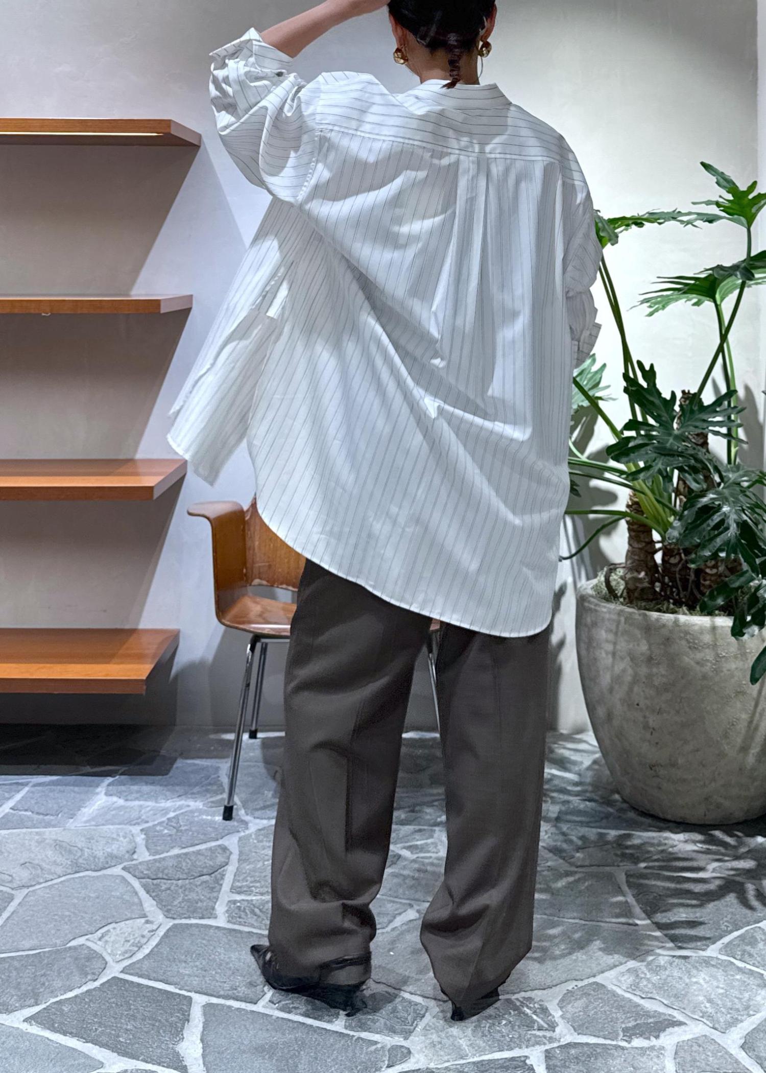 細いストライプ柄で、ワイドシルエットが可愛いシャツ。